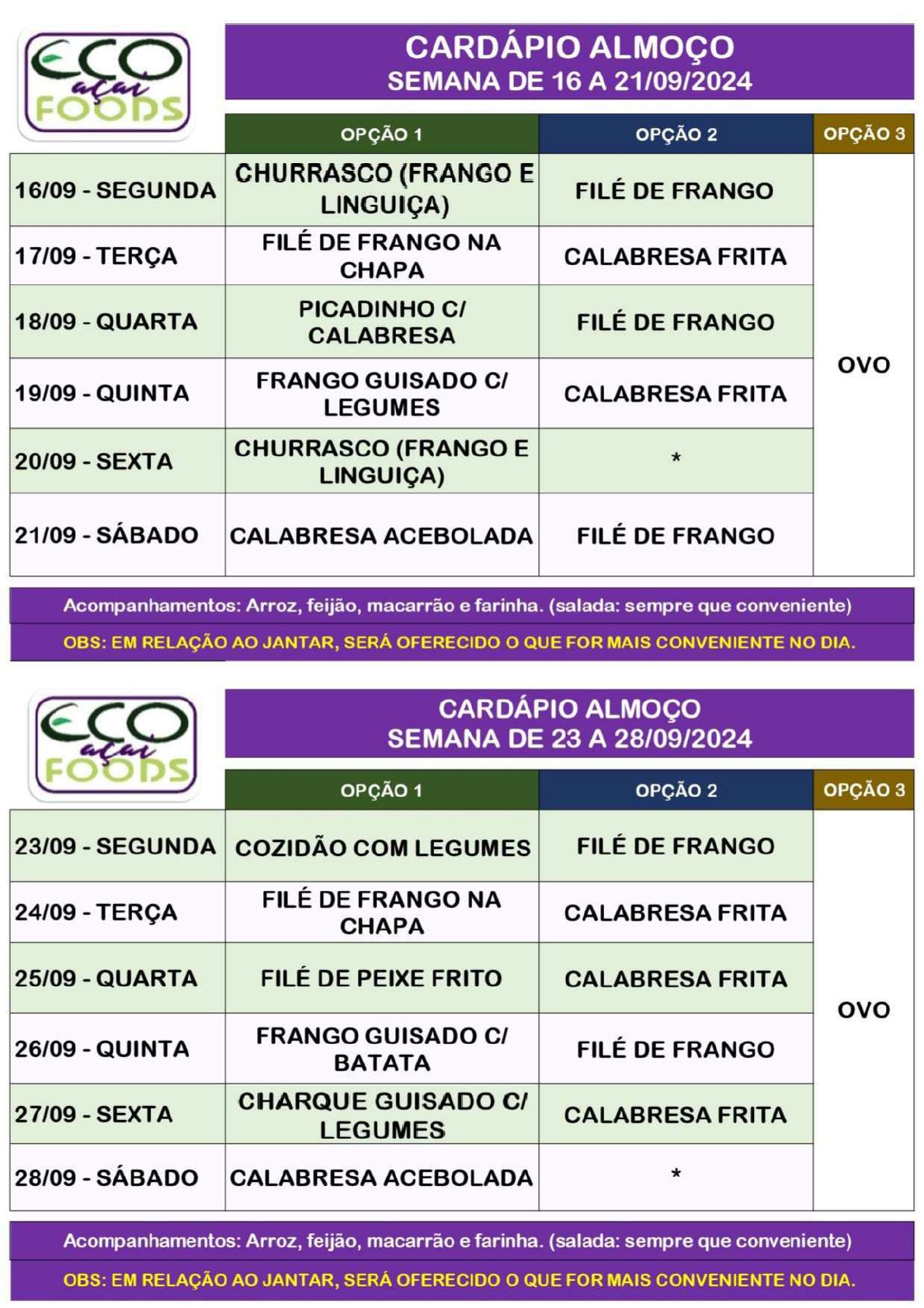 <p>ECO CARDÁPIO ALMOÇO SEMANA DE 16 A 21/09/2024 FOODS OPÇÃO 1 OPÇÃO 2 OPÇÃO 3 CHURRASCO (FRANGO E 16/09 - SEGUNDA FILÉ DE FRANGO LINGUIÇA) FILÉ DE FRANGO NA 17/09 - TERÇA CALABRESA FRITA CHAPA PICADINHO C/ 18/09 - QUARTA FILÉ DE FRANGO CALABRESA ovo FRANGO GUISADO C/ 19/09 - QUINTA CALABRESA FRITA LEGUMES CHURRASCO (FRANGO E 20/09 - SEXTA * LINGUIÇA) 21/09 - SÁBADO CALABRESA ACEBOLADA FILÉ DE FRANGO Acompanhamentos: Arroz, feijão, macarrão e farinha. (salada: sempre que conveniente) OBS: EM RELAÇÃO AO JANTAR, SERÁ OFERECIDO QUE FOR MAIS CONVENIENTE NO DIA. ECO CARDÁPIO ALMOÇO SEMANA DE 23 A 28/09/2024 FOODS OPÇÃO 1 OPÇÃO 2 OPÇÃO 3 23/09 - SEGUNDA COZIDÃO COM LEGUMES FILÉ DE FRANGO FILÉ DE FRANGO NA 24/09 - TERÇA CALABRESA FRITA CHAPA 25/09 - QUARTA FILÉ DE PEIXE FRITO CALABRESA FRITA ovo FRANGO GUISADO C/ 26/09 - QUINTA FILÉ DE FRANGO BATATA CHARQUE GUISADO C/ 27/09 - SEXTA CALABRESA FRITA LEGUMES 28/09 - SÁBADO CALABRESA ACEBOLADA * Acompanhamentos: Arroz, feijão, macarrão e farinha. (salada: sempre que conveniente) OBS: EM RELAÇÃO AO JANTAR, SERÁ OFERECIDO QUE FOR MAIS CONVENIENTE NO DIA.</p>