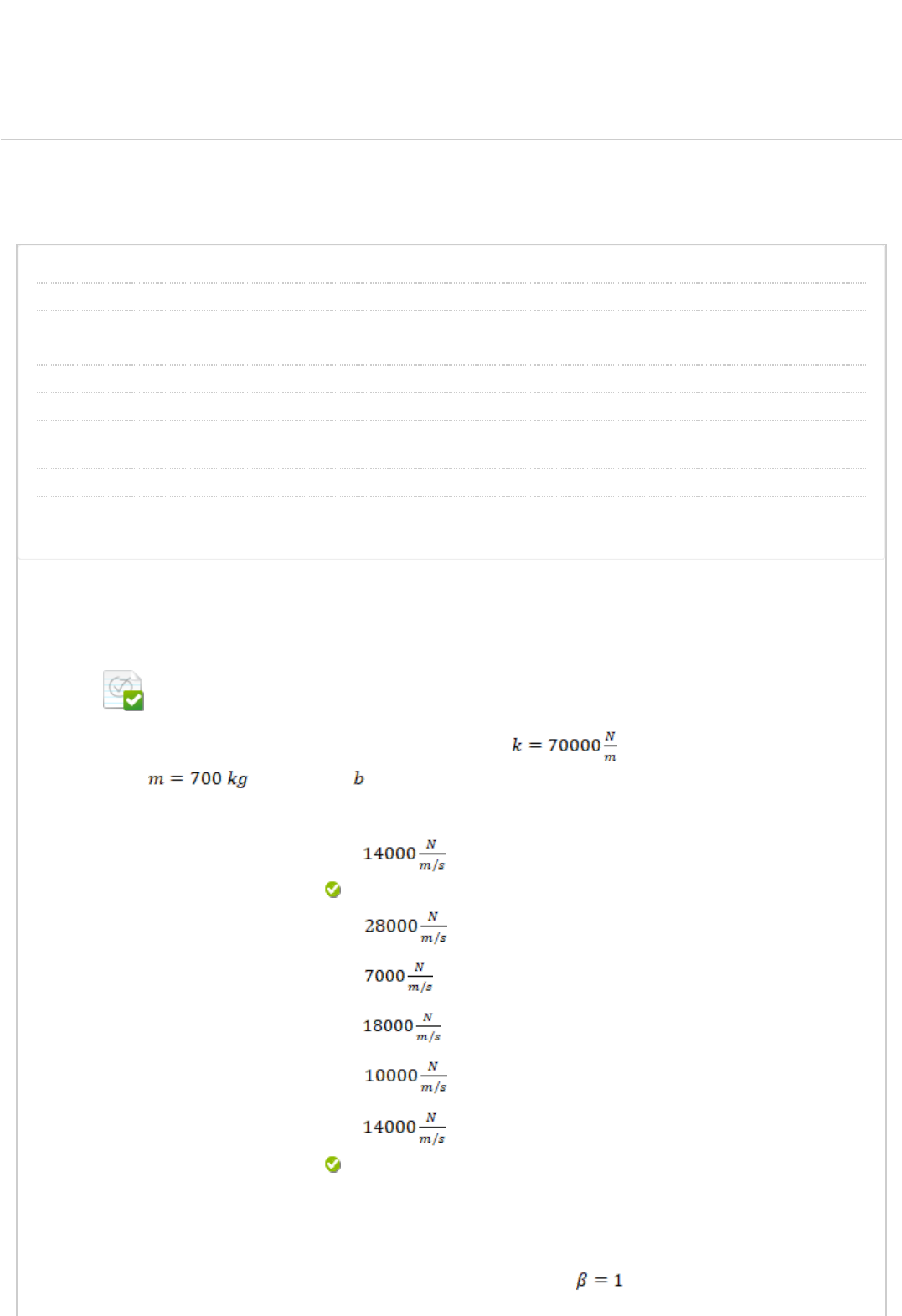 <p>Revisar envio do teste: QUESTIONÁRIO UNIDADE I</p><p>COMPLEMENTOS DE FÍSICA 7793-60_45301_D_20231 CONTEÚDO</p><p>Usuário valdemir.santos5 @aluno.unip.br</p><p>Curso COMPLEMENTOS DE FÍSICA</p><p>Teste QUESTIONÁRIO UNIDADE I</p><p>Iniciado 06/03/23 18:01</p><p>Enviado 06/03/23 18:01</p><p>Status Completada</p><p>Resultado da</p><p>tentativa</p><p>3 em 3 pontos</p><p>Tempo decorrido 0 minuto</p><p>Resultados exibidos Todas as respostas, Respostas enviadas, Respostas corretas, Comentários, Perguntas</p><p>respondidas incorretamente</p><p>Pergunta 1</p><p>Resposta Selecionada:</p><p>e.</p><p>Respostas:</p><p>a.</p><p>b.</p><p>c.</p><p>d.</p><p>e.</p><p>Comentário da</p><p>resposta:</p><p>O recuo de um canhão faz-se sob efeito de um amortecedor a óleo e de um sistema de</p><p>molas. A constante elástica do sistema de molas é . A massa do cano é</p><p>. O coe�ciente de resistência viscosa, para que o cano volte a posição de</p><p>equilíbrio o mais depressa possível, sem entrar em oscilação, vale:</p><p>Resposta: E</p><p>Comentário: para a condição de retorno para a posição de equilíbrio</p><p>no menor tempo possível sem entrar em oscilação o grau de</p><p>amortecimento deve ser crítico, ou seja, .</p><p>CONTEÚDOS ACADÊMICOS BIBLIOTECAS MURAL DO ALUNO TUTORIAISUNIP EAD</p><p>0,3 em 0,3 pontos</p><p>http://company.blackboard.com/</p><p>https://ava.ead.unip.br/webapps/blackboard/execute/courseMain?course_id=_275979_1</p><p>https://ava.ead.unip.br/webapps/blackboard/content/listContent.jsp?course_id=_275979_1&content_id=_3279246_1&mode=reset</p><p>https://ava.ead.unip.br/webapps/portal/execute/tabs/tabAction?tab_tab_group_id=_25_1</p><p>https://ava.ead.unip.br/webapps/portal/execute/tabs/tabAction?tab_tab_group_id=_27_1</p><p>https://ava.ead.unip.br/webapps/portal/execute/tabs/tabAction?tab_tab_group_id=_47_1</p><p>https://ava.ead.unip.br/webapps/portal/execute/tabs/tabAction?tab_tab_group_id=_29_1</p><p>https://ava.ead.unip.br/webapps/portal/execute/tabs/tabAction?tab_tab_group_id=_10_1</p><p>https://ava.ead.unip.br/webapps/login/?action=logout</p><p>Pergunta 2</p><p>Resposta Selecionada:</p><p>d.</p><p>Respostas:</p><p>a.</p><p>b.</p><p>c.</p><p>d.</p><p>e.</p><p>Comentário da</p><p>resposta:</p><p>Um corpo de massa , ligado a uma mola de constante elástica e</p><p>a um amortecedor de coe�ciente de resistência viscosa , executa oscilações</p><p>amortecidas. No instante , a posição do corpo vale e a fase inicial é</p><p>, sua equação de movimento é:</p><p>Resposta: D</p><p>Comentário:</p><p>Pergunta 3</p><p>Um corpo de massa está ligado a uma mola de constante elástica e a um</p><p>amortecedor de coe�ciente de resistência viscosa . O grau de amortecimento é</p><p>. A massa do corpo vale, aproximadamente:</p><p>0,3 em 0,3 pontos</p><p>0,3 em 0,3 pontos</p><p>Resposta Selecionada:</p><p>a.</p><p>Respostas:</p><p>a.</p><p>b.</p><p>c.</p><p>d.</p><p>e.</p><p>Comentário da</p><p>resposta:</p><p>Resposta: A</p><p>Comentário:</p><p>Pergunta 4</p><p>Resposta Selecionada:</p><p>c.</p><p>Respostas:</p><p>a.</p><p>b.</p><p>c.</p><p>d.</p><p>e.</p><p>Comentário da</p><p>resposta:</p><p>Um corpo de massa está ligado a uma mola de constante elástica</p><p>e oscila verticalmente em torno de sua posição de equilíbrio com amplitude .</p><p>O campo de gravidade é . No instante inicial , a posição do corpo é</p><p>. A velocidade inicial do corpo vale:</p><p>Resposta: C</p><p>Comentário: a energia mecânica do corpo é ,</p><p>, ,</p><p>,</p><p>0,3 em 0,3 pontos</p><p>Pergunta 5</p><p>Resposta Selecionada:</p><p>b.</p><p>Respostas:</p><p>a.</p><p>b.</p><p>c.</p><p>d.</p><p>e.</p><p>Comentário da</p><p>resposta:</p><p>Um movimento de um corpo ligado a uma mola e a um amortecedor segue a lei</p><p>SI</p><p>A posição do corpo no instante vale:</p><p>Resposta: B</p><p>Comentário: aplicando-se a equação horária vem:</p><p>Pergunta 6</p><p>Resposta Selecionada:</p><p>a.</p><p>Respostas:</p><p>a.</p><p>b.</p><p>c.</p><p>d.</p><p>Um pêndulo simples oscila em um campo de gravidade , sua equação horária</p><p>angular segue a equação . O módulo da velocidade angular</p><p>máxima do pêndulo vale, aproximadamente:</p><p>0,3 em 0,3 pontos</p><p>0,3 em 0,3 pontos</p><p>e.</p><p>Comentário da</p><p>resposta:</p><p>Resposta: C</p><p>Comentário: a velocidade angular é</p><p>, logo, a velocidade angular máxima</p><p>em módulo é .</p><p>Pergunta 7</p><p>Resposta Selecionada:</p><p>c.</p><p>Respostas:</p><p>a.</p><p>b.</p><p>c.</p><p>d.</p><p>e.</p><p>Uma partícula de massa pende de uma mola de constante elástica</p><p>e, ao mover-se, �ca sujeita a uma resistência viscosa de coe�ciente . A</p><p>partícula é lançada no instante com velocidade a uma distância</p><p>de sua posição de equilíbrio. A posição da partícula no instante</p><p>vale, aproximadamente:</p><p>Comentário:</p><p>Pergunta 8</p><p>0,3 em 0,3 pontos</p><p>0,3 em 0,3 pontos</p><p>Resposta Selecionada: a.</p><p>Respostas: a.</p><p>b.</p><p>c.</p><p>d.</p><p>e.</p><p>Comentário da resposta:</p><p>Uma partícula executa movimento harmônico simples segundo a equação:</p><p>, sua posição no instante vale, aproximadamente:</p><p>Resposta: A</p><p>Comentário: no instante , a posição da partícula é:</p><p>Pergunta 9</p><p>Resposta Selecionada:</p><p>b.</p><p>Respostas: a.</p><p>b.</p><p>c.</p><p>d.</p><p>e.</p><p>Comentário da</p><p>resposta:</p><p>Uma partícula executa movimento harmônico simples segundo a equação:</p><p>, sua velocidade no instante vale:</p><p>0, 28</p><p>m</p><p>s</p><p>0, 28</p><p>m</p><p>s</p><p>Resposta: B</p><p>Comentário: a equação de velocidade é</p><p>v =</p><p>dy</p><p>dt</p><p>v = − 0.06 . 3π . sen( 3πt+</p><p>π</p><p>3</p><p>)</p><p>v= − 0.18π . sen( πt+</p><p>π</p><p>3</p><p>) , fazendo t =</p><p>1</p><p>2</p><p>s vem v= − 0.18π . sen( 3π</p><p>1</p><p>2</p><p>+</p><p>π</p><p>3</p><p>,</p><p>v= − 0.18π . se