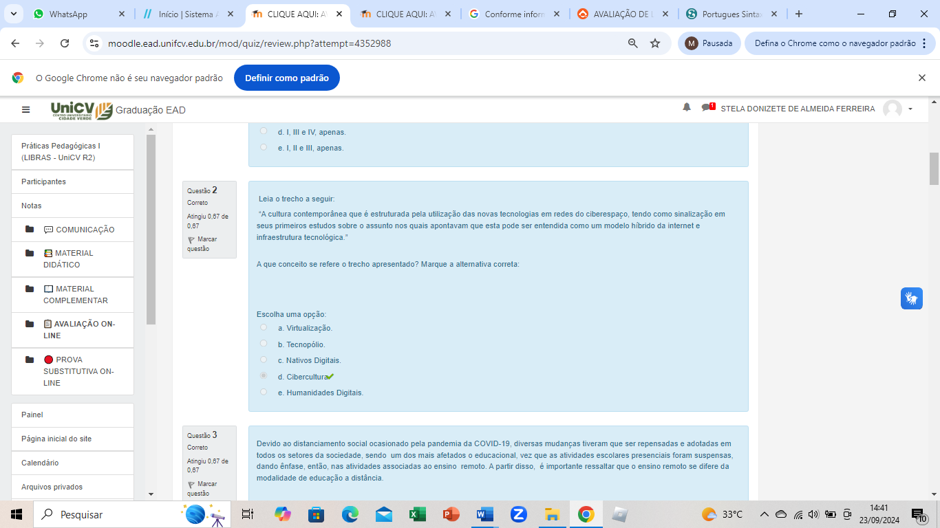 <p>WhatsApp // Início Sistema / CLIQUE AQUI: A CLIQUE AQUI: A G Conforme inform AVALIAÇÃO DE 2 Sinta: + - X moodle.ead.unifcv.edu.br/mod/quiz/review.php?attempt=4352988 M Pausada Defina Chrome como navegador padrão : Google Chrome não é seu navegador padrão Definir como padrão X Graduação EAD STELA DONIZETE DE ALMEIDA FERREIRA d. I. III e IV. apenas Práticas Pedagógicas e. II e III. (LIBRAS UniCV R2) Participantes Questão 2 Notas Correto Leia trecho a Atingiu 0.67 de "A cultura que é estruturada pela utilização das novas tecnologias em redes do tendo como sinalização em COMUNICAÇÃO 0.67 seus primeiros estudos sobre assunto nos quais apontavam que esta pode ser entendida como um modelo hibrido da internet e Marcar infraestrutura questão MATERIAL DIDÁTICO A que conceito se refere 0 trecho apresentado? Marque a alternativa correta: MATERIAL COMPLEMENTAR Escolha uma AVALIAÇÃO a LINE Tecnopólio PROVA Nativos Digitais SUBSTITUTIVA ON- Cibercultura LINE e Humanidades Digitais Painel Página inicial do site Questão 3 Correto Devido ao distanciamento social ocasionado pela pandemia da COVID-19 diversas mudanças tiveram que ser repensadas e adotadas em todos os setores da sendo um dos mais afetados vez que as atividades escolares presenciais foram Calendário Atingiu de 0.67 dando ênfase então. nas atividades associadas ao ensino A partir é importante ressaltar que ensino remoto se difere da modalidade de educação a Arquivos privados Marcar questão 14:41 Pesquisar Z 33°C 23/09/2024 10</p>