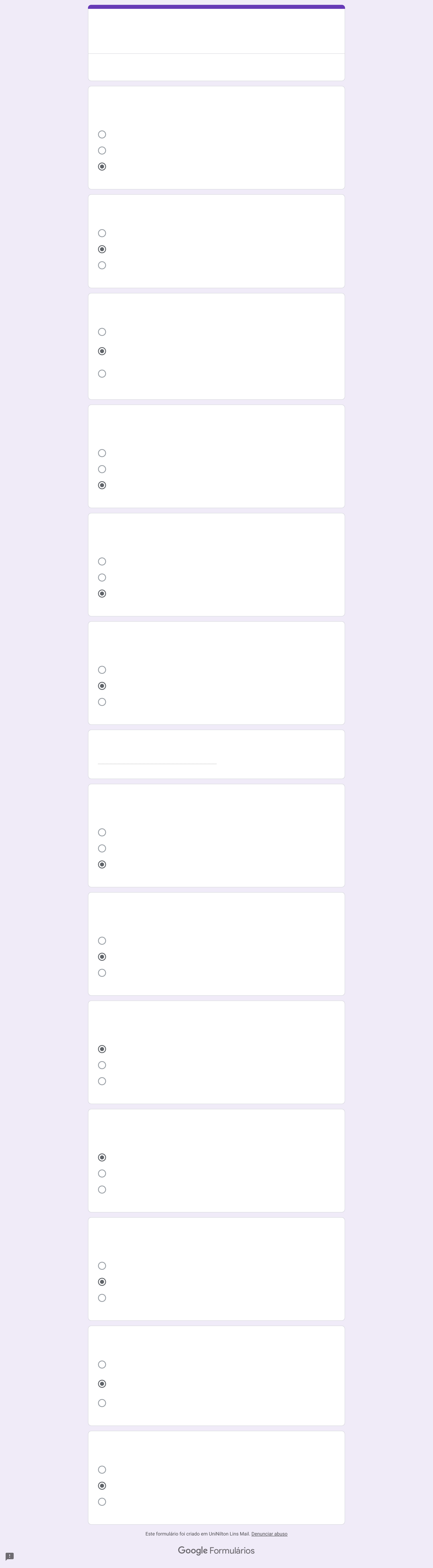 <p>Desintegração</p><p>Friabilidade</p><p>Dissolução</p><p>Veri3car se as unidades de um mesmo lote apresentam uniformidade de peso</p><p>Veri3car se a quantidade de princípio ativo (teor) é próxima da quantidade declarada</p><p>Veri3car homogeneidade no envase</p><p>Pesar individualmente as cápsulas e calcular o peso m��dio</p><p>Medir individualmente a diferença do peso das cápsulas cheias e vazias e calcular o</p><p>peso médio</p><p>Remover individualmente o conteúdo das cápsulas, pesar o conteúdo e calcular o</p><p>peso médio</p><p>Teste que avalia medicamentos que sejam de dose mais altas (>25 mg)</p><p>Determinado a partir de um pool de amostras</p><p>Determinado a partir do doseamento individual de cada amostra</p><p>Desintegração</p><p>Dureza</p><p>Friabilidade</p><p>Dissolução</p><p>Desintegração</p><p>Teor</p><p>Carlos Klinger</p><p>Peso médio</p><p>Uniformidade de dose</p><p>Friabilidade</p><p>Teste que avalia medicamentos que sejam de dose mais baixas (<25 mg)</p><p>Determinado a partir de um pool de amostras</p><p>Determinado a partir do doseamento individual de cada amostra</p><p>Dureza</p><p>Friabilidade</p><p>Desintegração</p><p>Menor que 5%</p><p>Maior que 5%</p><p>Quanto mais próximo de 1 melhor</p><p>Desintegrar completamente</p><p>Se manter íntegro e não desintegrar</p><p>Se desintegrar parcialmente</p><p>Média dos pesos individuais das amostras analisadas</p><p>Quantidade de um determinado componente ativo ou ingrediente em uma</p><p>substância ou preparação</p><p>Grau de resistência mecânica de um comprimido</p><p>Frasco de xarope</p><p>Blíster com comprimidos</p><p>Bisnaga de pomada</p><p>Este formulário foi criado em UniNilton Lins Mail. Denunciar abuso</p><p>LFA 071 Questões Aula 9 - CQ de Formas</p><p>Farmacêuticas Sólidas</p><p>O e-mail do participante (carlos.serrao@uniniltonlins.edu.br) foi registrado durante o envio</p><p>deste formulário.</p><p>Teste que possibilita determinar a quantidade de substância ativa dissolvida no</p><p>meio avaliado.</p><p>*</p><p>Objetivo principal do teste de uniformidade de dose *</p><p>Para o teste do peso médio em cápsulas, deve-se *</p><p>Uniformidade de conteúdo (UC) é um método para avaliar a uniformidade de</p><p>dose que se caracteriza por ser</p><p>*</p><p>Teste que determina a resistência dos comprimidos à abrasão, quando</p><p>submetidos à ação mecânica</p><p>*</p><p>Teste que permite verificar se comprimidos e cápsulas se desintegram dentro do</p><p>limite de tempo especificado, em um líquido apropriado.</p><p>*</p><p>Nome e Sobrenome e Turma. Ex.: Carlos Klinger LFA 091 *</p><p>Testes de controle de qualidade aplicados a TODAS as formas farmacêuticas</p><p>sólidas, EXCETO:</p><p>*</p><p>Variação de peso (VP) é um método para avaliar a uniformidade de dose que se</p><p>caracteriza por ser</p><p>*</p><p>Teste que avalia a resistência mecânica de um comprimido submetido ao</p><p>esmagamento ou ruptura sob pressão radial</p><p>*</p><p>Coeficiente de variação é uma medida estatística útil como critério de aprovação</p><p>e deve possuir valor:</p><p>*</p><p>Para um teste de desintegração utilizando um líquido com pH ácido, um</p><p>comprimido de liberação retardada deve</p><p>*</p><p>O teor de um forma farmacêutica expressa: *</p><p>Exemplo de forma de apresentação de dose unitária *</p><p>Formulários</p><p>https://docs.google.com/forms/u/0/d/e/1FAIpQLSeG2gPgjLCNkIZOwsy9Xm146BMmURQa12vM1tzp1Vkdgs3aQw/reportabuse?source=https://docs.google.com/forms/d/e/1FAIpQLSeG2gPgjLCNkIZOwsy9Xm146BMmURQa12vM1tzp1Vkdgs3aQw/viewform?vc%3D0%26c%3D0%26w%3D1%26flr%3D0%26viewscore%3DAE0zAgCgO5RmvxTuVm498JWhb7ooM-xU7dehS-5KGfJY9q5UwCNF_H7U9WMiginoJg%26urp%3Dgmail_link</p>