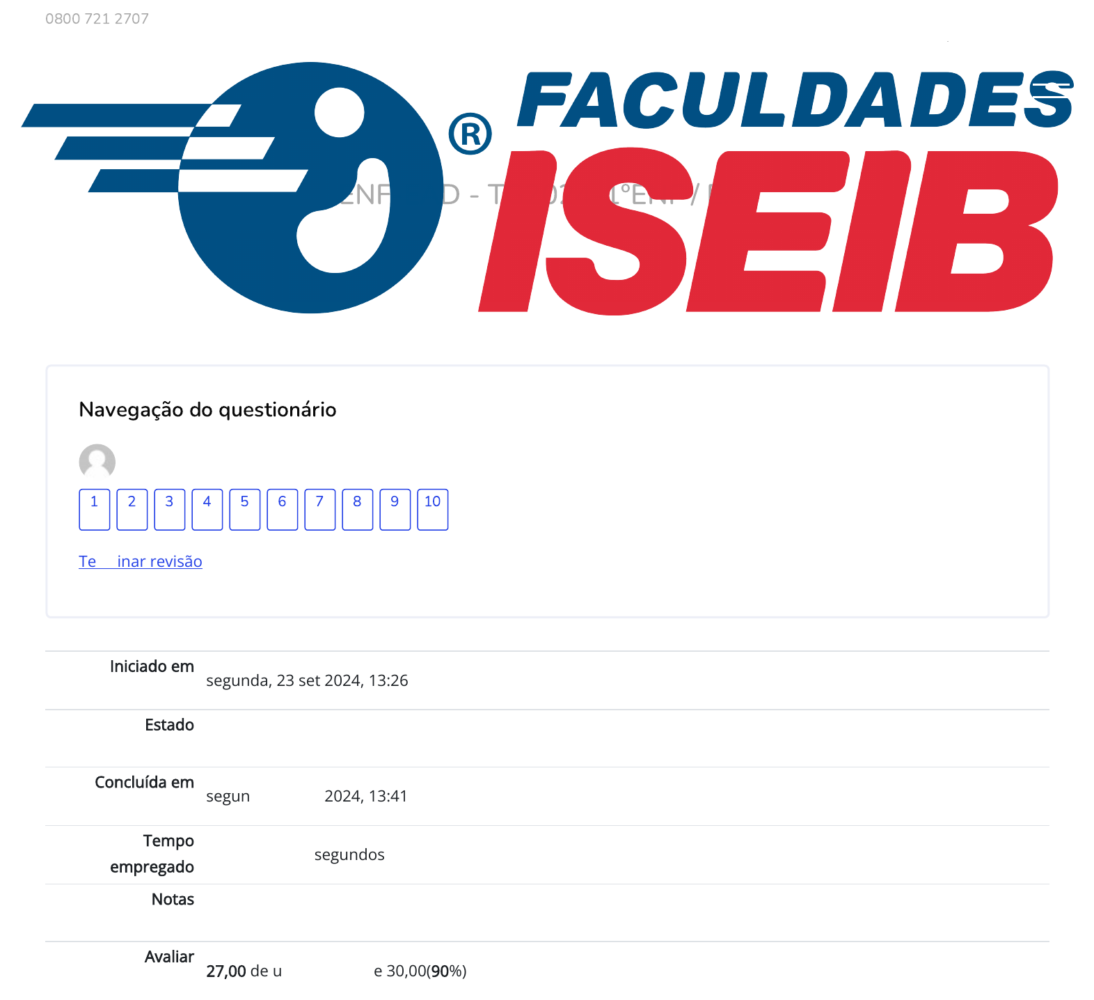 <p>ENF-EAD - TG2024-1ºENF / E…</p><p>Iniciado em</p><p>segunda, 23 set 2024, 13:26</p><p>Estado</p><p>Finalizada</p><p>Concluída em</p><p>segunda, 23 set 2024, 13:41</p><p>Tempo</p><p>empregado</p><p>14 minutos 23 segundos</p><p>Notas</p><p>9,00/10,00</p><p>Avaliar</p><p>27,00 de um máximo de 30,00(90%)</p><p>Navegação do questionário</p><p>Maria Luciene Rodrigues</p><p>Terminar revisão</p><p>1 2 3 4 5 6 7 8 9 10</p><p>0800 721 2707</p><p> Área do Aluno</p><p>https://iseibvirtual.com.br/user/view.php?id=9993350&course=24186</p><p>https://iseibvirtual.com.br/mod/quiz/view.php?id=176158</p><p>tel:0800 721 2707</p><p>https://iseib.mentorweb.ws/</p><p>https://iseibvirtual.com.br/</p><p>QUESTÃO</p><p>Correto</p><p>Atingiu 1,00 de 1,00</p><p>QUESTÃO</p><p>Correto</p><p>Atingiu 1,00 de 1,00</p><p>1</p><p>A formação inicial em enfermagem tem um papel essencial no desenvolvimento de competências para ação</p><p>educativa. As Diretrizes Curriculares Nacionais (DCNs), em vigor desde 2001, rea�rmam a necessidade e o</p><p>dever das Instituições de Ensino Superior de formar pro�ssionais de saúde para o SUS, com a �nalidade de</p><p>adequar a formação em saúde às necessidades de saúde da população brasileira (Leonelo, 2007). Nesse</p><p>contexto da educação, o caráter autoritário e coercitivo tem se mostrado ine�ciente para atender às</p><p>necessidades de cuidado à saúde de indivíduos, famílias e grupos sociais pois:</p><p>a. Nenhuma das a�rmativas anteriores está correta</p><p>b. A formação em enfermagem atua no desenvolvimento de competências para ação educativa de acordo com as</p><p>Diretrizes Curriculares Nacionais (DCNs), que propõem um ensino tradicional e verticalizado, livre de diálogos e</p><p>discussões</p><p>c. O caráter autoritário e coercitivo tem se mostrado e�ciente para atender às necessidades de cuidado à saúde de</p><p>indivíduos, famílias e grupos sociais pois obriga o indivíduo a seguir as determinações de saúde.</p><p>d. Não levam em conta a determinação social do processo saúde-doença e não estão orientadas para promover a</p><p>participação dos sujeitos sociais no enfrentamento de suas necessidades e seus problemas de saúde</p><p></p><p>2</p><p>A saúde deve ser vista por completo e o enfermeiro deve participar de diversas abordagens para a saúde.</p><p>Nesse contexto inclui-se a dimensão do ensino, que permite a perpetuação do modelo estruturado e cientí�co</p><p>que embasa os preceitos da enfermagem.</p><p>Com relação às competências na dimensão ensino, escolha a alternativa que represente a correta</p><p>a. Desenvolver, participar e aplicar pesquisas e/ou outras formas de produção de conhecimento que objetivem a</p><p>quali�cação da prática pro�ssional.</p><p>b. Atuar nas áreas humanas e exatas articulando o ensino nacional das séries iniciais</p><p>c. Planejar, implementar e participar dos programas de formação e quali�cação contínua dos trabalhadores de</p><p>enfermagem e de saúde.</p><p></p><p>d. Implementar e reorganizar os planos de educação nacional segundo seus critérios e sua boa índole</p><p>QUESTÃO</p><p>Correto</p><p>Atingiu 1,00 de 1,00</p><p>QUESTÃO</p><p>Incorreto</p><p>Atingiu 0,00 de 1,00</p><p>3</p><p>A Lei 7.498/1986, que Dispõe sobre a regulamentação do exercício da Enfermagem garante que:</p><p>1. A Enfermagem e suas atividades Auxiliares podem ser exercidas por pessoas livremente habilitadas, mesmo</p><p>as que ainda não estão inscritas no Conselho Regional de Enfermagem, mas garantem fazê-lo dentro do</p><p>período de 01 (um) ano.</p><p>2. A Enfermagem e suas atividades Auxiliares somente podem ser exercidas por pessoas legalmente</p><p>habilitadas e inscritas no Conselho Regional de Enfermagem com jurisdição na área onde ocorre o exercício.</p><p>3. A Enfermagem é exercida privativamente pelo Enfermeiro, pelo Técnico de Enfermagem, pelo Auxiliar de</p><p>Enfermagem e pela Parteira, respeitados os respectivos graus de habilitação.</p><p>4. Nenhuma das a�rmativas anteriores está correta</p><p>Assinale a opção correta</p><p>a. 1 e 3 estão corretas</p><p>b. Apenas a 1 está correta</p><p>c. 1, 2 e 3 estão corretas</p><p>d. 2 e 3 estão corretas</p><p>4</p><p>De acordo com o autor de “A prática educativa realizada por enfermeiras no cotidiano da assistência tem</p><p>enfatizado a transmissão de informações e a mudança de comportamentos dos indivíduos”, sendo assim,</p><p>assinale a alternativa correta de acordo com a vinculação do modelo de assistência à saúde:</p><p>a. Atenção à saúde voltado para a doença, com ênfase no conhecimento empírico especializado.</p><p>b. Atenção à saúde voltado para a doença, com ênfase no conhecimento técnico-cientí�co especializado.</p><p>c. Atenção à saúde voltado para a doença, sem ênfase no conhecimento técnico-cientí�co especializado.</p><p>d. Atenção à saúde voltado para a saúde, com ênfase no conhecimento técnico-cientí�co especializado. </p><p>QUESTÃO</p><p>Correto</p><p>Atingiu 1,00 de 1,00</p><p>QUESTÃO</p><p>Correto</p><p>Atingiu 1,00 de 1,00</p><p>5</p><p>A DECLARAÇÃO UNIVERSAL DE DIREITOS HUMANOS nos coloca em seu Artigo 2º que - Toda pessoa tem</p><p>capacidade para gozar os direitos e as liberdades estabelecidas nesta Declaração, sem distinção de qualquer</p><p>espécie, seja de raça, cor, sexo, língua, religião, opinião política ou de outra natureza, origem nacional ou social,</p><p>riqueza, nascimento, ou qualquer outra condição. Diante do exposto podemos pensar a respeito do exercício</p><p>pro�ssional do enfermeiro no tocante à questão do respeito à pessoa humana. A enfermagem é regulada por</p><p>sua legislação que é válida em todo o território nacional. Escolha a alternativa que contemple um dever</p><p>pro�ssional relacionado a esse contexto do respeito humano:</p><p>a. Tratar o paciente