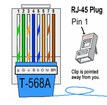 <p>12345678 RJ-45 Plug Pin 1 G BR Clip is pointed away from you. T-568A</p>