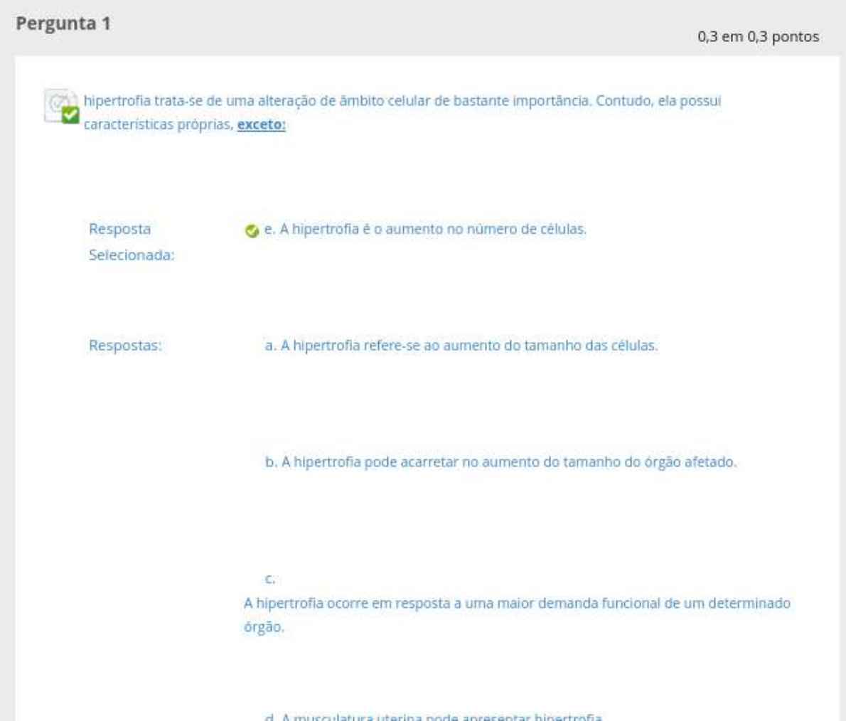 <p>Pergunta 1 0,3 em 0,3 pontos hipertrofia trata-se de uma alteração de celular de bastante Contudo, ela possui próprias, exceto: Resposta e. A hipertrofia é o aumento no número de Selecionada: Respostas: a. A hipertrofia refere-se ao aumento do tamanho das células. b. A hipertrofia pode acarretar no aumento do tamanho do órgão afetado. A hipertrofia ocorre em resposta a uma maior demanda funcional de um determinado</p><p>Pergunta 2 0,3 em 0,3 pontos Caracteriza-se por um crescimento excessivo e descoordenado comparado aos tecidos normais adjacentes e que persiste mesmo depois da interrupção do estimulo que induziu a proliferação inicial". Sobre a definição acima, trata-se de: Resposta Selecionada: d. Respostas: a. b. Anaplasia. Hiperplasia. d. e. Hipertrofia. Comentário da Alternativa correta: D resposta: Justificativa: A neoplasia é uma patologia em que sua característica principal é o crescimento desordenado quando comparado a outros órgãos em funcionamento Pergunta 3 0,3 em 0,3 pontos As patologias vasculares podem ocorrer, prioritariamente, devido a: Contratilidade Hipertensão arterial.</p><p>As patologias vasculares podem ocorrer, prioritariamente, devido a: Contratilidade Hipertensão arterial. Estenose/obstrução da luz dos IV. Debilidade das paredes Está correto o que se afirma em: Resposta Selecionada: d. Está correto o que se afirma em III e Respostas: a. Todas as alternativas estão b. Todas as alternativas estão Está correto o que se afirma em e II. d. Está correto o que se afirma em III e IV. Está correto o que se afirma em II, e IV. Comentário da Alternativa correta: D resposta: A contratilidade cardiaca deficiente não leva à lesão vascular; a hipertensão arterial leva, como consequência, à lesão arterial de forma secundária e não Pergunta 4 0,3 em 0,3 pontos As fistulas são tratadas como anomalias vasculares congênitas. Analise as alternativas abaixo e assinale aquela que não está associada a essa patologia:</p><p>0,3 em 0,3 pontos As fistulas são tratadas como anomalias vasculares congênitas. Analise as alternativas abaixo e assinale aquela que não está associada a essa patologia: Resposta b. Ela ocorre somente por uma falha no desenvolvimento das artérias e Selecionada: Respostas: a. Ocorre a comunicação anormal entre sistema arterial e o sistema b. Ela ocorre somente por uma falha no das artérias e Sessões de hemodiálise podem levar ao aparecimento da fistula d. Quando as fistulas são grandes ou extensas podem fazer com que um volume exagerado de sangue retorne ao A pode levar ao agravo da falência Comentário da Alternativa correta: B resposta: As fistulas podem ocorrer por falha no desenvolvimento das artérias e veias, como também por procedimento Pergunta 5 0,3 em 0,3 pontos Alguns virus podem estimular a hiperplasia do epitélio que o infectam, além do aparecimento de Analise as assertivas abaixo e assinale a alternativa correta:</p><p>Pergunta 5 0,3 em 0,3 pontos Alguns virus podem estimular a hiperplasia do epitélio que o infectam, além do aparecimento de Analise as assertivas abaixo e assinale a alternativa correta: HPV sorotipo 6. HPV sorotipo 11. III. HPV sorotipo 16. IV. HPV sorotipo 18. Resposta Selecionada: d. Todas as alternativas estão Respostas: a. Está correto o que se afirma em I, III e IV. b. Está correto que se afirma em II, III e IV. Está correto o que se afirma em I, e IV. d. Todas as alternativas estão Todas as alternativas estão Comentário da Alternativa correta: D resposta: Os sorotipos que estão relacionados à hiperplasia e ao desenvolvimento de câncer são os HPV sororipo 6, 11, 16 e 18. Pergunta 6 0,3 em 0,3 pontos As quando podem sofrer alterações deve-se classificar esse tipo de</p><p>Pergunta 6 0,3 em pontos As células, quando lesionadas, podem sofrer alterações Contudo, deve-se classificar esse tipo de lesão, que pode Resposta Selecionada: b. Lesão celular necrose ou Respostas: a. Lesão celular necrose ou apoptose. b. Lesão celular necrose ou apoptose. C. Lesão celular irreversível e d. Lesão celular e e. Lesão celular irreversível e apoptose, Comentário da Alternativa correta: B resposta: Justificativa: As lesões celulares são compostas por uma lesão celular por necrose ou apoptose. Todos esses mecanismos, a depender do estimulo, levam à lesão das Pergunta 7 0,3 em 0,3 pontos Quais são os principais tipos de necrose que uma célula pode sofrer? Decorrente de IL Decorrente de liquefação. Decorrente de um processo</p><p>Quais são os principais tipos de necrose que uma pode sofrer? Decorrente de coagulação. Decorrente de liquefação. III. Decorrente de um processo IV. Decorrente de um processo de Está correto o que se afirma em: Resposta Selecionada: a. Todas as alternativas estão Respostas: a. Todas as alternativas estão b. Todas as alternativas estão incorretas. Está correto o que se afirma em 1 e II. d. Está o que se afirma em e III. e: Está correto o que se afirma em e Comentário da Alternativa correta: A resposta: Justificativa: Os processos de coagulação, caseoso ou gangrena podem levar a uma necrose. Pergunta 8 0,3 em 0,3 pontos fatores de risco não modificáveis que levam o ao aparecimento do quadro de Assinale a alternativa que não corresponde a um fator de risco não modificável:</p><p>0,3 em 0,3 pontos fatores de risco não modificáveis que levam o individuo ao aparecimento do quadro de Assinale a alternativa que não corresponde a um fator de risco não modificável: Resposta Selecionada: d. Respostas: a. Sexo. b. d. e. com história familiar de diabetes ou hipertensão arterial Comentário da Alternativa correta: D resposta: A dislipidemia constitui um fator de risco modificável no aparecimento da Pergunta 9 0,3 em 0,3 pontos São os mecanismos de barreira para a defesa do organismo contra a invasão de micro-organismos nas vias respiratórias: Resposta Selecionada: Mecanismos nasais, e Respostas: a. Mecanismos nasais