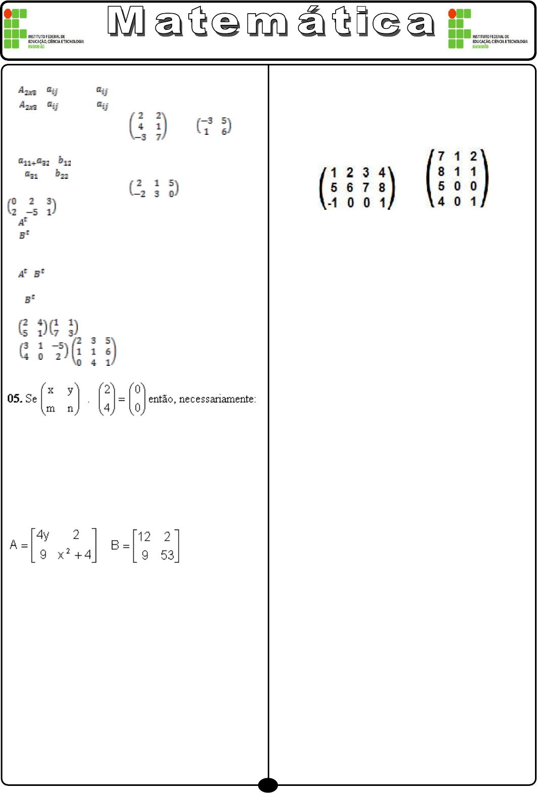 <p>no</p><p>1</p><p>Professor Fernando</p><p>Q.1 Construa as matrizes abaixo:</p><p>a) = , tal que = i + 2j</p><p>b) = , tal que = 3i – j</p><p>Q.2 Dadas as matrizes A = e B = .</p><p>Determine:</p><p>a) -</p><p>b) 3 + 2</p><p>Q.3 Dadas as matrizes A = e B =</p><p>.Determine:</p><p>a)</p><p>b)</p><p>c) A + B</p><p>d) A – B</p><p>e) -</p><p>f) -3A</p><p>g) 5</p><p>Q.4 Faça o produto das matrizes:</p><p>a) .</p><p>b) .</p><p>a) x = y = 0</p><p>b) x = y = m = n = 0</p><p>c) x = y e m = n</p><p>d) y = -2x e n = -2m</p><p>e) x = -2y e m = -2n</p><p>Q.6 Dadas as matrizes</p><p>e</p><p>Determine x e y de modo que a matriz A seja igual à</p><p>matriz B.</p><p>Q.7 Dadas as matrizes A = </p><p></p><p></p><p></p><p></p><p></p><p>2- 4</p><p>1 3</p><p>e B =</p><p></p><p></p><p></p><p></p><p></p><p> </p><p>2- 1</p><p>y- xyx</p><p>, determine x e y para que A = B</p><p>t</p><p>.</p><p>Q.8 Dadas as matrizes A = </p><p></p><p></p><p></p><p></p><p></p><p> 4 3</p><p>1 2</p><p>, B = </p><p></p><p></p><p></p><p></p><p></p><p>5 2</p><p>1- 0</p><p>e</p><p>C = </p><p></p><p></p><p></p><p></p><p></p><p>1 6</p><p>0 3</p><p>, calcule:</p><p>a) A – B b) A – B</p><p>t</p><p>– C</p><p>Q.9 (PUC–SP–Adaptada) São dadas as matrizes A =</p><p>(aij) e B = (bij), quadradas de ordem 2, com aij = 3i + 4j</p><p>e bij = – 4i – 3j. Considerando C = A + B, calcule a</p><p>matriz C.</p><p>Q.10 (PUC – RS) O elemento c22 da matriz C = AB,</p><p>onde A = e B = :</p><p>a) 0 b) 2</p><p>c) 6 d) 11</p><p>e) 22</p><p>Q.11 (PUC–SP–Adaptada) São dadas as matrizes A =</p><p>(aij) e B = (bij), quadradas de ordem 2, com aij = 3i + 4j</p><p>e bij = – 4i – 3j. Considerando C = A + B, calcule a</p><p>matriz C.</p><p>Q.12 Sobre as sentenças:</p><p>I. O produto das matrizes A3 x 2 . B2 x 1 é uma matriz</p><p>3 x 1.</p><p>II. O produto das matrizes A5 x 4 . B5 x 2 é uma matriz</p><p>4 x 2.</p><p>III. O produto das matrizes A2 x 3 . B3 x 2 é uma matriz</p><p>quadrada 2 x 2</p><p>É verdade que:</p><p>a) somente I é falsa;</p><p>b) somente II é falsa;</p><p>c) somente III é falsa;</p><p>d) somente I e III são falsas;</p><p>e) I, II e III são falsas.</p>