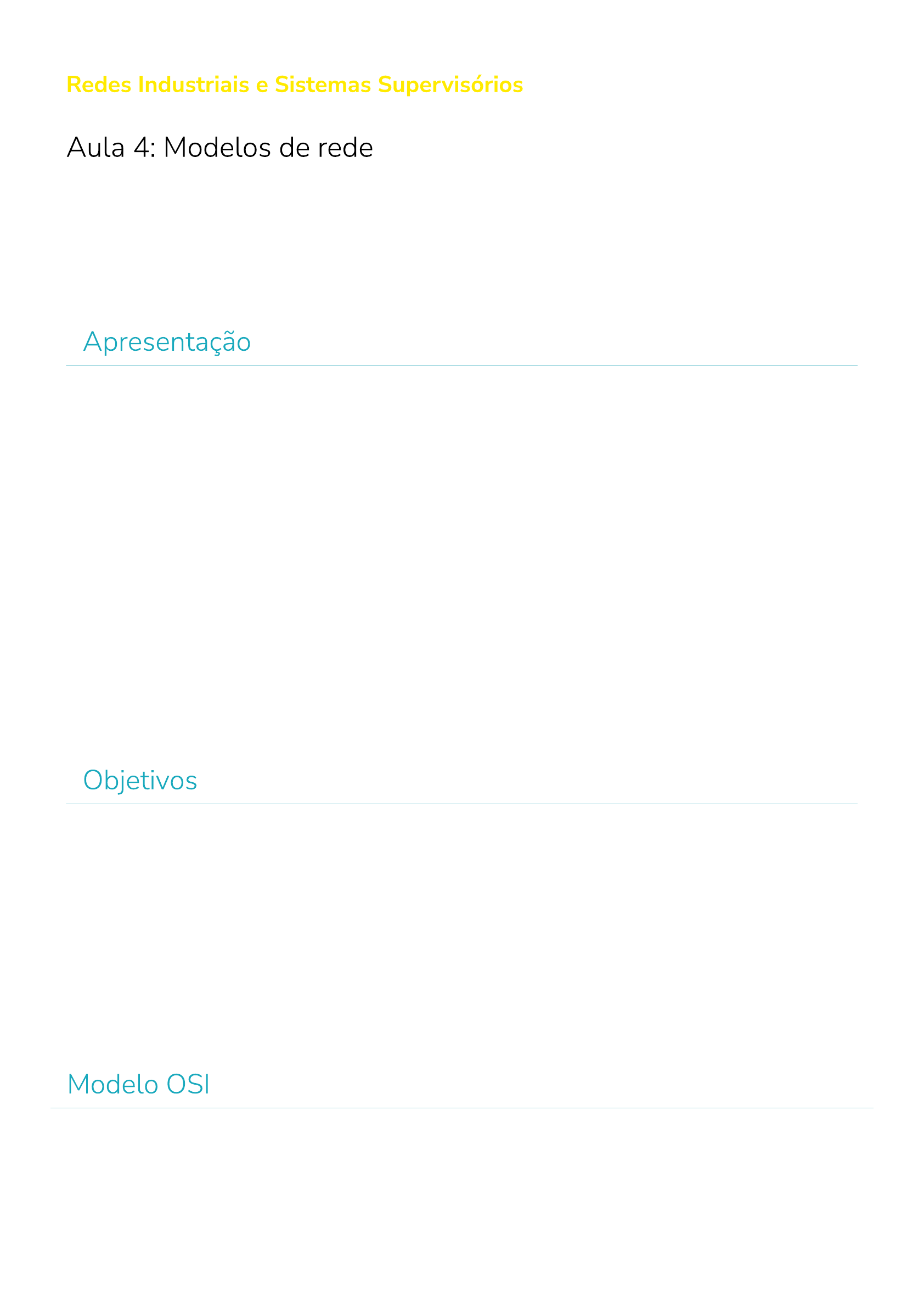 <p>No início da criação das redes de computadores, assim como das redes de automação industrial, não existia qualquer tipo</p><p>de padronização – os padrões eram de�nidos por cada fabricante da maneira que considerassem mais interessante.</p><p>Porém com o tempo isso gerou uma série de problemas, principalmente em relação à compatibilidade de equipamentos.</p><p>Sem uma padronização, não era possível utilizar um equipamento de determinado fabricante em uma rede que tinha sido</p><p>formada com equipamentos de outro. Para superar problemas como esse, foram criados modelos padronizados de rede,</p><p>que determinavam, entre outras coisas, a maneira como os dados seriam trocados na rede.</p><p>Tomando como base a ideia de padronização de redes, posteriormente foram criados protocolos e barramentos</p><p>padronizados para serem utilizados nas redes de automação industrial. Esses protocolos e barramentos permitiram uma</p><p>otimização da criação e manutenção das redes industriais, representando um importante avanço.</p><p>Nesta aula, além dos modelos padronizados de redes e dos protocolos e barramentos desenvolvidos, apresentaremos</p><p>também alguns tipos de mensagens utilizados em redes de automação industrial.</p><p>• Analisar os modelos de rede desenvolvidos, sua necessidade de padronização e a maneira como são aplicados no</p><p>controle de processos de uma rede industrial;</p><p>• Descrever os principais protocolos e barramentos industriais;</p><p>• Discutir os métodos de trocas de dados e os tipos de mensagens enviadas em uma rede industrial.</p><p>Na época da criação das redes de computadores, cada fabricante desenvolvia suas tecnologias sem seguir qualquer</p><p>padronização, o que levava a frequentes incompatibilidades. Entretanto, em determinado momento começou a surgir uma</p><p>preocupação com o estabelecimento de um padrão internacional.</p><p>Atenção! Aqui existe uma videoaula, acesso pelo conteúdo online</p><p> Fonte: Shutterstock.</p><p>O modelo OSI, considerado modelo de referência, é de�nido em sete camadas, as quais especi�cam e estabelecem todos os</p><p>termos e funções requeridos por um protocolo de comunicação em qualquer nível de uma rede de dados.</p><p>A redução da complexidade é feita por meio de abstrações, isto é, o que uma camada inferior realiza ou como ela é</p><p>implementada não importa à camada superior, desde que o serviço a ela determinado funcione corretamente. Para se chegar</p><p>às sete camadas desse modelo, alguns princípios são seguidos:</p><p>Seguindo esses princípios, são de�nidas como as camadas do modelo OSI:</p><p>A primeira camada é a camada física, na qual é tratada a transmissão de bits brutos por um canal de comunicação. O projeto</p><p>da rede deve garantir a transmissão correta de cada bit. Assim, quando um lado enviar um bit 1, o outro lado o receberá como</p><p>um bit 1, e não como um bit 0.</p><p>Nesse caso, as principais questões são o nível de tensão usado para representar um bit 1 e um bit 0, o espaço de tempo que</p><p>um bit deve durar, o fato de a transmissão poder ser ou não realizada nos dois sentidos simultaneamente, a forma como a</p><p>conexão inicial será estabelecida e de que maneira ela será encerrada quando os dois lados tiverem terminado.</p><p>Atenção</p><p>Além disso, é necessário ter cuidado com interferências, as quais podem alterar valores de tensão, e ainda</p><p>quantos pinos o conector de rede vai usar e qual será a �nalidade de cada pino. Nessa situação, as</p><p>questões de projeto lidam em grande parte com interfaces mecânicas, elétricas e de sincronização, e com</p><p>o meio físico de transmissão que se situa abaixo da camada física.</p><p>Após a camada física se encontra a camada de enlace de dados. A principal função dela é transformar um canal de</p><p>transmissão bruta em uma linha livre de erros de transmissão não detectados para a camada de rede. Para que seja possível</p><p>executar essa tarefa, o enlace de dados faz com que o transmissor divida os dados de entrada em quadros de dados e</p><p>transmita os quadros de forma sequencial. Se o serviço for realizado de maneira correta, o receptor con�rmará a recepção</p><p>correta de cada quadro, enviando de volta um quadro de con�rmação.</p><p> Fonte: Shutterstock.</p><p>Outra questão dessa camada é como fazer para impedir</p><p>que um transmissor com maior velocidade envie uma</p><p>quantidade excessiva de dados a um receptor lento.</p><p>Frequentemente se faz necessário um mecanismo de</p><p>regulação de tráfego para informar ao transmissor quanto</p><p>espaço o buffer do receptor tem no momento.</p><p>Em seguida, a camada de rede controla a operação da sub-rede.</p><p>Atenção</p><p>É fundamental para um projeto determinar a maneira como os pacotes serão roteados da origem até o</p><p>destino. Essas rotas costumam ser baseadas em tabelas estáticas, raramente alteradas. Outra forma é</p><p>caso elas sejam determinadas no início de cada conversação. Também podem ser dinâmicas, sendo</p><p>determinadas para cada pacote, com o objetivo de re�etir a carga atual da rede.</p><p>Caso haja uma quantidade signi�cativa de pacotes na sub-rede ao mesmo tempo, eles vão compartilhar o mesmo caminho,</p><p>provocando atrasos. O controle desse congestionamento também pertence à camada de rede. Além disso, à medida que um</p><p>pacote tem de viajar de uma rede para outra até́ chegar a seu destino, problemas podem ocorrer durante o processo, como:</p><p>• Diferenças no endereçamento utilizado pela segunda rede do empregado na primeira;</p><p>• A segunda rede pode rejeitar o pacote recebido devido ao tamanho excessivo;</p><p>• Ou os protocolos utilizados pelas redes podem ser incompatíveis.</p><p>A próxima camada é a de transporte, que tem como funções básicas aceitar dados da camada
