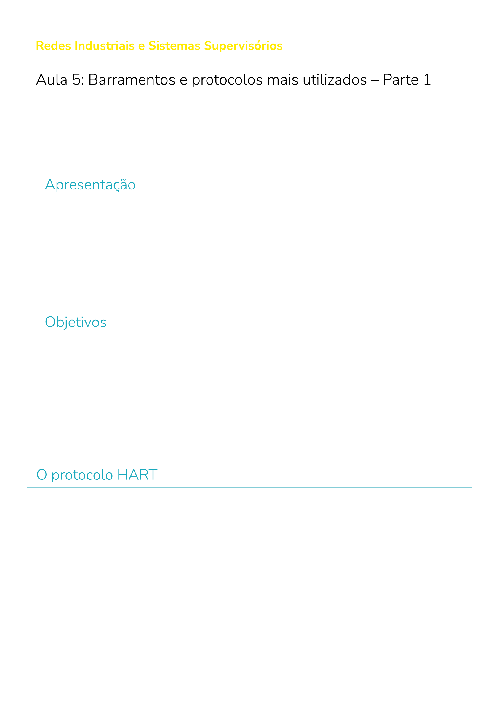<p>é necessário o uso de um endereço, visto que todos estão</p><p>ligados em uma rede bidirecional em barramento. Cada escravo terá um endereço, que pode variar de 1 a 247. Logo, até 247</p><p>escravos podem ser utilizados em uma rede desse tipo.</p><p>• MODBUS RTU: Todos os dados do quadro são transmitidos em binário, seguidos de um CRC. O modo RTU também é</p><p>chamado de ModBus-B ou Modbus binário e é o modo preferencial.</p><p>• MODBUS ASCII: As mensagens contêm dados do quadro codi�cados em ASCII.</p><p>Os dados no protocolo MODBUS são enviados por meio de um quadro de dados, que é formado pelos seguintes campos:</p><p>Quadro do mestre</p><p>• Endereço (ou Address): neste é de�nido o endereço do escravo desejado, de 1 a 247, ou é utilizado 0 para que o comando</p><p>chegue a todos os escravos, broadcast.</p><p>• Código de função (ou Function Code): determina um dado comando de leitura ou escrita no escravo.</p><p>• Dados (ou Data): dados a serem escritos no escravo caso o comando seja de escrita, ou dados especí�cos de leitura caso</p><p>o comando seja de leitura.</p><p>• Palavra de controle (ou CRC): dois bytes calculados para detectar erros de transmissão, utilizando CRC-16. Esse valor é</p><p>calculado a partir de todos os grupos de 16 bits (2 bytes) do quadro, excluindo obviamente o próprio CRC. No escravo,</p><p>esse valor é calculado outra vez e comparado ao valor enviado.</p><p>Quadro do escravo</p><p>• Dados (ou Data): dados solicitados ao escravo caso o comando executado tenha sido de leitura, ou o eco do valor escrito</p><p>caso o comando tenha sido de escrita.</p><p>• Palavra de controle (ou CRC): dois bytes calculados para detectar erros de transmissão, utilizando CRC-16. Esse valor é</p><p>calculado a partir de todos os grupos de 16 bits (2 bytes) do quadro, excluindo obviamente o próprio CRC. No mestre, este</p><p>valor é calculado outra vez e comparado ao valor enviado.</p><p>Atenção! Aqui existe uma videoaula, acesso pelo conteúdo online</p><p>Exemplo</p><p>Exemplos de códigos de funções:</p><p>0 x 05 – (Write Single Coil) - Altera o estado de uma saída digital;</p><p>0 x 02 – (Read Input Status) - Lê um número variável de entradas digitais;</p><p>0 x 06 – (Write Single Register) - Altera o estado de uma saída analógica;</p><p>0 x 03 – (Read Holding Registers) - Lê um número variável de saídas analógicas ou memórias;</p><p>0 x 04 – (Read Input Registers) – Lê um número variável de entradas analógicas.</p><p>1. Em uma rede industrial na qual é utilizado o protocolo HART sobre um circuito 4-20mA, foi aferido o valor de corrente de 1mA</p><p>na rede. O que pode ser a�rmado sobre essa rede?</p><p>a) Não existe sinal sendo enviado pela rede.</p><p>b) Existem poucos instrumentos ligados na rede.</p><p>c) Os dispositivos de campo devem estar com um consumo alto de energia.</p><p>d) Existe uma falha no circuito, visto que a corrente mínima deve ser de 4mA.</p><p>e) A rede está transmitindo o bit 0.</p><p>2. O protocolo HART foi criado inicialmente como um protocolo proprietário. Porém, a partir de determinado ano, o protocolo</p><p>passou a ser oferecido como um protocolo aberto, o que incentivou o aumento do uso em indústrias. Qual foi o ano que esse</p><p>protocolo passou a ser oferecido de maneira livre?</p><p>a) 1980.</p><p>b) 1970.</p><p>c) 1990.</p><p>d) 2000.</p><p>e) 1979.</p><p>3. No protocolo HART os bits são transferidos na forma de modulação do sinal em frequência; sendo 2400 Hz a frequência</p><p>para o bit 0, qual é frequência para o bit 1?</p><p>a) 2400 Hz.</p><p>b) 1200 Hz.</p><p>c) 3600 Hz.</p><p>d) 100 Hz.</p><p>e) 240 Hz.</p><p>4. Um dos itens do quadro de dados utilizado no protocolo MODBUS é o código de função. Esse código indica ao escravo o que</p><p>deve ser feito. Qual dos códigos abaixo altera o estado de uma saída digital?</p><p>a) 0 x 06.</p><p>b) 0 x 05.</p><p>c) 0 x 01.</p><p>d) 0 x 04.</p><p>e) 0 x 07.</p><p>5. Uma questão importante a ser veri�cada durante o processo de comunicação é a ocorrência de erros. Para tal, existe no</p><p>quadro de dados do protocolo MODBUS um campo especí�co para isso.</p><p>Qual é esse campo?</p><p>a) Campo de endereço.</p><p>b) Campo do código de função.</p><p>c) Campo de dados.</p><p>d) Campo informativo.</p><p>e) Campo da palavra de controle.</p><p>BORGES, J. F. Redes industriais de comunicação. In: Apostila do curso de Fundamentos de Redes Industriais e Aplicações.</p><p>International. Society of Automation. ISA. Vitória: 2009.</p><p>CASSIOLATO, C.; TORRES, L. H. B.; PADOVAN, M. A. Pro�bus – descrição técnica, 2012.</p><p>FERNANDEZ, M. P. Redes de Computadores. 1. ed. Fortaleza: UAB/UECE, 2015.</p><p>HART COMMUNICATION FOUNDATION. Sobre o Protocolo HART, 2012.</p><p>SARMENTO, A. Redes industriais e sistemas supervisórios. Disponível em: //www.andresarmento.com/estacio/estudo/.</p><p>Acesso em: 6 set. 2019.</p><p>• Protocolo PROFBUS;</p><p>• Protocolo INTERBUS.</p><p>Pesquise na internet sites, vídeos e artigos relacionados ao conteúdo visto.</p><p>Em caso de dúvidas, converse com seu professor online por meio dos recursos disponíveis no ambiente de aprendizagem.</p><p>javascript:void(0);</p><p>javascript:void(0);</p>é necessário o uso de um endereço, visto que todos estão ligados em uma rede bidirecional em barramento. Cada escravo terá um endereço, que pode variar de 1 a 247. Logo, até 247 escravos podem ser utilizados em uma rede desse tipo. • MODBUS RTU: Todos os dados do quadro são transmitidos em binário, seguidos de um CRC. O modo RTU também é chamado de ModBus-B ou Modbus binário e é o modo preferencial. • MODBUS ASCII: As mensagens contêm dados do quadro codi�cados em ASCII. Os dados no protocolo MODBUS são enviados por meio de um quadro de dados, que é formado pelos seguintes campos: Quadro do mestre • Endereço (ou Address): neste 