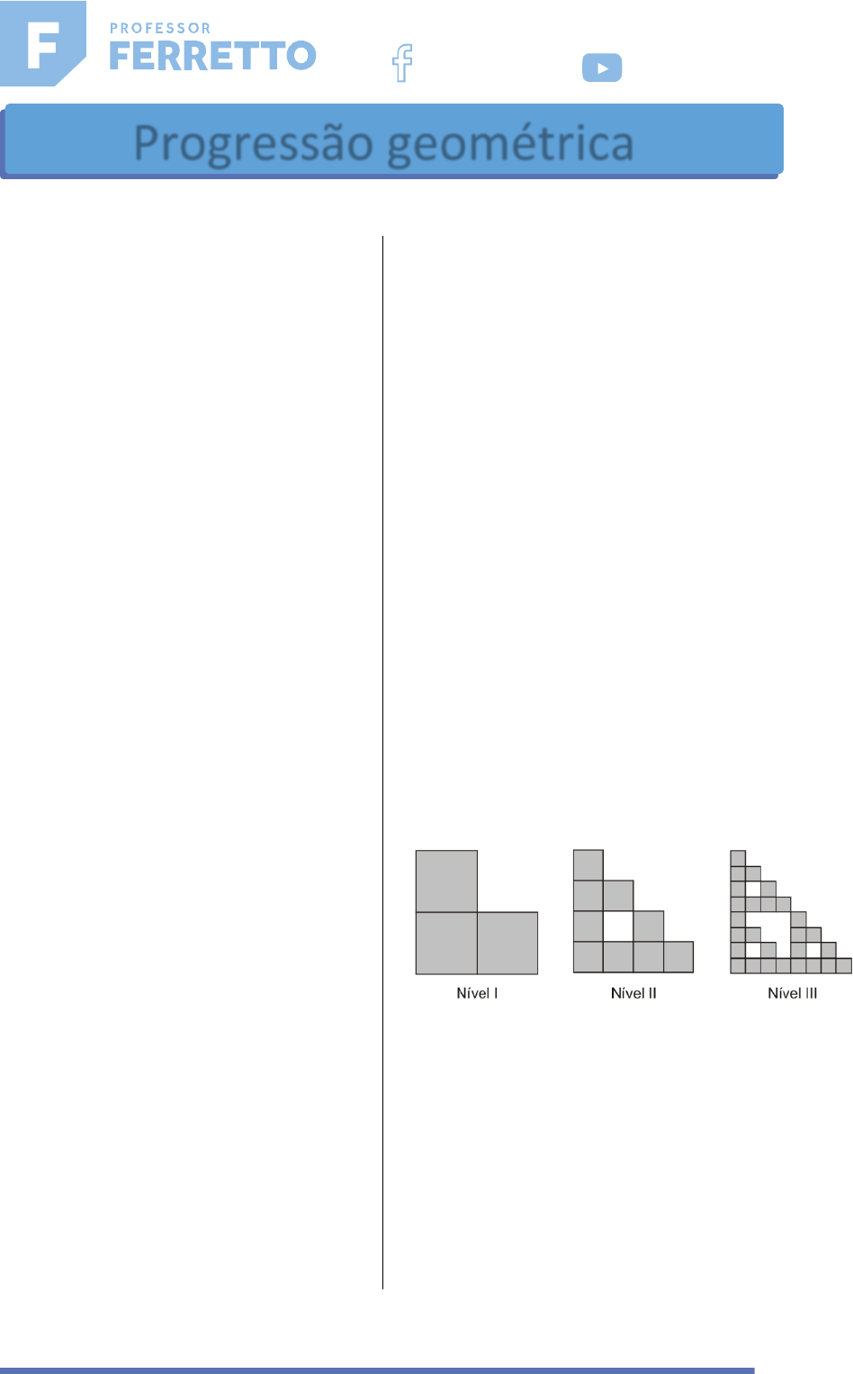 <p>1</p><p>M0227 - (Enem) O acréscimo de tecnologias no sistema</p><p>produtivo industrial tem por objetivo reduzir custos e</p><p>aumentar a produtividade. No primeiro ano de</p><p>funcionamento, uma indústria fabricou 8000 unidades</p><p>de um determinado produto. No ano seguinte, investiu</p><p>em tecnologia adquirindo novas máquinas e aumentou</p><p>a produção em 50%. Estima-se que esse aumento</p><p>percentual se repita nos próximos anos, garantindo um</p><p>crescimento anual de 50%. Considere P a quantidade</p><p>anual de produtos fabricados no ano t de</p><p>funcionamento da indústria.</p><p>Se a estimativa for alcançada, qual é a expressão que</p><p>determina o número de unidades produzidas P em</p><p>função de t, para 𝑡 ≥ 1?</p><p>a) 𝑃(𝑡) = 0,5 ⋅ 𝑡-. + 8000</p><p>b) 𝑃(𝑡) = 50 ⋅ 𝑡-. + 8000</p><p>c) 𝑃(𝑡) = 4000 ⋅ 𝑡-. + 8000</p><p>d) 𝑃(𝑡) = 8000 ⋅ (0,5)2-.</p><p>e) 𝑃(𝑡) = 8000 ⋅ (1,5)2-.</p><p>M0231 - (Uel) Leia o texto a seguir.</p><p>Van Gogh (1853-1890) vendeu um único quadro em</p><p>vida a seu irmão, por 400 francos. Nas palavras do</p><p>artista: “Não posso evitar os fatos de que meus</p><p>quadros não sejam vendáveis. Mas virá o tempo em</p><p>que as pessoas verão que eles valem mais que o preço</p><p>das tintas”.</p><p>(Disponível em:</p><p><http://www.naturale.med.br/artes/4_Van_Gogh.pdf</p><p>>. Acesso em: 2 out. 2013.)</p><p>A mercantilização da cultura impulsionou o mercado</p><p>de artes nos grandes centros urbanos. Hoje, o quadro</p><p>Jardim das Flores, de Van Gogh, é avaliado em</p><p>aproximadamente 84 milhões de dólares. Supondo que</p><p>há 61 anos essa obra custasse 84 dólares e que sua</p><p>valorização até 2013 ocorra segundo uma PG, assinale</p><p>a alternativa que apresenta, corretamente, o valor</p><p>dessa obra em 2033, considerando que sua valorização</p><p>continue conforme a mesma PG.</p><p>a) 1,68 × 105 dólares.</p><p>b) 8,40 × 105 dólares.</p><p>c) 84 × 106 dólares.</p><p>d) 168 × 107 dólares.</p><p>e) 420,00 × 106 dólares.</p><p>M0232 - (Upf)</p><p>TEXTO PARA A PRÓXIMA QUESTÃO:</p><p>A sequência de figuras acima ilustra três passos da</p><p>construção de um fractal, utilizando-se como ponto de</p><p>partida um triminó: o nível I é constituído de uma peça</p><p>formada por três quadrados de 1cm de lado cada,</p><p>justapostos em forma de L. No segundo passo,</p><p>substitui-se cada quadrado do fractal de nível I por um</p><p>triminó, que tem os comprimentos dos lados de seus</p><p>quadrados adequadamente ajustados à situação, de</p><p>forma a se obter o fractal de nível II, conforme ilustrado</p><p>acima.</p><p>www.professorferretto.com.br</p><p>ProfessorFerretto ProfessorFerretto</p><p>Progressão geométrica</p><p>2</p><p>No terceiro passo, obtém-se, a partir do fractal de nível</p><p>II, também substituindo-se cada um de seus quadrados</p><p>por um triminó com os lados de seus quadrados</p><p>ajustados, o fractal de nível III. O processo continua</p><p>dessa forma, sucessiva e indefinidamente, obtendo-se</p><p>os fractais de níveis n = I, II, III, ...</p><p>Com base nessas informações, a partir de que nível a</p><p>área da figura se torna menor que 1 cm2?</p><p>a) Nível 3.</p><p>b) Nível 4.</p><p>c) Nível 5.</p><p>d) Nível 6.</p><p>e) Nível 7.</p><p>M0233 - (Ufsm) A tabela mostra o número de pessoas</p><p>que procuraram serviços de saúde, segundo o local,</p><p>numa determinada cidade.</p><p>Local \ Ano 2001 2002 2003 2004 2005</p><p>Postos e</p><p>Centros de</p><p>Saúde</p><p>2.000 4.000 8.000 16.000 32.000</p><p>Clínicas</p><p>Privadas</p><p>4.200 5.400 6.600 7.800 9.000</p><p>Clínicas</p><p>Odontológicas</p><p>857 854 851 848 845</p><p>Supõe-se que esse comportamento é mantido nos</p><p>próximos anos. Partindo dos dados, fazem-se as</p><p>seguintes afirmações:</p><p>I. O número de pessoas que procuraram Postos e</p><p>Centros de Saúde cresceu em progressão geométrica</p><p>de razão 2.000.</p><p>II. O total de pessoas que procuraram atendimento em</p><p>Clínicas Privadas de 2001 até 2011 é igual a 112.200.</p><p>III. Em 2011, o número de atendimentos em Clínicas</p><p>Odontológicas é igual a 827.</p><p>Está(ão) correta(s)</p><p>a) apenas I.</p><p>b) apenas II.</p><p>c) apenas I e III.</p><p>d) apenas II e III.</p><p>e) I, II e III.</p><p>M0234 - (Unesp) O artigo Uma estrada, muitas</p><p>florestas relata parte do trabalho de reflorestamento</p><p>necessário após a construção do trecho sul do</p><p>Rodoanel da cidade de São Paulo.</p><p>O engenheiro agrônomo Maycon de Oliveira mostra</p><p>uma das árvores, um fumo-bravo, que ele e sua equipe</p><p>plantaram em novembro de 2009. Nesse tempo, a</p><p>árvore cresceu – está com quase 2,5 metros –,</p><p>floresceu, frutificou e lançou sementes que</p><p>germinaram e formaram descendentes [...] perto da</p><p>árvore principal. O fumo-bravo [...] é uma espécie de</p><p>árvore pioneira, que cresce rapidamente, fazendo</p><p>sombra para as espécies de árvores de crescimento</p><p>mais lento, mas de vida mais longa.</p><p>(Pesquisa FAPESP, janeiro de 2012. Adaptado.)</p><p>Considerando que a referida árvore foi plantada em 1º</p><p>de novembro de 2009 com uma altura de 1 dm e que</p><p>em 31 de outubro de 2011 sua altura era de 2,5 m e</p><p>admitindo ainda que suas alturas, ao final de cada ano</p><p>de plantio, nesta fase de crescimento, formem uma</p><p>progressão geométrica, a razão deste crescimento, no</p><p>período de dois anos, foi de</p><p>a) 0,5.</p><p>b) 5 10–1/2.</p><p>c) 5.</p><p>d) 5 101/2.</p><p>e) 50.</p><p>´</p><p>´</p><p>3</p><p>M0235 - (Uespi) O número de computadores no</p><p>mundo, em 2001, era 600 milhões. Se este número</p><p>aumentou 10% a cada ano, em relação ao ano anterior,</p><p>quantos bilhões de computadores existem no mundo</p><p>em 2011? Dado: use a aproximação 1,1.9 ≅ 2,6.</p><