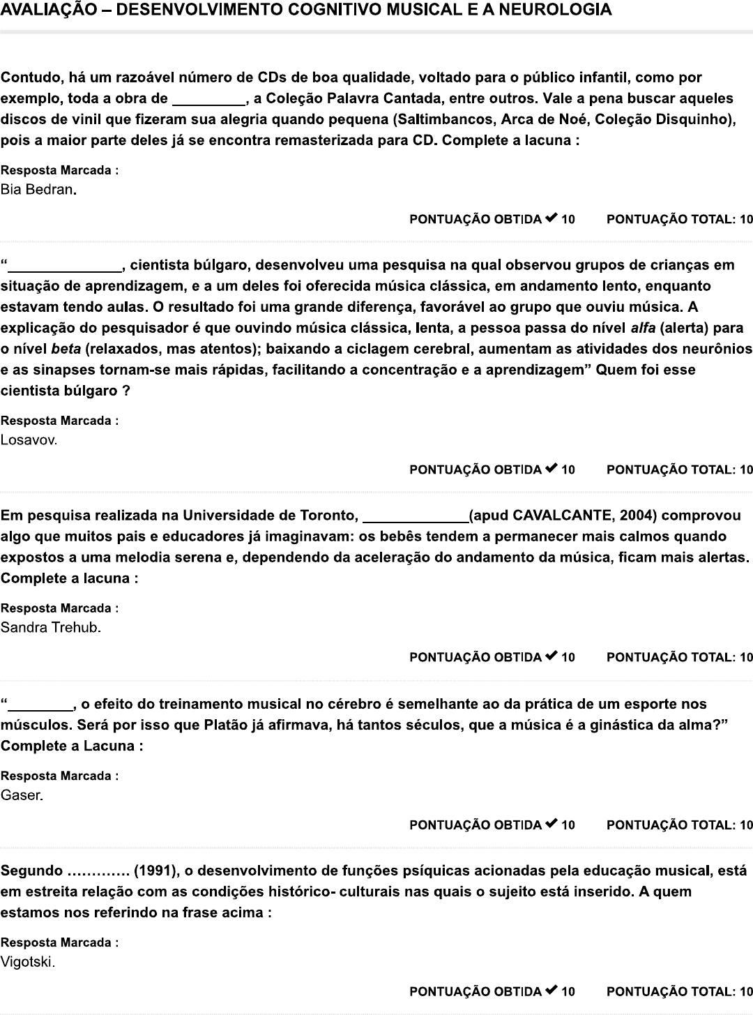 <p>AVALIAÇÃO - DESENVOLVIMENTO COGNITIVO MUSICAL E A NEUROLOGIA Contudo, há um razoável número de CDs de boa qualidade, voltado para o público infantil, como por exemplo, toda a obra de a Coleção Palavra Cantada, entre outros. Vale a pena buscar aqueles discos de vinil que fizeram sua alegria quando pequena (Saltimbancos, Arca de Noé, Coleção Disquinho), pois a maior parte deles já se encontra remasterizada para CD. Complete a lacuna : Resposta Marcada Bia Bedran. PONTUAÇÃO OBTIDA 10 PONTUAÇÃO TOTAL: 10 " cientista búlgaro, desenvolveu uma pesquisa na qual observou grupos de crianças em situação de aprendizagem, e a um deles foi oferecida música clássica, em andamento lento, enquanto estavam tendo aulas. o resultado foi uma grande diferença, favorável ao grupo que ouviu música. A explicação do pesquisador é que ouvindo música clássica, lenta, a pessoa passa do nível alfa (alerta) para o nível beta (relaxados, mas atentos); baixando a ciclagem cerebral, aumentam as atividades dos neurônios e as sinapses tornam-se mais rápidas, facilitando a concentração e a aprendizagem" Quem foi esse cientista búlgaro ? Resposta Marcada : Losavov. PONTUAÇÃO OBTIDA 10 PONTUAÇÃO TOTAL: 10 Em pesquisa realizada na Universidade de Toronto, (apud CAVALCANTE, 2004) comprovou algo que muitos pais e educadores já imaginavam: os bebês tendem a permanecer mais calmos quando expostos a uma melodia serena e, dependendo da aceleração do andamento da música, ficam mais alertas. Complete a lacuna : Resposta Marcada : Sandra Trehub. PONTUAÇÃO OBTIDA 10 PONTUAÇÃO TOTAL: 10 " o efeito do treinamento musical no cérebro é semelhante ao da prática de um esporte nos músculos. Será por isso que Platão já afirmava, há tantos séculos, que a música é a ginástica da alma?" Complete a Lacuna : Resposta Marcada : PONTUAÇÃO OBTIDA 10 PONTUAÇÃO TOTAL: 10 Segundo (1991), o desenvolvimento de funções psíquicas acionadas pela educação musical, está em estreita relação com as condições histórico- culturais nas quais o sujeito está inserido. A quem estamos nos referindo na frase acima : Resposta Marcada : Vigotski. PONTUAÇÃO OBTIDA 10 PONTUAÇÃO TOTAL: 10</p><p>No final de qual século se confirmam que a influência da música no desenvolvimento da criança é incontestável. Algumas delas demonstraram que o bebê, ainda no útero materno, desenvolve reações a estímulos sonoros ? Resposta Marcada : XX. PONTUAÇÃO OBTIDA 10 PONTUAÇÃO TOTAL: 10 Em países com mais tradição que o Brasil no campo da educação da criança pequena, a música recebe destaque nos currículos, como é o caso do e dos países nórdicos. Nesses países, educador tem, na sua graduação profissional, um espaço considerável dedicado à sua formação musical, inclusive com a prática de um instrumento, além do aprendizado de um grande número de canções. Este é, por sinal, um grande entrave para nós: o espaço destinado à música em grande parte dos currículos de formação de professores é ainda incipiente, quando existe. É preciso investir significativamente na formação estética (e musical, particularmente) de nossos professores, se realmente quisermos obter melhores resultados na educação básica. Que pais completa a lacuna ? Resposta Marcada Japão. PONTUAÇÃO OBTIDA 10 PONTUAÇÃO TOTAL: 10 "o trabalho é, portanto, desde a origem, um processo mediatizado simultaneamente pelo instrumento (em sentido pleno) e pela sociedade" Quem é o autor da citação ? Resposta Marcada : Leontiev. PONTUAÇÃO OBTIDA 10 PONTUAÇÃO TOTAL: 10 Dois cientistas desenvolveram uma pesquisa que buscou analisar os efeitos no cérebro de pessoas que ouviam músicas, as quais segundo as mesmas lhes causavam profunda emoção. Verificou-se que ao ouvir estas músicas, as pessoas acionaram exatamente as mesmas partes do cérebro que têm relação com estados de euforia. Segundo esses autores, isso confere à música uma grande relevância biológica, relacionando-a aos circuitos cerebrais ligados ao prazer. Que cientistas foram estes? Resposta Marcada Zatorre e Blood. PONTUAÇÃO OBTIDA 10 PONTUAÇÃO TOTAL: 10 Segundo esses autores, tocar um instrumento exige muito da audição e da motricidade fina das pessoas. Quem são esses autores ? Resposta Marcada : Schlaug, da Escola de Medicina de Harvard (EUA), e Gaser, da Universidade de Jena (Alemanha). PONTUAÇÃO OBTIDA 10 PONTUAÇÃO TOTAL: 10 Total 100 / 100</p>