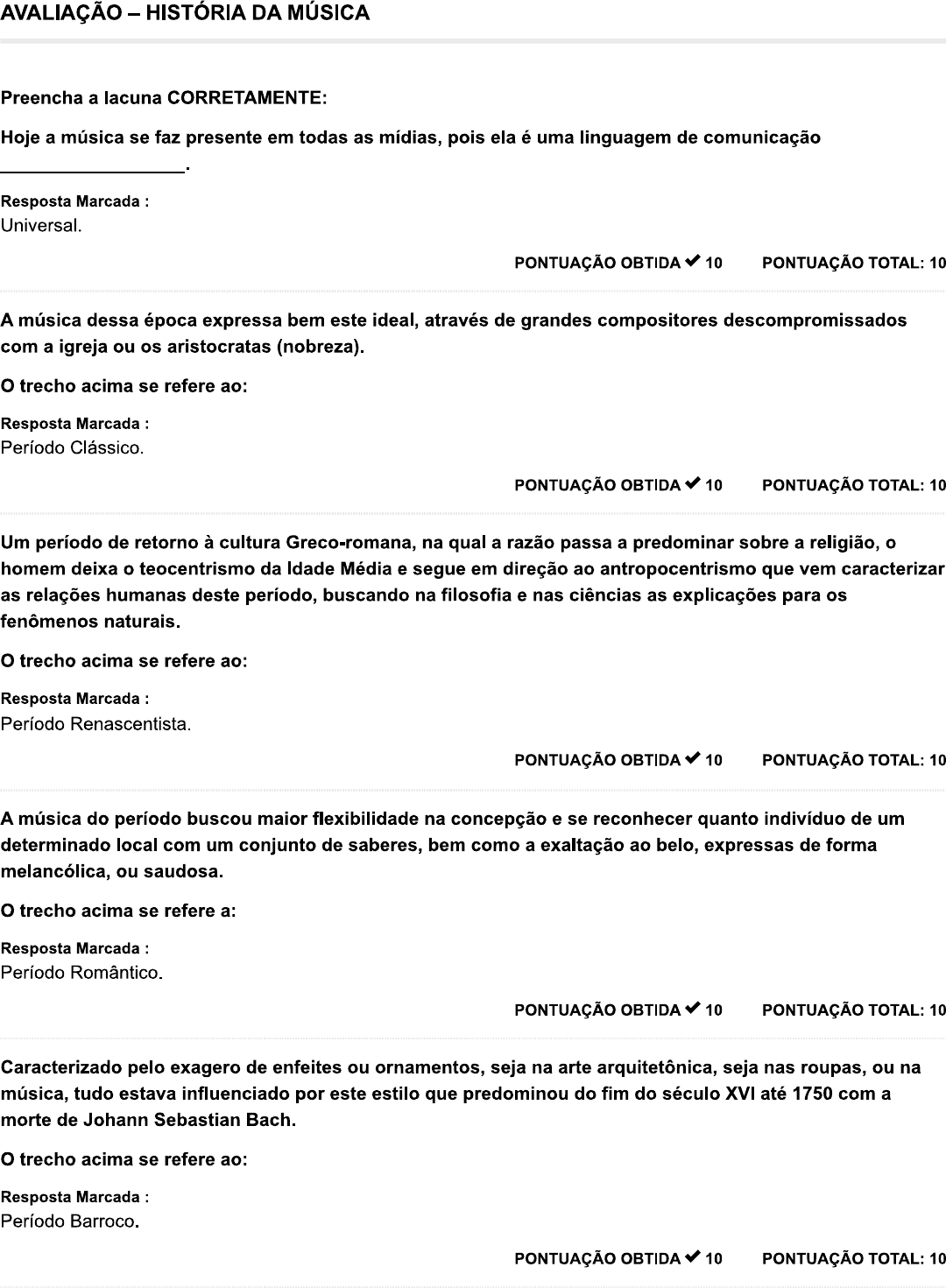 <p>AVALIAÇÃO - HISTÓRIA DA MÚSICA Preencha a lacuna CORRETAMENTE: Hoje a música se faz presente em todas as mídias, pois ela é uma linguagem de comunicação Resposta Marcada Universal. PONTUAÇÃO OBTIDA 10 PONTUAÇÃO TOTAL: 10 A música dessa época expressa bem este ideal, através de grandes compositores descompromissados com a igreja ou os aristocratas (nobreza). o trecho acima se refere ao: Resposta Marcada : Período Clássico. PONTUAÇÃO OBTIDA 10 PONTUAÇÃO TOTAL: 10 Um período de retorno à cultura Greco-romana, na qual a razão passa a predominar sobre a religião, o homem deixa o teocentrismo da Idade Média e segue em direção ao antropocentrismo que vem caracterizar as relações humanas deste período, buscando na filosofia e nas ciências as explicações para os fenômenos naturais. o trecho acima se refere ao: Resposta Marcada : Período Renascentista. PONTUAÇÃO OBTIDA 10 PONTUAÇÃO TOTAL: 10 A música do período buscou maior flexibilidade na concepção e se reconhecer quanto indivíduo de um determinado local com um conjunto de saberes, bem como a exaltação ao belo, expressas de forma melancólica, ou saudosa. o trecho acima se refere a: Resposta Marcada : Período Romântico. PONTUAÇÃO OBTIDA 10 PONTUAÇÃO TOTAL: 10 Caracterizado pelo exagero de enfeites ou ornamentos, seja na arte arquitetônica, seja nas roupas, ou na música, tudo estava influenciado por este estilo que predominou do fim do século XVI até 1750 com a morte de Johann Sebastian Bach. o trecho acima se refere ao: Resposta Marcada : Período Barroco. PONTUAÇÃO OBTIDA 10 PONTUAÇÃO TOTAL: 10</p><p>Uma concepção de música criada a partir do serialismo e de músicas religiosas de povos asiáticos como os indianos, balineses e etc. o trecho acima se refere a: Resposta Marcada : Minimalismo. PONTUAÇÃO OBTIDA 10 PONTUAÇÃO TOTAL: 10 Alcançou um nível elevado de expressão musical, pois era um território que preservava a agricultura e este costume levava às cerimônias religiosas, onde as pessoas batiam espécies de discos e paus uns contra os outros, utilizavam harpas, percussão, diferentes formas de flautas e também cantavam. o trecho acima se refere a: Resposta Marcada : Cultura egípcia. PONTUAÇÃO OBTIDA 10 PONTUAÇÃO TOTAL: 10 Nos Estados Unidos, fez as vezes de um estilo musical popular que se estabeleceu quanto identidade cultural de um povo. o trecho acima se refere ao: Resposta Marcada : Jazz. PONTUAÇÃO OBTIDA 10 PONTUAÇÃO TOTAL: 10 Com o grande desenvolvimento científico, tem-se início as primeiras experiências musicais com gravação sonora em fitas magnéticas. Pierre Schaeffer foi pioneiro neste tipo de composição movido pela busca da Música Concreta. o trecho acima se refere a: Resposta Marcada : Música Eletrônica. PONTUAÇÃO OBTIDA 10 PONTUAÇÃO TOTAL: 10 Preencha a lacuna CORRETAMENTE é a arte de combinar os sons e o silêncio. Resposta Marcada : Música. PONTUAÇÃO OBTIDA 10 PONTUAÇÃO TOTAL: 10 Total 100 / 100</p>