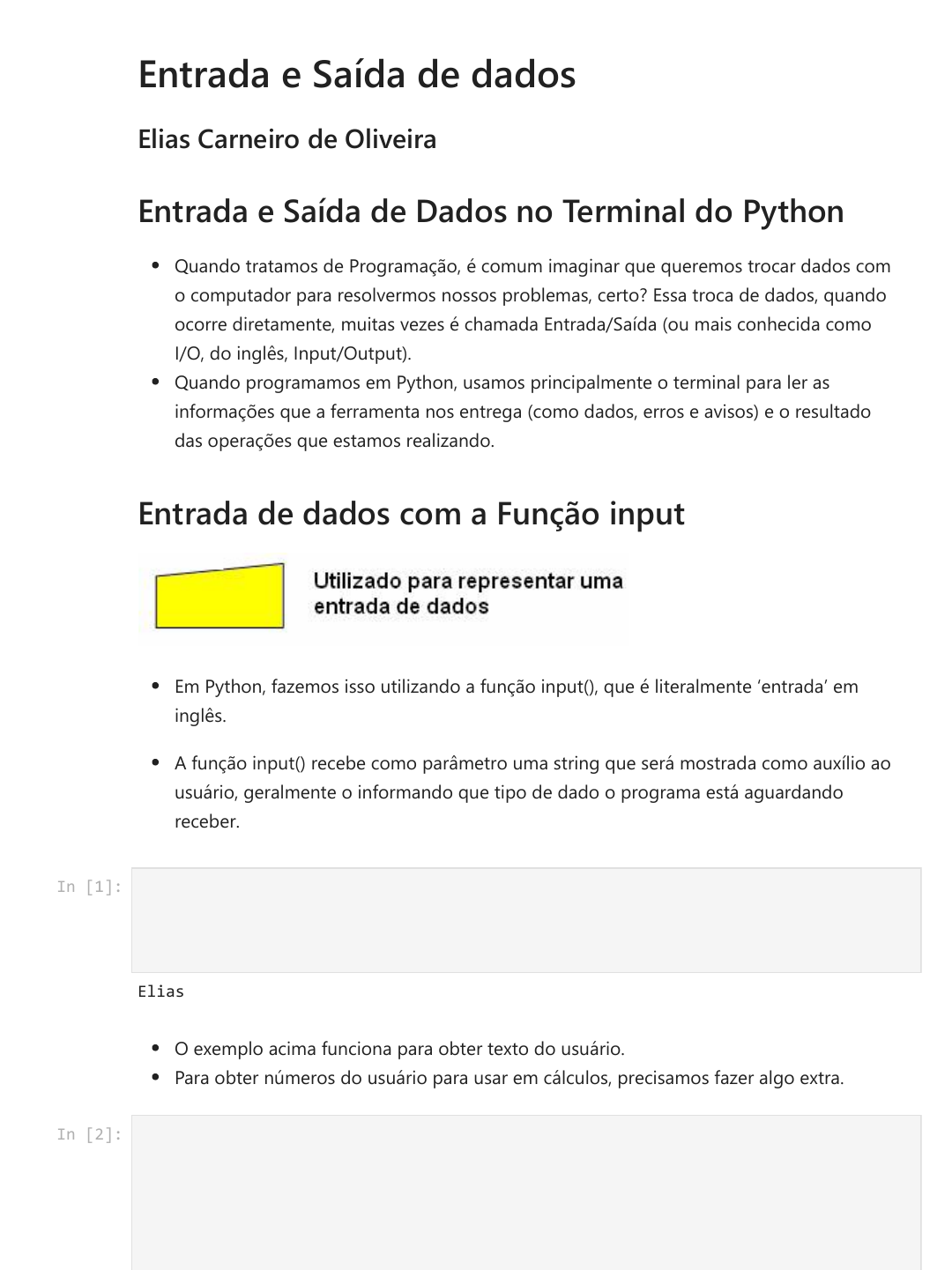<p>Entrada e Saída de dados</p><p>Elias Carneiro de Oliveira</p><p>Entrada e Saída de Dados no Terminal do Python</p><p>Quando tratamos de Programação, é comum imaginar que queremos trocar dados com</p><p>o computador para resolvermos nossos problemas, certo? Essa troca de dados, quando</p><p>ocorre diretamente, muitas vezes é chamada Entrada/Saída (ou mais conhecida como</p><p>I/O, do inglês, Input/Output).</p><p>Quando programamos em Python, usamos principalmente o terminal para ler as</p><p>informações que a ferramenta nos entrega (como dados, erros e avisos) e o resultado</p><p>das operações que estamos realizando.</p><p>Entrada de dados com a Função input</p><p>Em Python, fazemos isso utilizando a função input(), que é literalmente ‘entrada’ em</p><p>inglês.</p><p>A função input() recebe como parâmetro uma string que será mostrada como auxílio ao</p><p>usuário, geralmente o informando que tipo de dado o programa está aguardando</p><p>receber.</p><p>Elias</p><p>O exemplo acima funciona para obter texto do usuário.</p><p>Para obter números do usuário para usar em cálculos, precisamos fazer algo extra.</p><p>In [1]: # Entrando com um String</p><p>nome = input("Digite seu nome: ")</p><p>print (nome)</p><p>In [2]: # Obter a entrada como inteiro</p><p>idade = int(input('Digite sua idade: '))</p><p>print(idade)</p><p>#Obter a entrada como float</p><p>12</p><p>12.3</p><p>True</p><p>A função eval converte o texto digitado pelo usuário em um número. Uma característica</p><p>legal disso é</p><p>você pode inserir expressões, como 3*12+5, e eval irá computá-las para você.</p><p>O quadrado do seu numero: 5.76</p><p>Saída de dados com a função Print</p><p>Um dos primeiros contatos que temos com Python é a função print().</p><p>Usamos essa função para mostrar algo no terminal do Python.</p><p>Para concatenar (juntar) informações textuais com dados armazenados nas nossas</p><p>variáveis, podemos interpolar essas variáveis, e até expressões, com nossa String</p><p>usando o caractere " , .</p><p>olá</p><p>A função de impressão requer parênteses em torno de seus argumentos.</p><p>No programa acima, é apenas argumento é a string 'Olá'.</p><p>Qualquer coisa entre aspas será (com algumas exceções) impressa exatamente como</p><p>aparece.</p><p>altura = float(input('Digite sua altura: '))</p><p>print(altura)</p><p># Obter a entrada como bolean</p><p>casado = bool(input('Você é casado: '))</p><p>print(casado)</p><p>In [4]: num = eval(input('Entre com um numero: '))</p><p>print('O quadrado do seu numero: ', num*num)</p><p>In [7]: print("olá")</p><p>In [8]: #string</p><p>print('3+4')</p><p>#valor</p><p>print(3+4)</p><p>3+4</p><p>7</p><p>Para imprimir várias coisas de uma só vez, separe-as por vírgulas.</p><p>Python irá inserir espaços automaticamente entre eles.</p><p>Abaixo está um exemplo e a saída que ele produz.</p><p>The value of 3+4 is 7</p><p>A 1 XYZ 2</p><p>Marcador de posição</p><p>Forma de formatação de strings mais antiga na linguagem. Atualmente, se recomenda</p><p>utilizar as outras formas apresentadas mais adiante no artigo. No entanto, como ainda há</p><p>muito código legado por aí, é importante saber como utilizar.</p><p>Como o nome sugere, utiliza-se de marcadores de posição, como %d e %s, no interior da</p><p>string.</p><p>Meus nome é Elias Minha idade é 45</p><p>Lidando com Numeros</p><p>Números como 13.744 são convertidos para string</p><p>Também podem ser representados como inteiros: 13; repare que sem arredondamento</p><p>Mostrando o sinal em inteiros: +13</p><p>Mostrando o sinal em floats: +13.744000</p><p>Observe acima que a representação de float ficou com mais decimais que o número</p><p>passado. Podemos modificar esta representação com x.yf, onde x é o mínimo de</p><p>caracteres e y, as casas decimais:</p><p>In [9]: print('The value of 3+4 is', 3+4)</p><p>print('A', 1, 'XYZ', 2)</p><p>In [4]: nome="Elias"</p><p>idade=45</p><p>print("Meus nome é %s Minha idade é %d" % (nome ,idade)) # Formatação</p><p>In [5]: num = 13.744</p><p>print('Números como %s são convertidos para string' % num)</p><p>print('Também podem ser representados como inteiros: %d; repare que sem arredondame</p><p>print('Mostrando o sinal em inteiros: %+d' % num)</p><p>print('Mostrando o sinal em floats: %+f' % num)</p><p>In [6]: num = 13.788</p><p>Mínimo de 5 caracteres com 2 casas decimais: 13.79</p><p>Mínimo de 1 caracteres com 0 casas decimais: 14 (observe o arredondamento)</p><p>Mínimo de 1 caracteres com 5 casas decimais: 13.78800</p><p>Mínimo de 10 caracteres com 2 casas decimais: 13.79</p><p>Mínimo de 10 caracteres com 2 casas decimais: +13.79 (com sinal)</p><p>Método format</p><p>Forma introduzida no Python 3.0 e que possui mais flexibilidade e legibilidade que a</p><p>maneira apresentada anteriormente.</p><p>Vai entrar um texto aqui.</p><p>Controlando a ordem!</p><p>Primeiro: 1; Segundo: 2; Terceiro: 12.3</p><p>A variável (oi!) pode ser reutilizada: (oi!).</p><p>Lidando com numeros</p><p>10 caracteres e 2 casas decimais: 13.79</p><p>Mãos na Massa</p><p>1. Usando a função imput e a função print/format faça um programa de emissão de uma</p><p>nota conforme exemplo:</p><p>print('Mínimo de 5 caracteres com 2 casas decimais: %5.2f' % num)</p><p>print('Mínimo de 1 caracteres com 0 casas decimais: %1.0f (observe o arredondamento</p><p>print('Mínimo de 1 caracteres com 5 casas decimais: %1.5f' % num)</p><p>print('Mínimo de 10 caracteres com 2 casas decimais: %10.2f' % num)</p><p>print('Mínimo de 10 caracteres com 2 casas decimais: %+10.2f (com sinal)' % num)</p><p>In [7]: print('Vai entrar um texto {}.'.format('aqui'))</p><p>print('Controlando {2} {1}{0}'.format('!', 'ordem', 'a'))</p><p>print('Primeiro: {a}; Segundo: {b}; Terceiro: {c}'.format(a=1, b='2', c=12.3))</p><p>print('A variável {p} pode ser reutilizada: {p}.'.format(p='(oi!)'))</p><p>In [8]: num = 13.788</p><p>print('10 caracteres