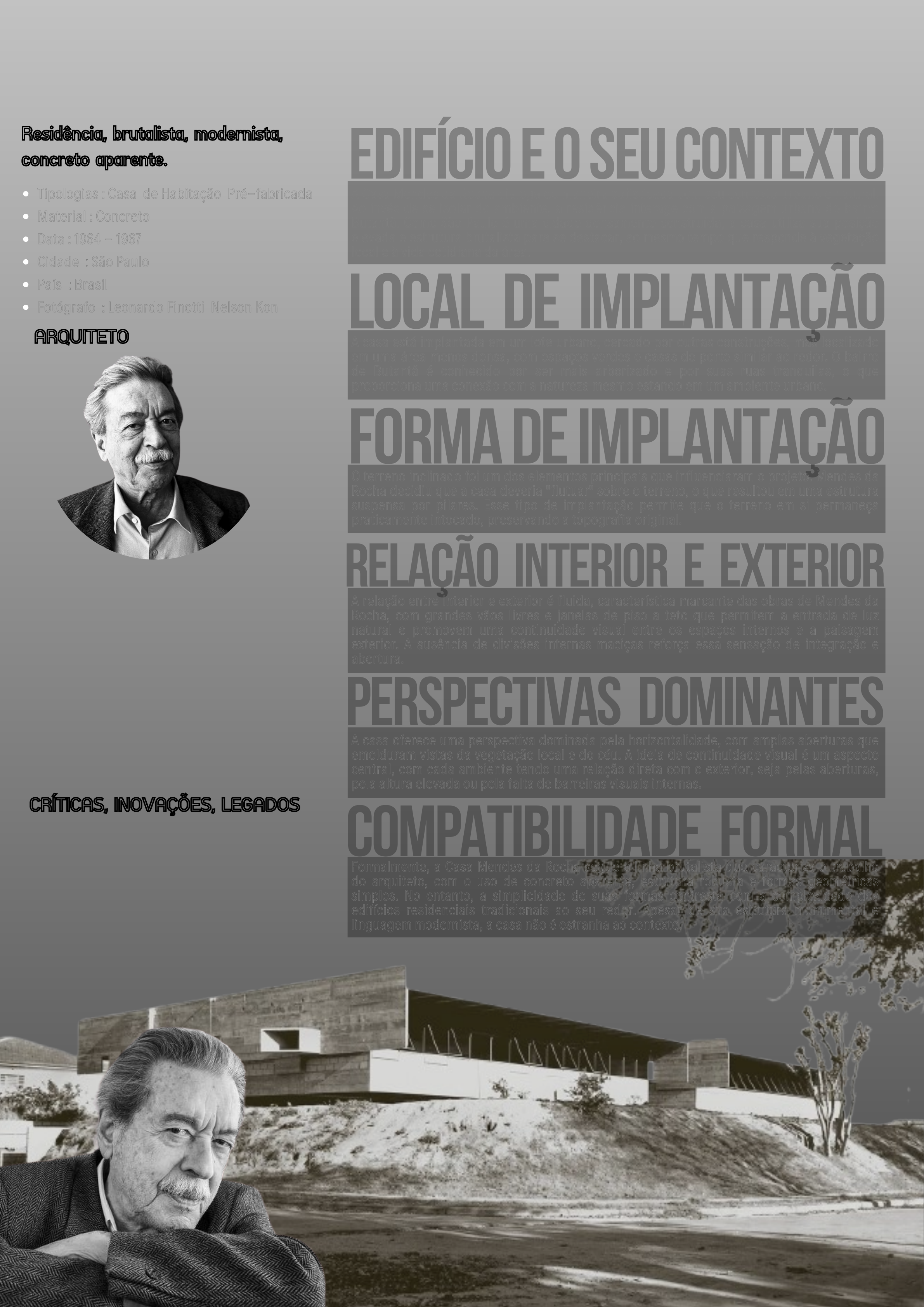 <p>Casa Mendes da Rocha, São Paulo</p><p>UNIGOIÁS - CENTRO UNIVERSITÁRIO DE GOIÁS | CURSO DE ARQUITETURA E URBANISMO | EST. ARQ - CASA</p><p>PROF. ANA ISABEL OLIVEIRA | ALUNA: EMILY HADASSA</p><p>“Paulo Mendes acredita que a arquitetura não</p><p>pode ser encarada como objeto pronto, estático</p><p>na paisagem e nem a cidade como um conjunto</p><p>de monumentos autorreferentes. No seu</p><p>entender, a arquitetura é modificadora do</p><p>espaço e da paisagem, atende social e</p><p>esteticamente as necessidades humanas”.</p><p>(SOUTO, 2010, p. 52)</p><p>CRÍTICAS, INOVAÇÕES, LEGADOSCRÍTICAS, INOVAÇÕES, LEGADOS</p><p>ARQUITETOARQUITETO</p><p>Paulo Mendes da Rocha foi um renomado</p><p>arquiteto brasileiro, nascido em Vitória, Espírito</p><p>Santo, em 1928, e falecido em 2021. Reconhecido</p><p>internacionalmente por suas contribuições</p><p>marcantes para a arquitetura moderna, ele</p><p>deixou um legado duradouro que influenciou</p><p>gerações de arquitetos e urbanistas.</p><p>"Minha arquitetura nasceu de uma necessidade</p><p>vital de expressão, de participação ativa na</p><p>transformação do mundo à minha volta."</p><p>- Paulo Mendes da Rocha</p><p>Tipologias : Casa de Habitação Pré-fabricada</p><p>Material : Concreto</p><p>Data : 1964 - 1967</p><p>Cidade : São Paulo</p><p>País : Brasil</p><p>Fotógrafo : Leonardo Finotti Nelson Kon</p><p>Tipologias : Casa de Habitação Pré-fabricada</p><p>Material : Concreto</p><p>Data : 1964 - 1967</p><p>Cidade : São Paulo</p><p>País : Brasil</p><p>Fotógrafo : Leonardo Finotti Nelson Kon</p><p>Sobre a casa que fez para si no bairro do Butantã, em São Paulo, Paulo Mendes da Rocha disse ter sido ela pensada como:“um ensaio de peças pré fabricadas”</p><p>Paulo Mendes da Rocha</p><p>LOCAL DE IMPLANTAÇÃO</p><p>A casa está implantada em um lote urbano, cercado por outras construções, mas localizado</p><p>em uma área menos densa, com espaços verdes e casas de porte similar ao redor. O bairro</p><p>de Butantã é conhecido por ser mais arborizado e por suas ruas tranquilas, o que</p><p>proporciona uma conexão com a natureza mesmo estando em um ambiente urbano.</p><p>A casa está implantada em um lote urbano, cercado por outras construções, mas localizado</p><p>em uma área menos densa, com espaços verdes e casas de porte similar ao redor. O bairro</p><p>de Butantã é conhecido por ser mais arborizado e por suas ruas tranquilas, o que</p><p>proporciona uma conexão com a natureza mesmo estando em um ambiente urbano.</p><p>Edifício e O seu Contexto</p><p>A Casa Mendes da Rocha dialoga de maneira sofisticada com seu contexto urbano e natural.</p><p>Ao invés de se isolar do ambiente, a residência interage com a paisagem urbana do bairro</p><p>Butantã. Como São Paulo é uma cidade densamente construída, a casa utiliza sua posição</p><p>elevada e estrutura brutalista para se destacar, ao mesmo tempo que responde à vegetação</p><p>local e à vida cotidiana da área.</p><p>A Casa Mendes da Rocha dialoga de maneira sofisticada com seu contexto urbano e natural.</p><p>Ao invés de se isolar do ambiente, a residência interage com a paisagem urbana do bairro</p><p>Butantã. Como São Paulo é uma cidade densamente construída, a casa utiliza sua posição</p><p>elevada e estrutura brutalista para se destacar, ao mesmo tempo que responde à vegetação</p><p>local e à vida cotidiana da área.</p><p>Forma de Implantação</p><p>O terreno inclinado foi um dos elementos principais que influenciaram o projeto. Mendes da</p><p>Rocha decidiu que a casa deveria "flutuar" sobre o terreno, o que resultou em uma estrutura</p><p>suspensa por pilares. Esse tipo de implantação permite que o terreno em si permaneça</p><p>praticamente intocado, preservando a topografia original.</p><p>O terreno inclinado foi um dos elementos principais que influenciaram o projeto. Mendes da</p><p>Rocha decidiu que a casa deveria "flutuar" sobre o terreno, o que resultou em uma estrutura</p><p>suspensa por pilares. Esse tipo de implantação permite que o terreno em si permaneça</p><p>praticamente intocado, preservando a topografia original.</p><p>Relação Interior e Exterior</p><p>A relação entre interior e exterior é fluida, característica marcante das obras de Mendes da</p><p>Rocha, com grandes vãos livres e janelas de piso a teto que permitem a entrada de luz</p><p>natural e promovem uma continuidade visual entre os espaços internos e a paisagem</p><p>exterior. A ausência de divisões internas maciças reforça essa sensação de integração e</p><p>abertura.</p><p>A relação entre interior e exterior é fluida, característica marcante das obras de Mendes da</p><p>Rocha, com grandes vãos livres e janelas de piso a teto que permitem a entrada de luz</p><p>natural e promovem uma continuidade visual entre os espaços internos e a paisagem</p><p>exterior. A ausência de divisões internas maciças reforça essa sensação de integração e</p><p>abertura.</p><p>Perspectivas Dominantes</p><p>A casa oferece uma perspectiva dominada pela horizontalidade, com amplas aberturas que</p><p>emolduram vistas da vegetação local e do céu. A ideia de continuidade visual é um aspecto</p><p>central, com cada ambiente tendo uma relação direta com o exterior, seja pelas aberturas,</p><p>pela altura elevada ou pela falta de barreiras visuais internas.</p><p>A casa oferece uma perspectiva dominada pela horizontalidade, com amplas aberturas que</p><p>emolduram vistas da vegetação local e do céu. A ideia de continuidade visual é um aspecto</p><p>central, com cada ambiente tendo uma relação direta com o exterior, seja pelas aberturas,</p><p>pela altura elevada ou pela falta de barreiras visuais internas.</p><p>Compatibilidade Formal</p><p>Formalmente, a Casa Mendes da Rocha segue a linha brutalista que caracteriza o trabalho</p><p>do arquiteto, com o uso de concreto aparente, estrutura robusta e formas geométricas</p><p>simple