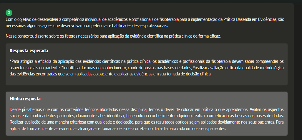 <p>2 Com objetivo de desenvolver a competência individual de acadêmicos e profissionais de fisioterapia para a implementação da Prática Baseada em são necessárias algumas ações que desenvolvam competências e habilidades desses profissionais. Nesse contexto, disserte sobre os fatores necessários para aplicação da evidência científica na prática clínica de forma eficaz Resposta esperada *Para atingira a eficácia da aplicação das evidências científicas na prática clínica, os acadêmicos e profissionais da fisioterapia devem saber compreender os aspectos sociais do paciente *identificar lacunas do conhecimento, conduzir buscas nas bases de dados, *realizar avaliação crítica da qualidade metodológica das evidências encontradas que sejam aplicadas ao paciente e aplicar as evidências em sua tomada de decisão clínica. Minha resposta Desde já sabemos que com os conteúdos teóricos abordados nessa disciplina, temos dever de colocar em prática que aprendemos. Avaliar aspectos socias e da morbidade dos pacientes, claramente saber identificar, baseando no conhecimento adquirido, realizar com eficácia as buscas nas bases de dados. Realizar avaliação de uma maneira criteriosa com qualidade e dedicação, para que os resultados obtidos sejam aplicados devidamente nos seus pacientes. Para aplicar de forma eficiente as evidencias alcançadas e tomar as decisões corretas no dia a dia para cada um dos seus pacientes.</p>