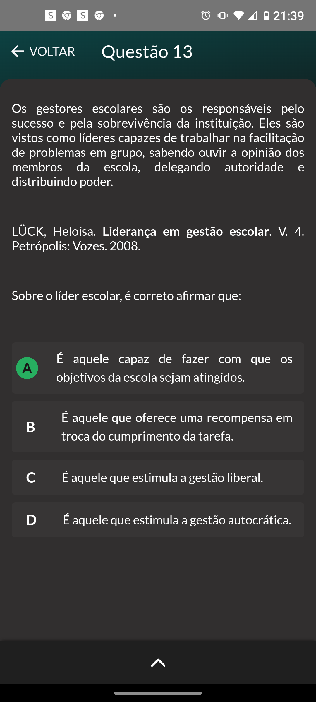<p>S S 21:39 VOLTAR Questão 13 Os gestores escolares são os responsáveis pelo sucesso e pela sobrevivência da instituição. Eles são vistos como líderes capazes de trabalhar na facilitação de problemas em grupo, sabendo ouvir a opinião dos membros da escola, delegando autoridade e distribuindo poder. LÜCK, Heloísa. Liderança em gestão escolar. V. 4. Vozes. 2008. Sobre líder escolar, é correto afirmar que: É aquele capaz de fazer com que os A objetivos da escola sejam atingidos. É aquele que oferece uma recompensa em B troca do cumprimento da tarefa. C É aquele que estimula a gestão liberal. D É aquele que estimula a gestão autocrática.</p>