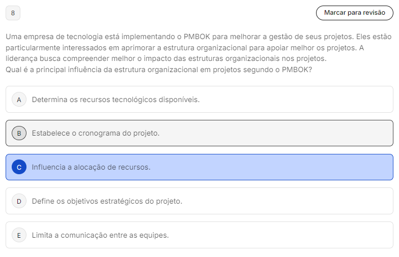 <p>8 Marcar para revisão Uma empresa de tecnologia está implementando O PMBOK para melhorar a gestão de seus projetos. Eles estão particularmente interessados em aprimorar a estrutura organizacional para apoiar melhor os projetos. A liderança busca compreender melhor impacto das estruturas organizacionais nos projetos. Qual é a principal influência da estrutura organizacional em projetos segundo PMBOK? A Determina os recursos tecnológicos disponíveis. B Estabelece cronograma do projeto. C Influencia a alocação de recursos. D Define os objetivos estratégicos do projeto. E Limita a comunicação entre as equipes.</p>