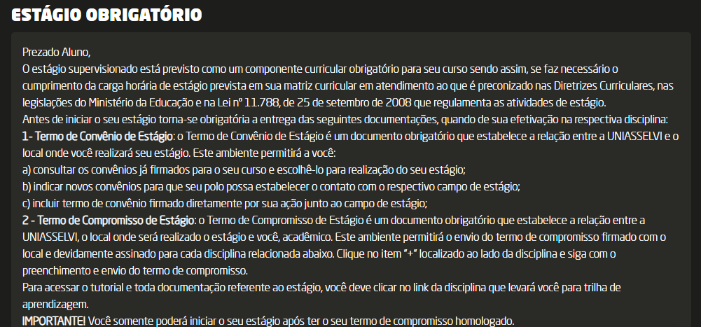 <p>ESTAGIO OBRIGATORIO Prezado Aluno, estágio supervisionado está previsto como um componente curricular obrigatório para seu curso sendo assim, se faz necessário cumprimento da carga horária de estágio prevista em sua matriz curricular em atendimento ao que é preconizado nas Diretrizes Curriculares, nas legislações do Ministério da Educação e na Lei 11.788, de 25 de setembro de 2008 que regulamenta as atividades de estágio. Antes de iniciar seu estágio torna-se obrigatória a entrega das seguintes documentações, quando de sua efetivação na respectiva disciplina: 1- Termo de Convênio de Estágio: Termo de Convênio de Estágio é um documento obrigatório que estabelece a relação entre a UNIASSELVI e local onde você realizará seu estágio. Este ambiente permitirá a você: a) consultar os convênios já firmados para seu curso e escolhê-lo para realização do seu estágio; b) indicar novos convênios para que seu polo possa estabelecer contato com respectivo campo de estágio; c) incluir termo de convênio firmado diretamente por sua ação junto ao campo de estágio; 2 - Termo de Compromisso de Estágio: Termo de Compromisso de Estágio é um documento obrigatório que estabelece a relação entre a UNIASSELVI, local onde será realizado estágio e você, acadêmico. Este ambiente permitirá envio do termo de compromisso firmado com 0 local e devidamente assinado para cada disciplina relacionada abaixo. Clique no item "+" localizado ao lado da disciplina e siga com preenchimento e envio do termo de compromisso. Para acessar tutorial e toda documentação referente ao estágio, você deve clicar no link da disciplina que levará você para trilha de aprendizagem. IMPORTANTED Você somente poderá iniciar seu estágio após ter seu termo de compromisso homologado.</p>