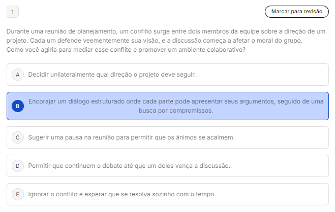 <p>1 Marcar para revisão Durante uma reunião de planejamento, um conflito surge entre dois membros da equipe sobre a direção de um projeto. Cada um defende veementemente sua visão, e a discussão começa a afetar moral do grupo. Como você agiria para mediar esse conflito e promover um ambiente colaborativo? A Decidir unilateralmente qual direção projeto deve seguir. Encorajar um diálogo estruturado onde cada parte pode apresentar seus argumentos, seguido de uma B busca por compromissos. C Sugerir uma pausa na reunião para permitir que os ânimos se D Permitir que continuem debate até que um deles vença a discussão. E Ignorar O conflito e esperar que se resolva sozinho com tempo.</p>