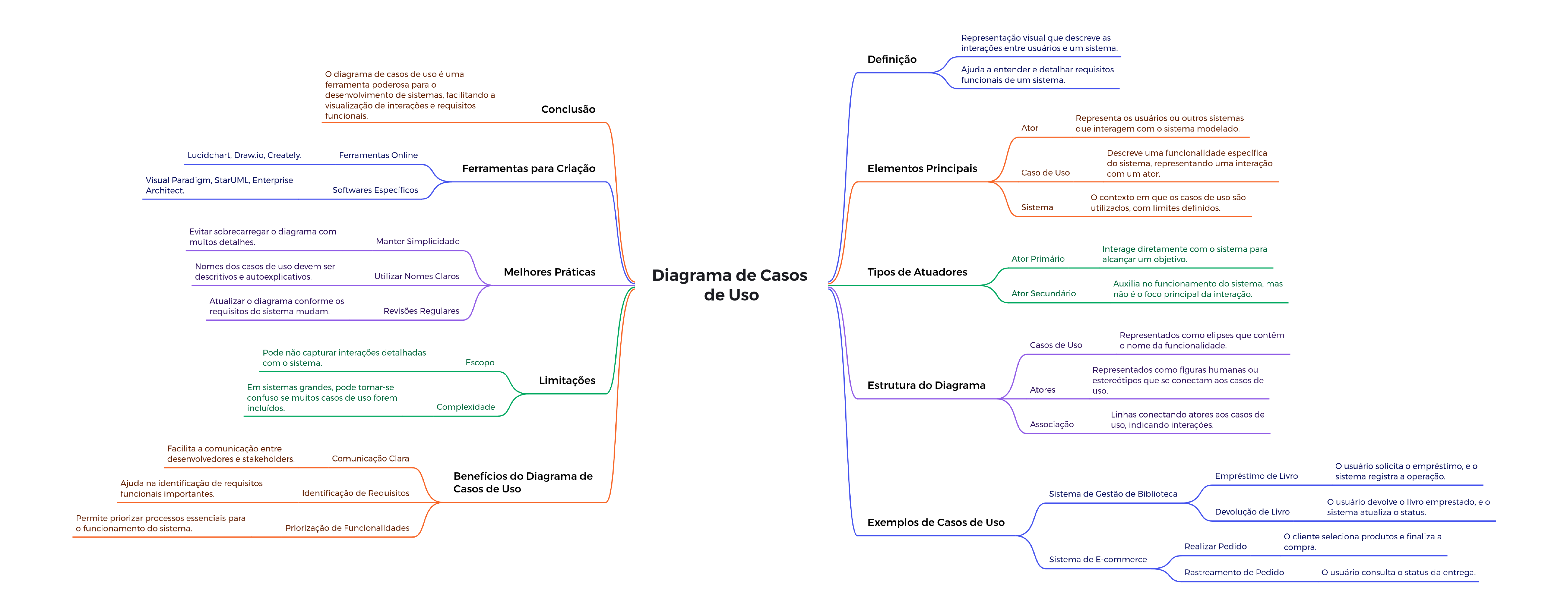 <p>Diagrama de Casos</p><p>de Uso</p><p>Definição</p><p>Representação visual que descreve as</p><p>interações entre usuários e um sistema.</p><p>Ajuda a entender e detalhar requisitos</p><p>funcionais de um sistema.</p><p>Elementos Principais</p><p>Ator</p><p>Representa os usuários ou outros sistemas</p><p>que interagem com o sistema modelado.</p><p>Caso de Uso</p><p>Descreve uma funcionalidade específica</p><p>do sistema, representando uma interação</p><p>com um ator.</p><p>Sistema</p><p>O contexto em que os casos de uso são</p><p>utilizados, com limites definidos.</p><p>Tipos de Atuadores</p><p>Ator Primário</p><p>Interage diretamente com o sistema para</p><p>alcançar um objetivo.</p><p>Ator Secundário</p><p>Auxilia no funcionamento do sistema, mas</p><p>não é o foco principal da interação.</p><p>Estrutura do Diagrama</p><p>Casos de Uso</p><p>Representados como elipses que contêm</p><p>o nome da funcionalidade.</p><p>Atores</p><p>Representados como figuras humanas ou</p><p>estereótipos que se conectam aos casos de</p><p>uso.</p><p>Associação</p><p>Linhas conectando atores aos casos de</p><p>uso, indicando interações.</p><p>Exemplos de Casos de Uso</p><p>Sistema de Gestão de Biblioteca</p><p>Empréstimo de Livro</p><p>O usuário solicita o empréstimo, e o</p><p>sistema registra a operação.</p><p>Devolução de Livro</p><p>O usuário devolve o livro emprestado, e o</p><p>sistema atualiza o status.</p><p>Sistema de E-commerce</p><p>Realizar Pedido</p><p>O cliente seleciona produtos e finaliza a</p><p>compra.</p><p>Rastreamento de Pedido O usuário consulta o status da entrega.</p><p>Benefícios do Diagrama de</p><p>Casos de Uso</p><p>Comunicação Clara</p><p>Facilita a comunicação entre</p><p>desenvolvedores e stakeholders.</p><p>Identificação de Requisitos</p><p>Ajuda na identificação de requisitos</p><p>funcionais importantes.</p><p>Priorização de Funcionalidades</p><p>Permite priorizar processos essenciais para</p><p>o funcionamento do sistema.</p><p>Limitações</p><p>Escopo</p><p>Pode não capturar interações detalhadas</p><p>com o sistema.</p><p>Complexidade</p><p>Em sistemas grandes, pode tornar-se</p><p>confuso se muitos casos de uso forem</p><p>incluídos.</p><p>Melhores Práticas</p><p>Manter Simplicidade</p><p>Evitar sobrecarregar o diagrama com</p><p>muitos detalhes.</p><p>Utilizar Nomes Claros</p><p>Nomes dos casos de uso devem ser</p><p>descritivos e autoexplicativos.</p><p>Revisões Regulares</p><p>Atualizar o diagrama conforme os</p><p>requisitos do sistema mudam.</p><p>Ferramentas para Criação</p><p>Ferramentas OnlineLucidchart, Draw.io, Creately.</p><p>Softwares Específicos</p><p>Visual Paradigm, StarUML, Enterprise</p><p>Architect.</p><p>Conclusão</p><p>O diagrama de casos de uso é uma</p><p>ferramenta poderosa para o</p><p>desenvolvimento de sistemas, facilitando a</p><p>visualização de interações e requisitos</p><p>funcionais.</p>