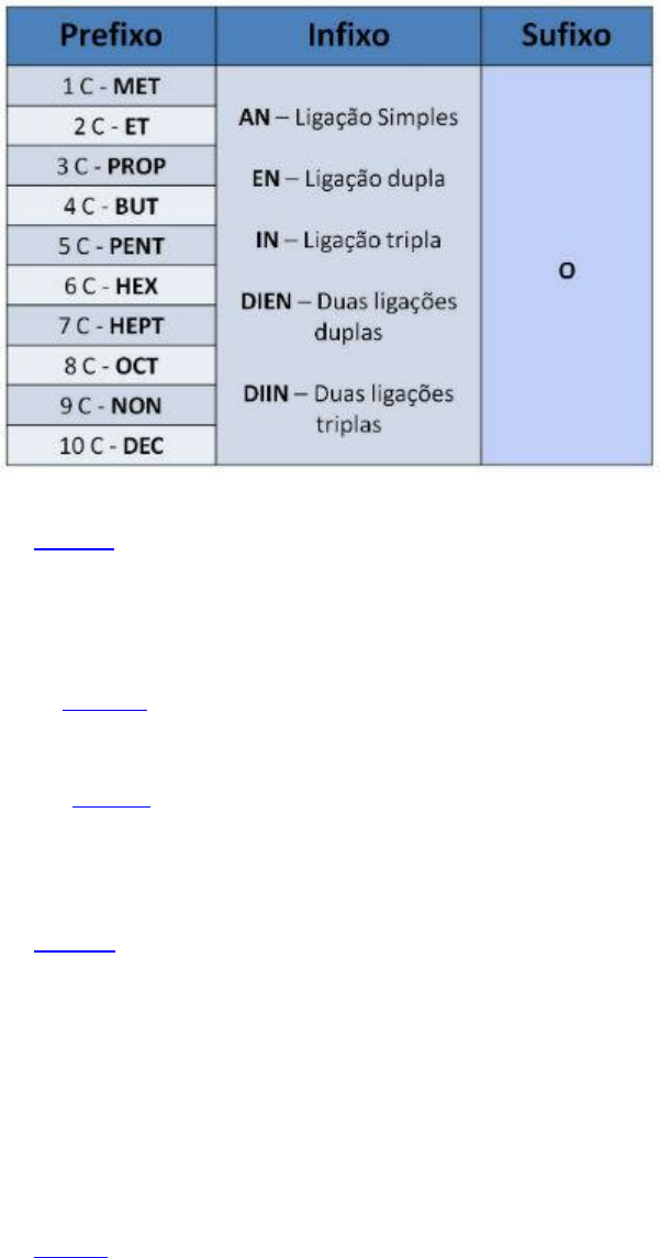 <p>Nomenclatura de hidrocarbonetos</p><p>Os hidrocarbonetos são os compostos químicos formados por carbono e hidrogênio.</p><p>De modo geral, a nomenclatura dos hidrocarbonetos segue a seguinte ordem:</p><p>Prefixo: Indica o número de carbonos presentes na cadeia principal;</p><p>Infixo: Indica o tipo de ligação encontrada na cadeia;</p><p>Sufixo: Indica a função orgânica dos hidrocarbonetos terminando com a letra "o".</p><p>Nomenclatura dos alcanos</p><p>Os alcanos apresentam cadeia aberta formada por ligações simples. Eles possuem a nomenclatura mais</p><p>simples.</p><p>A nomenclatura dos alcanos não ramificados é dado pelo prefixo + ano. O prefixo indica o número de</p><p>carbonos. A terminação ANO deriva das ligações simples e do sufixo dos hidrocarbonetos.</p><p>Exemplos:</p><p>CH4 = Metano (1 carbono)</p><p>C2H6 = Etano (2 carbonos)</p><p>C3H8 = Propano (3 carbonos)</p><p>C4H10 = Butano (4 carbonos)</p><p>C5H12 = Pentano (5 carbonos)</p><p>C6H14 = Hexano (6 carbonos)</p><p>Nomenclatura dos alcenos</p><p>Os alcenos são formados por cadeias carbônicas abertas que apresentam uma dupla ligação.</p><p>A nomenclatura dos alcenos não ramificados é formada pelo prefixo + eno.</p><p>Exemplos:</p><p>Propeno</p><p>Em cadeias maiores é preciso indicar a posição da dupla ligação. A numeração deve iniciar da extremidade</p><p>mais próxima da dupla ligação.</p><p>But-1-eno ou 1-buteno</p><p>But-2-eno ou 2-buteno</p><p>Nomenclatura dos alcinos</p><p>Os alcinos são formados por cadeias carbônicas que apresentam ligações triplas.</p><p>A nomenclatura dos alcinos é dada pelo prefixo + ino.</p><p>Da mesma forma como ocorre com os alcenos, a cadeia mais longa é a principal e ela deve conter a ligação</p><p>tripla.</p><p>A numeração também deve iniciar da extremidade mais próxima da tripla ligação.</p><p>Exemplos:</p><p>https://www.todamateria.com.br/alcanos/</p><p>https://www.todamateria.com.br/metano/</p><p>https://www.todamateria.com.br/butano/</p><p>https://www.todamateria.com.br/alcenos/</p><p>https://www.todamateria.com.br/alcinos/</p><p>Etino</p><p>Propino</p><p>But-1-ino</p><p>Nomenclatura dos hidrocarbonetos ramificados</p><p>Quando os hidrocarbonetos são ramificados, além do nome da cadeia, as ramificações também devem ser</p><p>indicadas.</p><p>Para isso, deve-se considerar a cadeia mais longa como a cadeia principal, a qual é numerada e indicam-se</p><p>as posições das ramificações.</p><p>Além disso, a numeração da cadeia deve ser feita de modo que as ramificações recebam o menor número</p><p>possível.</p><p>Caso exista mais de uma ramificação, as regras são as seguintes:</p><p>1. Quando existem duas ou mais ramificações iguais elas são indicadas usando os prefixos di, tri, tetra, etc.</p><p>2. Quando as ramificações são diferentes elas são citadas em ordem alfabética.</p><p>3. No caso de alcenos e alcinos, a cadeia principal é aquela que apresenta a dupla ou tripla ligação. A</p><p>numeração da cadeia deve se iniciar da extremidade mais próxima da ligação, independente das</p><p>ramificações.</p><p>Exemplos:</p><p>1. Alcano com ramificação: 2.2.4-trimetil-pentano</p><p>2. Alceno com ramificação: 4-metil-2-penteno</p><p>3. Alcino com ramificação: 4-metil-pent-2-ino</p><p>Nomenclatura dos alcadienos</p><p>A nomenclatura dos alcadienos termina com o sufixo dieno. Lembre-se que a cadeia mais longa e principal</p><p>deve conter as duas duplas ligações.</p><p>Além disso, a numeração da cadeia deve ser feita de modo que as posições das duplas ligações e</p><p>ramificações seja o menor possível.</p><p>Exemplos:</p><p>Buta-1,3-dieno ou 1,3-butadieno</p><p>Nomenclatura dos ciclanos</p><p>A nomenclatura dos ciclanos é dada por ciclo + ano.</p><p>Caso existam ramificações, elas são numeradas a partir da ramificação mais simples e seguindo o ciclo no</p><p>sentido horário ou anti-horário, de modo que as outras ramificações recebam a menor numeração</p><p>possível.</p><p>Nomenclatura de hidrocarbonetos aromáticos</p><p>Os hidrocarbonetos aromáticos recebem uma denominação particular ou podem obedecer as regras</p><p>IUPAC, conforme as seguintes situações:</p><p>1. Hidrocarbonetos aromáticos com um único anel benzênico e ramificações saturadas:</p><p>A nomenclatura é dada pelo termo benzeno, após os nomes das ramificações.</p><p>A numeração deve iniciar a partir da ramificação mais simples e seguir de modo que as demais recebam a</p><p>menor numeração possível.</p><p>No caso de duas ramificações, são usados os prefixos orto, meta e para.</p><p>https://www.todamateria.com.br/alcadienos/</p><p>https://www.todamateria.com.br/ciclanos/</p><p>https://www.todamateria.com.br/hidrocarbonetos-aromaticos/</p><p>2. Uso de nomes particulares:</p><p>É comum que alguns hidrocarbonetos aromáticos sejam designados pelos nomes particulares.</p>