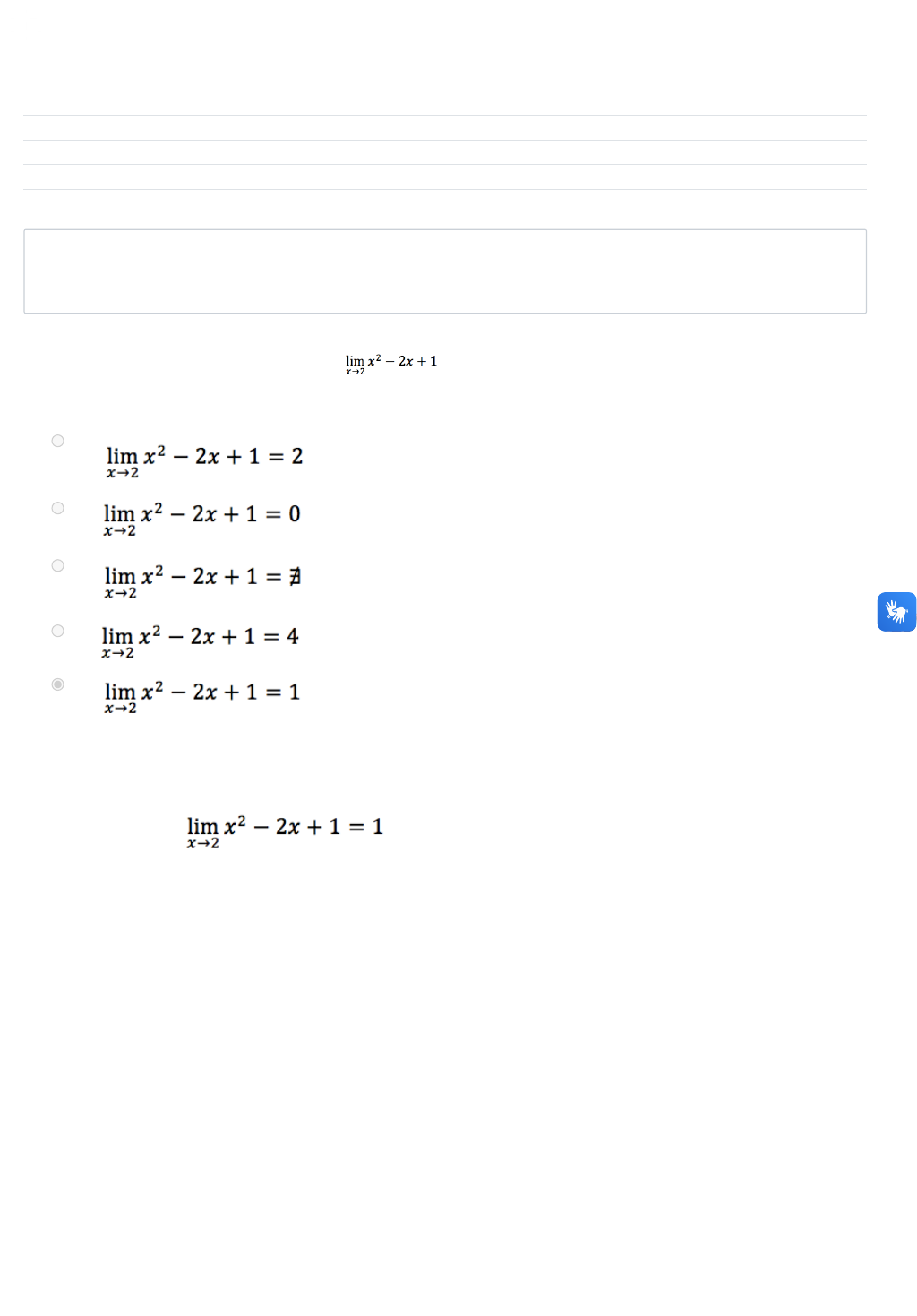 <p>Iniciado em segunda-feira, 16 set. 2024, 20:14</p><p>Estado Finalizada</p><p>Concluída em segunda-feira, 16 set. 2024, 20:36</p><p>Tempo empregado 21 minutos 59 segundos</p><p>Avaliar 0,30 de um máximo de 0,75(40%)</p><p>Questão 1</p><p>Correto</p><p>Atingiu 0,15 de 0,15</p><p>Usando a ideia intuitiva de limite, determine o e marque a alternativa correta:</p><p>Escolha uma opção:</p><p>a.</p><p>b.</p><p>c.</p><p>d.</p><p>e. ✓</p><p>Sua resposta está correta.</p><p>A resposta correta é:</p><p>Questão 2</p><p>Incorreto</p><p>Atingiu 0,00 de 0,15</p><p>Usando a ideia intuitiva de limite, determine o e marque a alternativa correta:</p><p>Escolha uma opção:</p><p>a.</p><p>b.</p><p>c. ×</p><p>d.</p><p>e.</p><p>Sua resposta está incorreta.</p><p>A resposta correta é:</p><p>Questão 3</p><p>Incorreto</p><p>Atingiu 0,00 de 0,15</p><p>De acordo com a função g(x) ilustrada, analise as alternativas e marque a alternativa correta.</p><p>Escolha uma opção:</p><p>a. F; F; F; F</p><p>b. V; F; V; V</p><p>c. F; F; V; F</p><p>d. V; V; V; F ×</p><p>e. V; F; V; F</p><p>Sua resposta está incorreta.</p><p>A resposta correta é: V; F; V; F</p><p>Questão 4</p><p>Correto</p><p>Atingiu 0,15 de 0,15</p><p>Escolha uma opção:</p><p>a. b, c, d, a</p><p>b. a, d, b, c</p><p>c. a, b, c , d ✓</p><p>d. c, d, a, b</p><p>e. d, a, b, c</p><p>Sua resposta está correta.</p><p>A resposta correta é: a, b, c , d</p><p>Questão 5</p><p>Incorreto</p><p>Atingiu 0,00 de 0,15</p><p>Escolha uma opção:</p><p>a. F; F; F; F</p><p>b. V; V; V; F ×</p><p>c. F; F; F; V</p><p>d. V; F; F; F</p><p>e. V; F; F; V</p><p>Sua resposta está incorreta.</p><p>A resposta correta é: V; F; F; F</p>
