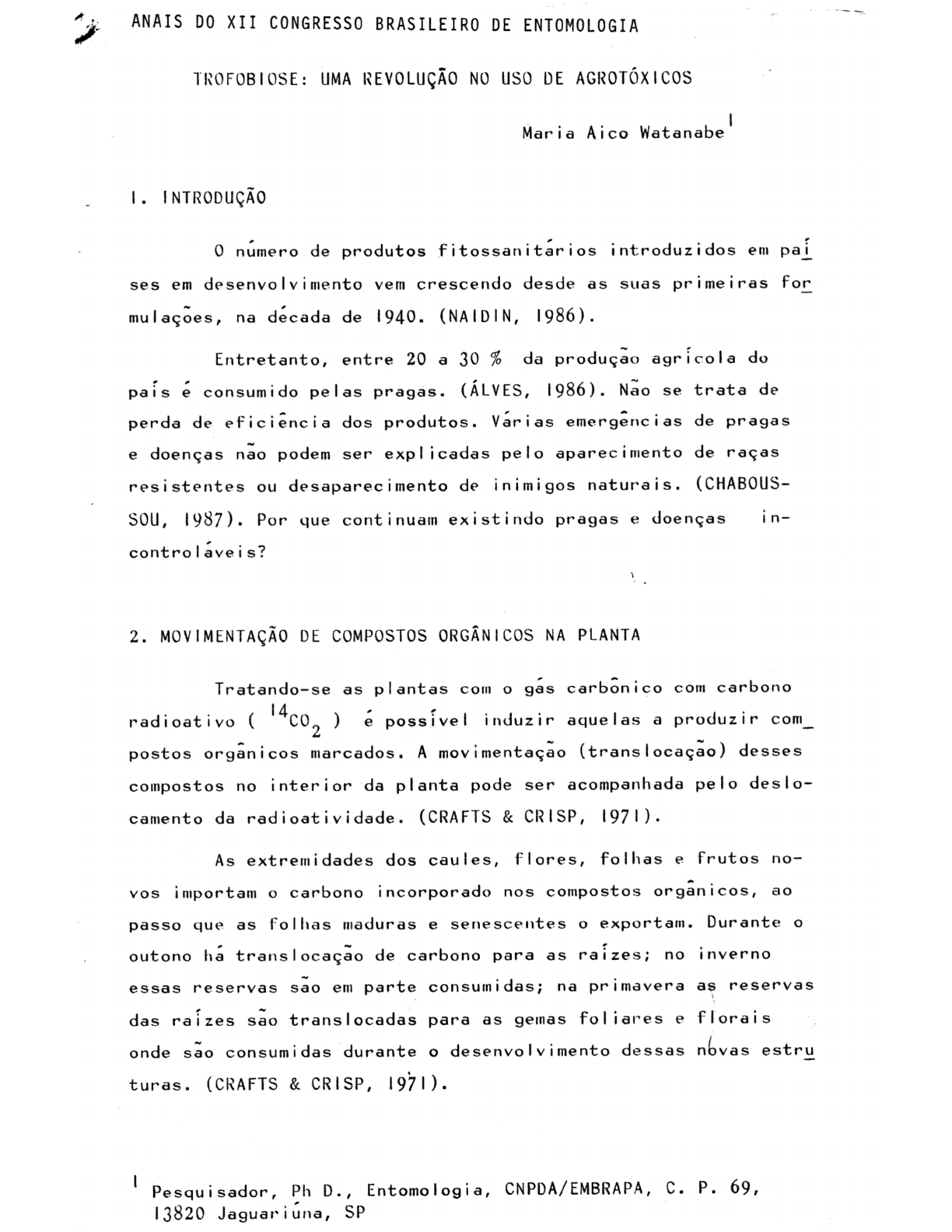 <p>ANAIS XII CONGRESSO BRASILEIRO DE ENTOMOLOGIA TROFOBIOSE: UMA REVOLUÇÃO NO uso DE Maria Aico Watanabe INTRODUÇÃO 0 numero de produtos fitossanitarios introduzidos em pai ses em desenvolvimento vem crescendo desde as suas primeiras for mulaçoes, na decada de 1940. (NAIDIN, 1986). Entretanto, entre 20 a 30 % da do pais consumido pelas pragas. (ÁLVES, 1986). Nao se trata de perda de eficiencia dos produtos. Varias emergencias de pragas e doenças nao podem ser explicadas pelo aparecimento de raças resistentes ou desaparecimento de inimigos naturais. (CHABOUS- sou, 1987). Por que continuam existindo pragas e doenças in- controlaveis? 2. MOVIMENTAÇÃO DE COMPOSTOS ORGÂNICOS NA PLANTA Tratando-se as plantas com o gas carbonico com carbono radioativo ( 14 2 ) e possivel induzir aquelas a produzir com postos organicos marcados. A movimentação (translocação) desses compostos no interior da planta pode ser acompanhada pelo deslo- camento da radioatividade. (CRAFTS & CRISP, 1971). As extremidades dos caules, flores, folhas e frutos no- vos importam o carbono incorporado nos compostos organicos, ao passo que as folhas maduras e senescentes o exportam. Durante o outono ha translocação de carbono para as raizes; no inverno essas reservas sao em parte consumidas; na primavera as reservas das raizes sao translocadas para as gemas foliares e florais onde sao consumidas durante o desenvolvimento dessas novas estru turas. (CRAFTS & CRISP, 1971). I Pesquisador, Ph D., Entomologia, CNPDA/EMBRAPA, C. P. 69, 13820 Jaguariuna, SP</p><p>amino-acidos e açucares simples sao utilizados pela planta para formação de compostos organicos mais complexos co- mo proteinas e amido, respectivamente. As proteinas entram na dos tecidos do vegetal, ao passo que os amidos sao armazenados nos orgaos de reserva. As folhas e frutos novos uti- lizam os amino-acidos e açucares simples resultantes da degrada de proteinas e amido ou aqueles compostos diretamente apos a sua Assim, em certas estruturas da planta, conforme a epoca do ano e o estagio fenologico, ha acumulo de amino-aci- dos e carboidratos simples. Essa distribuição de compostos so- luveis na planta resulta de atividades fisiologicas normais do vegetal. (CRAFTS & CRISP, 1971). 3. LOCALIZAÇÃO DOS FITÓFAGOS E DISTRIBUIÇÃO DE ALIMENTOS NA PLANTA pulgoes sao insetos sugadores que obtem os alimentos introduzindo o aparelho bucal nos vasos do floema. 0 pulgao da roseira, citros e morangueiro ataca preferencialmente folhas e ramos novos, que sao orgaos importadores de amino-acidos e açu- cares. afideos Myzus persicae (Sulzer, 1776) e Aphis fabae tendem a se localizar em folhas novas e senescentes. (CRAFTS & CRISP, 1971). Em platano, os pulgoes tendem a se instalar em caules novos e peciolos quando as folhas estao em desenvolvi- mento. Mais tarde quando a folha passa a sintetizar e exportar os compostos organicos a outras partes do vegetal, os pulgoes se localizarao no limbo. (DIXON, 1975). 0 acaro rajado Tetranychus urticae (Koch) multiplica- se mais rapidamente em morangueiros com frutos que naqueles na fase vegetativa. As folhas de morangueiro em frutificação con- tem maior teor de sacarose. A localização dos fitofagos bem como o seu deslocamen- to no hospedeiro, indica a distribuição dos alimentos no vege- tal e a mudança dessa distribuição com os estagios fenologicos. (DIXON, 1975).</p><p>4. REQUISITOS NUTRICIONAIS DE FITÓFAGOS DADD & MITTLER (1965) demonstraram experimentalmente que as larvas de afideos Myzus persicae morrem na ausencia de amino-acidos e sacarose na dieta. A concentração otima de sa- carose para larvas e adultos esta entre 10 - 20 %. Em teores inferiores a 2 % de amino-acidos, a taxa de crescimento das larvas cai abruptamente. A longevidade dos adultos nao e afe- tada pela de amino-acidos; porem a e prejudicada quando nao sao fornecidos esses compostos na ali- requisitos nutricionais mudam com o estagio de desenvolvimento dessa especie. 5. SISTEMA ENZIMÁTICO DE FITÓFAGOS De acordo com CHABOUSSOU (1987), algumas especies de artropodos fitofagos devido ao seu aparelho enzimatico, neces- sitam ingerir compostos nitrogenados sob a forma de amino-aci- dos e carboidratos sob a forma de açucares simples. As larvas de Rhynchosciara americana alimentam-se na natureza de plantas em decomposição encontradas em pomares de banana do litoral. No laboratorio sao criadas com folhas de ba- tata doce moida. (LARA et al., 1965, citados por TERRA et al., 1979). Em seu tubo digestivo, TERRA et al. ( (1979) encontraram um sistema enzimatico bastante complexo, capaz de digerir ami- do, celulose, lipídios e Em coleopteros que se alimentam de cereais, como Sito- philus oryzae (L., 1763), S. granarius (L.), Tenebrio molitor (L., 1758) e Tribolium castaneum (Hebst, 1797), alta a rela- de enzimas digestivas amilase/proteinase. Já nos insetos que se alimentam de produtos animais, ou alimentos com alto teor de proteinas, como Dermestes maculatus (De Geer), Attagenus unicolor (Brahm) (A. megatoma (F.)), Anthrenus flavipes (Le Con te) e Tineola bisselliella (Hummel), e baixo o valor da relação amilase/proteinase. Anagasta kuehniella (Zeller, 1879) e Plodia interpunctella (Hübner), alimentam-se de cereais, mas tem ha-</p><p>bitos alimentares mais variados. Apresentam a relaçao amilase/ proteinase intermediaria entre os dois grupos de coleopteros. (BAKER, 1986). No Acyrthosiphon pisum (Harris), SRIVASTAVA & AUCLAIR (1962), citados por AUCLAIR (1963) foi constatada for- te atividade de amilase. Mas acredita-se que a enzima seja pro- duzida por bacterias que vivem em seu trato digestivo. Durante a os artropodos desenvolveram dife- rentes sistemas enzimaticos, capacitando-se alguns a se alimen- tarem de amidos e lipídios. Os que nao apresentam proteinases e amilases necessitam consumir compostos nitrogena- dos sob a forma de amino-acidos e carboidratos sob a forma de açucares simples. 6. LOCALIZAÇÃO DA FOLHA E TEOR DE E TANINO YOKOYAMA &