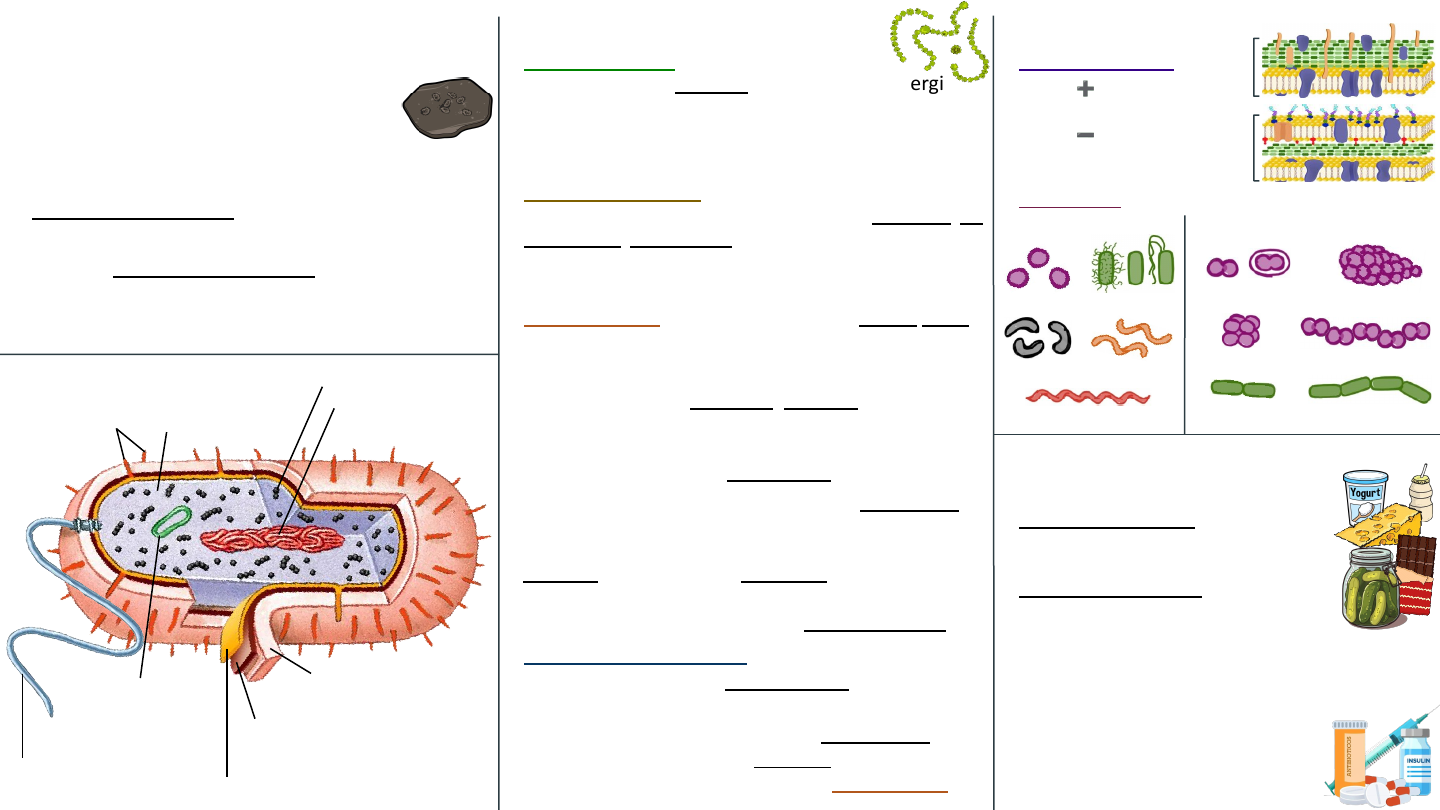 <p>Classificação</p><p>1) Coloração GRAM:</p><p>• GRAM➕: parede espessa</p><p>.</p><p>• GRAM➖: parede fina,</p><p>entre duas membranas</p><p>2) Morfologia:</p><p>Importância econômica</p><p>►Produção de alimentos:</p><p>• fermentação láctica (Lactobacillus):</p><p>queijos, iogurte, leite fermentado, .</p><p>alimentos em conserva, molhos.</p><p>• fermentação acética (Acetobacter):</p><p>vinagre, chocolate.</p><p>► Indústria química: acetona, álcool gel, etanol</p><p>(biocombustível), aditivos alimentares, etc.</p><p>►Medicamentos e cosméticos:</p><p>• Biofármacos: insulina, enzimas,</p><p>vacinas, antibióticos, etc.</p><p>• Botox: toxina botul. (Clostridium)</p><p>► Existem há pelo menos 3,8 bilhões de</p><p>anos → primeiros seres vivos da Terra!</p><p>► unicelulares e microscópicos (entre 0,5 e 10 nm)</p><p>► procariontes (pro = antes, karyo = núcleo): células</p><p>sem carioteca (núcleo) e sem organelas;</p><p>► 10.000 espécies descritas, mas estima-se que pode</p><p>chegar a 1,6 milhão de espécies no planeta;</p><p>► antigo reino Monera, agora 2 domínios: Eubacteria</p><p>(bactérias e cianobactérias) e Archaea (arqueas)</p><p>parede celular (composta por</p><p>peptidoglicanos) → protege e</p><p>mantém o formato da bactéria</p><p>citoplasma</p><p>membrana plasmática (lipoproteica)</p><p>nucleóide (DNA)</p><p>cromossomo circular</p><p>único emaranhado</p><p>ribossomos síntese protéica</p><p>cápsula gelatinosa</p><p>(composta por polissacarídeos)</p><p>Nutrição e Metabolismo</p><p>1)Fotoautotróficas: sintetizam sua matéria</p><p>orgânica usando luz solar como fonte de energia</p><p>• fotossíntese oxigênica: cianobactérias (azuladas);</p><p>• fotossíntese anoxigênica (não libera O2): bactérias</p><p>verdes filamentosas, proteobactérias (púrpuras);</p><p>2)Quimioautotróficas (quimiossíntese): sintetizam</p><p>matéria orgânica usando energia da oxidação de</p><p>compostos inorgânicos (minerais): ferro, enxofre,</p><p>amônia. Ex: tiobactérias, nitrobactérias, arqueas.</p><p>↳ vivem no solo e em fontes termais submarinas.</p><p>3)Heterotróficas: obtêm nutrientes de outros seres</p><p>• saprófagas (decompositoras): reciclam a matéria</p><p>orgânica morta, repondo nutrientes do solo.</p><p>• parasitas: causam infecções /doenças (bacterioses)</p><p>↳ Ex: pneumonia, tuberculose, tétano, leptospirose,</p><p>cólera, botulismo, febre maculosa, sífilis, gonorreia;</p><p>↳ são combatidas com antibióticos.</p><p>• simbiontes/mutualistas: associações beneficiam as</p><p>bactérias e seus hospedeiros (defesa, nutrição)</p><p>↳ probióticos (microbiota intestinal) → auxiliam na</p><p>digestão e na síntese de vitaminas (K, B12)</p><p>↳ bacteriorrizas: colônias em raízes de plantas</p><p>leguminosas: fixam N2 do ar → fertilizam o solo.</p><p>▶ Metabolismo energético: muito variado!</p><p>• aeróbias obrigatórias: dependem de oxigênio (O2)</p><p>• anaeróbias facultativas: vivem com ou sem O2</p><p>• anaeróbias estritas/obrigatórias: não toleram O2!</p><p>↳ só vivem em ambientes anóxicos</p><p>↳ em vez da respiração, realizam a fermentação.</p><p>flagelo</p><p>locomoção</p><p>plasmídeos</p><p>fragmentos extras</p><p>de DNA (contêm</p><p>genes de resistência</p><p>a antibióticos)</p><p>fímbrias / pili</p><p>locomoção e</p><p>adesão a</p><p>substratos</p><p>Estrutura celular</p><p>Bactérias e Arqueas</p><p>cocos bacilos</p><p>vibriões espirilos</p><p>espiroqueta</p><p>diplococos estafilococos</p><p>diplobacilos estreptobacilos</p><p>sarcina estreptococos</p><p>● Colônias (cocos e bacilos)● Individuais:</p><p>Cianobactérias (kyanos = azul)</p><p>► Possuem membranas internas (tilacóides),</p><p>com pigmentos fotossintetizantes: clorofila A</p><p>(= plantas) e carotenóides azuis (ficocianina)</p><p>• precursoras da fotossíntese, oxigenaram o</p><p>planeta (maiores produtoras de O2 até hoje)</p><p>• são ancestrais de algas e plantas → cloroplasto</p><p>se originou delas!</p><p>► Maioria aquáticas, formam o fitoplâncton</p><p>• base das cadeias alimentares aquáticas</p><p>► Estromatólitos: rochas sedimentares formadas</p><p>por cianobactérias marinhas</p><p>• camadas de minerais aprisionados</p><p>no muco de colônias bacterianas</p><p>• fósseis mais antigos (3,4 bi de anos)</p><p>► Recuperação ambiental: absorvem metais</p><p>pesados (biorremediação), dissolvem poluentes</p><p>(biodegradação)</p><p>► Algumas terrestres, vivem em simbiose</p><p>com fungos, formando os liquens →</p><p>Seres procariontes Arqueas (archaios = antigo, velho)</p><p>► Descobertas na déc. 1970</p><p>• diferenças na membrana: éter, glicerol-1-fosfato</p><p>• parede (sem peptidoglicano)</p><p>• processamento do material genético (replicação,</p><p>transcrição e tradução) é igual ao dos Eukarya</p><p>► maioria é quimioautotrófica</p><p>► extremófilas: vida em ambientes extremos</p><p>• termófilas: alta temperatura (ex: gêiseres)</p><p>• halófilas (⬆salinidade), acidófilas (⬇ph)</p><p>• metanogênicas (produzem CH4): anaeróbias estritas</p><p>→ pântanos, estômago de ruminantes</p><p>Eubacteria Archaea Eukarya</p><p>Os 3 Domínios da Vida</p><p>Reprodução: assexuada</p><p>► fissão binária (cissiparidade): muito rápida</p><p>► esporulação: formação do endósporo (forma</p><p>dormente, resistente a condições adversas)</p><p>Recombinação: transferência horizontal</p><p>de DNA (plasmídeos) entre bactérias</p><p>↳ aumenta variabilidade entre os indivíduos,</p><p>mas não é considerada reprodução sexuada!</p><p>► Conjugação: plasmídeo é transferido entre</p><p>bactérias por meio de uma ponte (pilus);</p><p>► Transformação: absorção de fragmentos de</p><p>DNA (no ambiente) de bactérias mortas</p><p>► Transdução: segmentos de DNA são passa