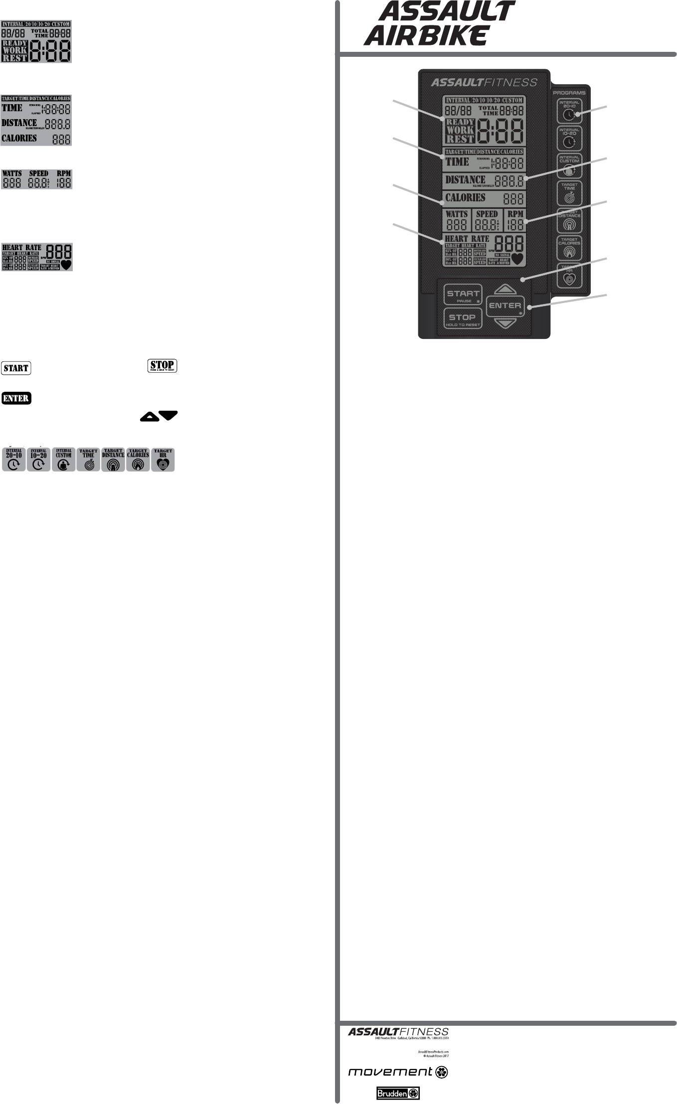 <p>Pilhas. O console Assault AirBike funciona com duas (2) pilhas AA (não inclusas). O</p><p>compartimento da bateria se encontra na parte traseira do console.</p><p>Unidades Métricas e Padrão - Modo de Con!guração. A Assault AirBike vem de fábrica com as</p><p>unidades de distância de!nidas em milhas. A distância e a velocidade serão calculadas e exibidas em</p><p>milhas e milhas por hora.</p><p>Para alternar as unidades de exibição do console entre milhas e quilômetros, pressione e mantenha</p><p>pressionadas as teclas START e ENTER simultaneamente por dois (2) segundos enquanto o console</p><p>está no modo Ready. O Modo de Con!guração será iniciado e a faixa "Distância" será exibida na tela</p><p>LCD. “Quilômetros” ou “milhas” piscarão para indicar a con!guração atual. Pressione a tecla PARA</p><p>CIMA ou PARA BAIXO para alternar entre as duas con!gurações. Pressione a tecla ENTER para aceitar</p><p>a opção exibida e iniciar o modo Ready.</p><p>RECURSOS DE PROGRAMAÇÃO</p><p>program will run immediately.</p><p>Finalizar: O programa será encerrado automaticamente quando todos os intervalos tiverem sido</p><p>processados. Para !nalizar o programa a qualquer momento, pressione a tecla STOP. O</p><p>Resumo de Treino será iniciado e os registros do treino serão exibidos.</p><p>Programas de META DE TEMPO, META DE DISTÂNCIA E META DE CALORIAS. Os programas de</p><p>Meta de Tempo, Meta de Distância e Meta de Calorias funcionam de forma idêntica. Em casa</p><p>programa, o usuário pode de!nir um valor e o programa continuará até que esse valor seja alcançado.</p><p>Iniciar: Pressione a tecla do programa desejado.</p><p>Con!guração: Ao executar os programas pela primeira vez (ou após a reinicialização</p><p>do console), o visor exibirá o valor padrão (piscando). Ajuste o valor exibido</p><p>com as teclas PARA CIMA ou PARA BAIXO e pressione seguidas da tecla ENTER</p><p>GUIA QUICK</p><p>START</p><p>DESCRIÇÃO DO CONSOLE</p><p>Painel de Exibição de Intervalo. O Painel de Exibição do Intervalo fornecerá todos os detalhes da</p><p>exibição para os Intervalo 20/10, Intervalo 10/20 e Programa Interval Custom. A</p><p>faixa superior indicará qual programa do intervalo está em execução. Esse visor</p><p>mostrará se o intervalo atualmente em execução é um período de trabalho ou</p><p>repouso. O Visor de Tempo Total contará o tempo total de execução do programa,</p><p>enquanto o Visor Numérico contará o tempo do segmento de</p><p>Exercício ou Repouso. O visor 88/88 mostrará o intervalo atual e o número total de intervalos no programa</p><p>Painel de Exibição de Tempo Alvo, Distância e Calorias. O Painel de Exibição do Alvo registrará o</p><p>tempo, distância e calorias durante todos os programas. Uma faixa na parte</p><p>superior indicará se um dos três programas de destino está em execução. O Visor</p><p>de Tempo alternará entre os valores restantes e decorridos ao longo do programa.</p><p>A distância total será exibida em milhas ou quilômetros, dependendo de como o</p><p>console foi programado durante a con!guração inicial. O campo de exibição</p><p>Calorias rastreará o número de calorias queimadas durante o treino.</p><p>Visor Watts/Velocidade/RPM. Watts, Velocidade e RPM serão exibidos durante todos os programas.</p><p>Watts é uma medida da geração de energia frequentemente usada para registrar a</p><p>quantidade de trabalho gerado a qualquer momento durante um treino. A</p><p>exibição de velocidade exibirá um valor um valor que simula o andar de uma</p><p>bicicleta padrão e é derivado da rotação atual ou da velocidade do pedal. O valor será fornecido em milhas</p><p>por hora ou quilômetros por hora, dependendo de quais unidades foram selecionadas durante o processo</p><p>de instalação do console. RPM ou rotações por minuto são relacionados à velocidade de giro das manivelas.</p><p>Painel de Exibição de Frequência Cardíaca. Este painel exibirá uma variedade de informações</p><p>relacionadas à frequência cardíaca do usuário. Quando um sinal é detectado pelo</p><p>monitor sem !o, a frequência cardíaca do usuário é exibida no campo de três</p><p>dígitos de BPM (batimentos por minuto) e o ícone Coração pisca. Por outro lado,</p><p>quando um sinal não é detectado, a faixa No Signal será exibida e o ícone Heart</p><p>não acenderá. Quando o programa de frequência cardíaca alvo estiver em execução, o console ajudará o</p><p>usuário a manter um intervalo de BPM para aumentar a resistência cardiovascular.</p><p>Os valores superior e inferior do intervalo de destino serão exibidos próximos às faixas de 65% da FC</p><p>máxima e 80% da FC máxima e as faixas de Redução de Velocidade ou Aumento de Velocidade</p><p>mostrarão um sinal de que é necessário pressionar o pedal de velocidade para trazer a frequência</p><p>cardíaca para a faixa desejada. Quando a frequência cardíaca do usuário estiver dentro do intervalo</p><p>desejado, a faixa Target Heart Rate Achieved será exibida.</p><p>TECLAS DO CONSOLE</p><p>TECLA START .A TECLA START</p><p>iniciará o programa.</p><p>Tecla STOP. Use a tecla STOP para</p><p>!nalizar e reiniciar um programa</p><p>pausado, ou pausar um programa</p><p>temporariamente.TECLA ENTER.A Tecla ENTER é</p><p>usada para con!rmar o valor a ser</p><p>inserido durante o ajuste de um</p><p>programa</p><p>Setas PARA CIMA e PARA BAIXO.Use</p><p>as setas PARA CIMA e PARA BAIXO para</p><p>aumentar ou reduzir os valores no</p><p>console.</p><p>Teclas de Atalho do Programa. As</p><p>teclas de Atalho do Programa iniciarão</p><p>os programas associados</p><p>imediatamente.CONFIGURAÇÃO DO CONSOLE</p><p>Modo Sleep. After !ve (5) minutes of inactivity, the console will enter the power-saving Sleep</p><p>Mode. The display will switch off, but all previously entered data will be saved. To launch the Ready</p><p>Mode, rotate the pedals or press 