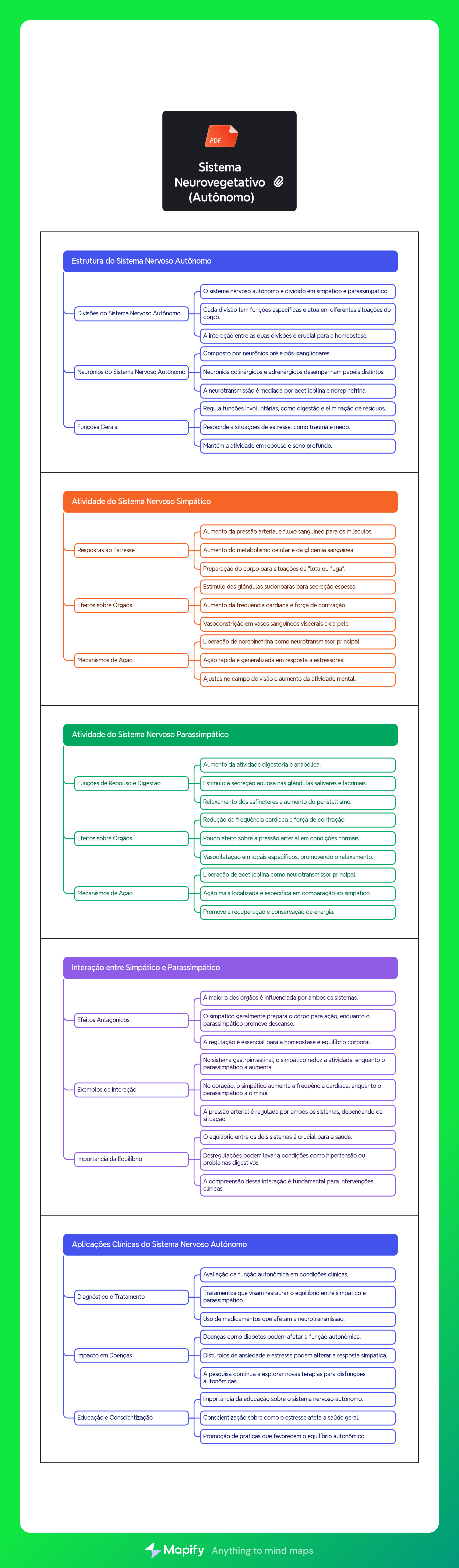 <p>PDF Sistema Neurovegetativo (Autônomo) Estrutura do Sistema Nervoso Autônomo O sistema nervoso dividido em Cada divisão tem funções especificas atua em diferentes situações do Divisões do Sistema Autônomo A interação entre as duas divisões crucial para homeostase Composto por neurônios pré Neurônios do Sistema Nervoso Neurônios colinérgicos desempenham papéis mediada por acetilcolina norepinefrina Regula funções como digestão eliminação de residuos Funções Gerais Responde situações de estresse, como trauma medo atividade em repouso sono profundo Atividade do Sistema Nervoso Aumento da pressão arterial fluxo sanguineo para os Respostas Estresse Aumento do metabolismo celular da glicemia Preparação do corpo para situações de das glândulas sudoriparas para secreção espessa Efeitos sobre Órgãos Aumento da frequência cardiaca força de Vasoconstrição em vasos sanguineos viscerais da pele Liberação de norepinefrina como neurotransmissor principal Mecanismos Ação rápida generalizada em resposta estressores Ajustes no campo de visão aumento da atividade mental Atividade do Sistema Nervoso Aumento da atividade Funções de Repouso Digestão secreção aquosa nas glândulas salivares Relaxamento dos esfincteres aumento do peristaltismo Redução da frequência cardiaca força de contração. Efeitos sobre Pouco efeito sobre pressão arterial em condições normais Vasodilatação em locais promovendo Liberação de acetilcolina como neurotransmissor Mecanismos Ação mais localizada especifica em comparação ao simpatico Promove recuperação conservação de energia Interação entre dos influenciada por ambos os sistemas o geralmente prepara corpo para enquanto Efeitos Antagonicos parassimpatico promove A egulação essencial para homeostase equilibrio corporal No sistema reduz enquanto o aumenta No simpatico aumenta frequência cardiaca. enquanto Exemplos Interação A pressão arterial regulada por ambos os dependendo da entre os dois sistemas crucial para saúde Desregulações podem levar condições como hipertensão ou da problemas digestivos. A compreensão dessa interação fundamental para intervenções clínicas Aplicações Clínicas do Sistema Nervoso Autônomo Avaliação da função autonômica em condições Tratamentos que visam restaurar equilibrio entre simpatico e Diagnóstico Tratamento Uso de medicamentos que afetam neurotransmissão Doenças como diabetes podem afetar função Impacto Doenças Distúrbios de ansiedade estresse podem alterar resposta A pesquisa continua explorar novas terapias para disfunções autonômicas Importância da educação sobre sistema nervoso Educação Conscientização Conscientização sobre como estresse afeta saúde geral Promoção de práticas que favorecem equilibrio</p>