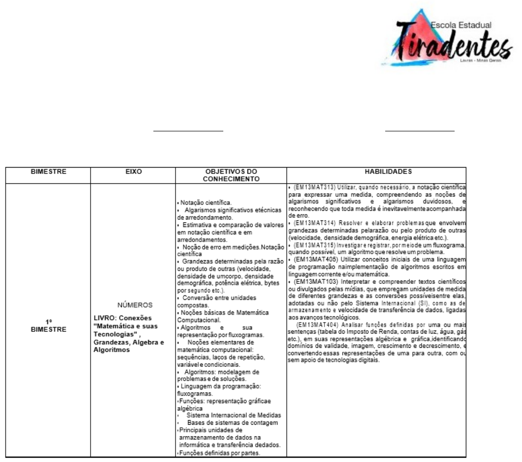 <p>CADERNO DE PLANO DE AULA DE MATEMÁTICA</p><p>ESCOLA ESTADUAL TIRADENTES 1° BIMESTRE</p><p>DATA DA AULA INICIAL: 05/02/2024 ÚLTIMO DIA DO BIMESTRE: 19/04/2024</p><p>Razão entre grandezas diferentes</p><p>A razão entre grandezas diferentes é a divisão entre as medidas dessas grandezas. Entre elas, estão velocidade média, consumo médio e densidade demográfica.</p><p>A densidade demográfica é uma razão entre grandezas diferentes que relaciona o número de pessoas e o espaço que ocupam</p><p>Grandeza é tudo aquilo que pode ser medido, como distância, tempo, massa etc. Uma razão é uma divisão ou o resultado de uma. A razão entre grandezas diferentes, portanto, é uma divisão em que o numerador representa uma grandeza e o denominador representa outra grandeza diferente da primeira. Com os resultados desse tipo de cálculo, podemos observar alguns fenômenos, como quantos quilômetros podem ser percorridos com apenas um litro de combustível.</p><p>Velocidade média</p><p>A velocidade média é uma razão entre grandezas diferentes e é calculada pela divisão entre a distância percorrida (S) em quilômetros pelo tempo gasto no percurso (t) em horas.</p><p>V = S</p><p>t</p><p>A unidade de medida usada para velocidade média é o km/h (quilômetros por hora) e pode ser interpretada da seguinte maneira: representa a quantidade de quilômetros que o objeto foi capaz de percorrer durante uma hora.</p><p>Muitas vezes, em vez de quilômetros, são usados metros. A unidade de medida de tempo para metros é o segundo.</p><p>1º exemplo: Um veículo está em movimento e dirige-se aos limites de uma cidade a 200 quilômetros de distância do ponto de partida. Sabendo que foram gastas quatro horas no percurso, calcule a velocidade média desse veículo.</p><p>Para esse cálculo, basta dividir a distância percorrida pelo tempo gasto. Observe:</p><p>V = 200</p><p>4</p><p>V = 50 km/h</p><p>Esse veículo percorre 50 quilômetros a cada hora de deslocamento.</p><p>2º exemplo: Um veículo está a 80 km/h e faz uma viagem de 560 quilômetros de distância. Quantas horas ele gastará para chegar ao seu destino?</p><p>Utilizando a razão velocidade média e substituindo a velocidade e a distância percorrida, teremos:</p><p>V = S</p><p>t</p><p>80 = 560</p><p>t</p><p>80t = 560</p><p>t = 560</p><p>80</p><p>t = 7 horas.</p><p>Consumo médio</p><p>A razão consumo médio (C) é resultado da divisão do espaço percorrido (S) pela quantidade de combustível (v) gasta no percurso.</p><p>Não pare agora... Tem mais depois da publicidade ;)</p><p>C = S</p><p>v</p><p>A unidade de medida para o consumo médio é km/l (quilômetros por litro) e representa a quantidade de quilômetros que podem ser percorridos com um litro de combustível.</p><p>Exemplo: Uma família quer descobrir quanto gastará para viajar de sua cidade até a praia. Sabendo que a distância é de 530 km, que o carro que os levará tem um consumo médio de 15 km/l e que o litro da gasolina custa aproximadamente R$ 3,00, calcule quanto será gasto apenas com gasolina.</p><p>Para resolver esse problema, basta substituir os valores dados na razão consumo médio e, depois, multiplicar o resultado, que será a quantidade de litros gastos na viagem pelo valor do litro de combustível. Observe:</p><p>C = S</p><p>v</p><p>15 = 530</p><p>v</p><p>15v = 530</p><p>v = 530</p><p>15</p><p>v = 35,3 litros.</p><p>35,3·3,00 = 106,00</p><p>Serão gastos R$ 106,00 de combustível.</p><p>Densidade demográfica</p><p>É a razão entre o número de habitantes de uma região (hab) e a área (A), em quilômetros quadrados, dessa região.</p><p>D = hab</p><p>A</p><p>Essa razão é de extrema importância por oferecer um valor proporcional da quantidade de habitantes das cidades. Digamos, por exemplo, que a cidade A possui 10000 moradores em uma área total de 1000 km2 e que a cidade B possui os mesmos 10000 moradores em um espaço de 100 km2. Qual das duas cidades possui a situação mais crítica?</p><p>Observe que a pergunta não especificou o que é situação crítica, mas é evidente que a cidade que possui mais moradores dentro de um espaço menor precisa de maior atenção. Por isso, pode ser considerada a que está em situação crítica. Sendo assim, precisaremos encontrar apenas aquela que possui maior densidade demográfica.</p><p>DA = hab</p><p>A</p><p>DA = 10000</p><p>1000</p><p>DA = 10 hab/km2</p><p>DB = 10000</p><p>100</p><p>DB = 100 hab/km2</p><p>Logo, a cidade B é a que possui situação mais crítica.</p><p>Conversão de unidades</p><p>Conversão de unidades é um processo fundamental e bastante aplicado na resolução de problemas do dia a dia e na solução de muitos exercícios de Física.</p><p>É comum que, ao resolvermos algum exercício, seja necessário realizar algumas conversões para que as unidades informadas sejam compatíveis entre si. Dessa forma, conhecer as regras de conversão entre unidades é fundamental para desenvolvermos corretamente exercícios.</p><p>O sistema internacional de unidades relaciona algumas grandezas fundamentais da Física com suas unidades. Observe algumas dessas relações:</p><p>Conversão de unidades de comprimento: A unidade de comprimento FUNDAMENTAL no sistema internacional é metro.</p><p>Exemplos: 1 km = 1 x 10 hm = 10 hm</p><p>1 hm = 1 x 10 x 10 dam = 10 m</p><p>1 mm = 1/10 cm = 0,1 cm</p><p>Conversão de unidades de área: As unidades de área do sistema internacional de unidades e suas derivadas podem ser facilmente transformadas de forma similar àquela empregada para a transformação das unidades de distância. Observe:</p><p>Por exemplo: 1 km² = 1 x 100 hm² = 100 hm²</p><p>1 hm² = 1 x 100 x 100 m² = 10 000 m²</p><p>1 mm² = 1/100/100 dm² = 0,0001 dm²</p><p>Conversão de unidades de volume: Para realizarmos conversões de volumes em unidades do sistema internacional é muito simples, basta operarmos de forma similar às transformações que fazemos em metros, dividindo ou m