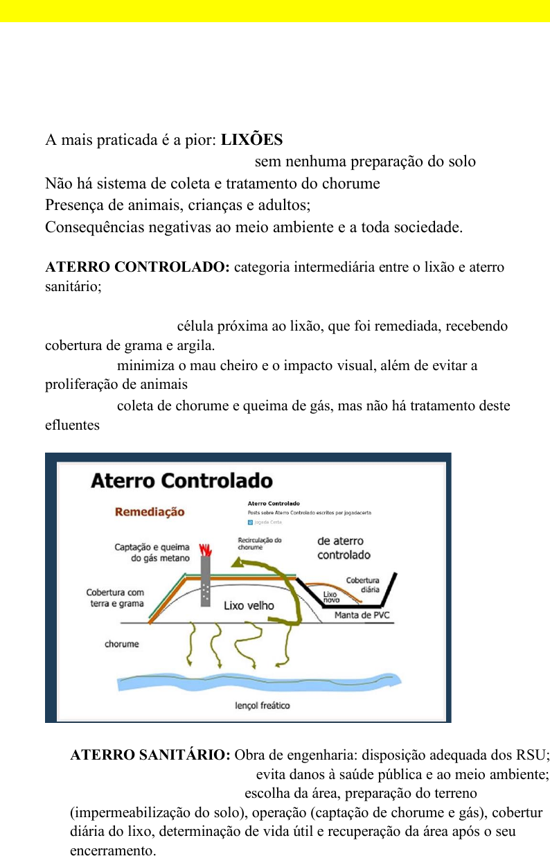 <p>RESUMO – P2 DE RESÍDUOS SÓLIDOS</p><p>PROJETO E DIMENSIONAMENTO DE ATERRO SANITÁRIO</p><p>FORMAS DE DISPOSIÇÃO DO LIXO</p><p>- ATERRO SANIT. 27.4%; LIXÃO 50.3%; ATERRO CONTR. 22.3%</p><p>A mais praticada é a pior: LIXÕES</p><p>• Área de disposição final de RS sem nenhuma preparação do solo</p><p>• Não há sistema de coleta e tratamento do chorume</p><p>• Presença de animais, crianças e adultos;</p><p>• Consequências negativas ao meio ambiente e a toda sociedade.</p><p>ATERRO CONTROLADO: categoria intermediária entre o lixão e aterro</p><p>sanitário;</p><p>• Objetivo de “amenizar” os impactos dos depósitos a céu aberto;</p><p>• Normalmente, é uma célula próxima ao lixão, que foi remediada, recebendo</p><p>cobertura de grama e argila.</p><p>• O processo minimiza o mau cheiro e o impacto visual, além de evitar a</p><p>proliferação de animais;</p><p>• Pode haver coleta de chorume e queima de gás, mas não há tratamento deste</p><p>efluentes.</p><p>ATERRO SANITÁRIO: Obra de engenharia: disposição adequada dos RSU;</p><p>• Operação do aterro sanitário - evita danos à saúde pública e ao meio ambiente;</p><p>• PASSOS IMPORTANTES: escolha da área, preparação do terreno</p><p>(impermeabilização do solo), operação (captação de chorume e gás), cobertura</p><p>diária do lixo, determinação de vida útil e recuperação da área após o seu</p><p>encerramento.</p><p>Highlight</p><p>PROJETO DE ATERRO SANITÁRIO</p><p>Classificação dos aterros:</p><p>Forma de disposição – aterro de rejeitos, aterro controlado, aterro energético, aterro</p><p>sanitário</p><p>Técnica de operação – aterros em depressão; aterros de superfície (trincheira, rampa,</p><p>área).</p><p>Disposição final:</p><p>Aterro de rejeitos: enterramento simples recebe rejeito e materiais inertes de um</p><p>processo prévio de tratamento;</p><p>Aterro controlado: disposição do lixo bruto no solo com recobrimento diário no</p><p>término de todo trabalho;</p><p>Aterro energético: construído dentro dos princípios do aterro sanitário, porém com</p><p>modificações que permitam maior geração de gás e seu aproveitamento como fonte</p><p>de energia.</p><p>Aterro sanitário: A ABNT (1992) através da NBR 8419, define aterro sanitário de</p><p>resíduos sólidos urbanos, como uma técnica de disposição de resíduos sólidos</p><p>urbanos no solo, sem causar danos à saúde pública e à sua segurança,</p><p>minimizando os impactos ambientais. Método esse que utiliza critérios de</p><p>engenharia e normas operacionais específicas para confinar seguramente os</p><p>resíduos sólidos à menor área possível e reduzi-los ao menor volume permissível,</p><p>cobrindo-os com uma camada de terra na conclusão de cada jornada de trabalho, ou</p><p>a intervalos menores, se necessário.</p><p>Vantagens do aterro sanitário:</p><p>• Custo de investimento menor (comparado a outras formas de tratamento);</p><p>• Entendido como um tratamento, pois tem como resultado uma massa de resíduos</p><p>mais estáveis, química e biologicamente.</p><p>• Simplicidade operacional;</p><p>• Flexibilidade operacional, sendo capaz de operar bem mesmo ocorrendo flutuações</p><p>nas quantidades de resíduos a serem aterradas.</p><p>Desvantagens do aterro sanitário:</p><p>• Requer áreas cada vez maiores;</p><p>• A operação sofre ação das condições climáticas;</p><p>• Apresenta risco de contaminação do solo e da água subterrânea, quando não for</p><p>bem construído e operado.</p><p>Aterro sanitário:</p><p>Um aterro sanitário consta necessariamente das seguintes medidas técnicas:</p><p>• Sistema de cobertura do lixo;</p><p>• Impermeabilização de base ou selamento;</p><p>• Drenagem e escoamento das águas superficiais;</p><p>• Sistema de drenagem do chorume;</p><p>• Sistema de tratamento do chorume;</p><p>• Sistema de drenagem dos gases.</p><p>Método de aterro: o projeto do aterro é função do método adotado, trincheira, área</p><p>ou sua combinação, de acordo com as condições topográficas do local, as</p><p>características do solo e a profundidade do nível freático.</p><p>Método de valas ou trincheiras – empregado em terrenos planos ou pouco</p><p>inclinados; lençol freático situado a uma profundidade maior em relação à superfície;</p><p>apresenta um custo relativamente alto pois exige a escavação de grandes valas. Esse</p><p>método é indicado quando: há interesse na formação de um excedente de solo, não</p><p>se deseje alterar a topografia original do terreno e quando se pretende construir outras</p><p>camadas de resíduos acima das valas já aterradas, permitindo um melhor</p><p>aproveitamento da área.</p><p>As dimensões das trincheiras: Dependem da quantidade de resíduos a ser aterrada</p><p>e da vida útil desejada. As dimensões da trincheira definirão:</p><p>• os métodos construtivos;</p><p>• a forma de operação;</p><p>• os equipamentos a serem utilizados,</p><p>• Custos da obra.</p><p>Trincheiras de grandes dimensões: Após a compactação, os resíduos são cobertos</p><p>com uma fina camada de solo. Para a cobertura dos resíduos, geralmente, é utilizado</p><p>o material resultante da escavação da própria trincheira, que permanece estocado nas</p><p>mediações.</p><p>Trincheiras de pequenas dimensões (valas): preenchimento de valas escavadas,</p><p>onde os resíduos são depositados sem compactação e a sua cobertura com terra é</p><p>realizada manualmente.</p><p>Problema dos municípios de pequeno porte: Escassos recursos financeiros para a</p><p>construção de aterros sanitários; Disponibilidade de equipamento para sua operação.</p><p>Não recomendada para comunidades com produção de lixo superior a 10 toneladas</p><p>por dia. Técnica ideal para municípios que geram até 5 toneladas de lixo por dia.</p><p>A escavação de valas exige também cond