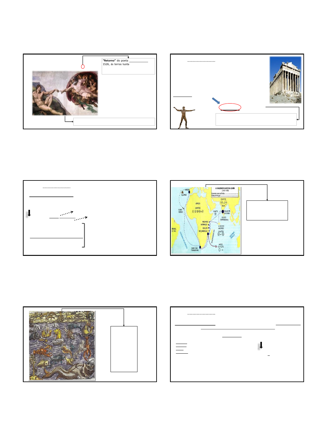 26/02/2021 1 Classicismo (1527 – 1580) “Retorno” do poeta Sá de Miranda, em 1526, às terras lusitanas, após seis anos na Itália onde entrou em contato com novas experiências culturais. (" C ri aç ão d o h o m em “, d e M ic h el an ge lo ) Nesse texto destacam-se as figuras de Deus e Adão. O homem e seu criador se equivalem, ambos dividem o espaço de forma igual. INTRODUÇÃO: No Classicismo (Renascimento) os artistas – pintores, escultores, arquitetos – inspiravam-se nas obras dos antigos gregos e romanos, que se transformaram em modelos, em função dos valores humanistas. Por isso mesmo, dizia-se que a gloriosa arte antiga estava renascendo. Renascimento Os renascentistas regatam os valores antropocêntricos verificados na cultura grega e romana que passam a nortear o horizonte desse homem que renasce. O projeto literário: Visão antropocêntrica: mundo e as idéias deixam de girar em torno de Deus e passam a centrar-se no homem Exemplificando As armas e os barões assinalados Que da Ocidental praia Lusitana, Por mares nunca dantes navegados Passaram ainda além da Taprobana, Em perigos e guerras esforçados Mais do que prometia a força humana E entre gente remota edificaram Novo Reino, que tanto sublimaram; (Os Lusíadas, Camões) Nobres distintos dedicados à guerra; Metonímia de Portugal; O trecho demonstra um esforço incomum dos navegantes lusos que ultrapassaram os medos do mar em busca de novos continentes; Apenas a partir do século XV o europeu se lança ao mar para desvendar seus mistérios, explorar novas rotas e conquistar novos territórios; “C o sm o gr af ia B as ile ia ”, S eb as ti an M u n st er Nessa ilustração, estão representados os monstros marinhos, figuras ameaçadoras e perigosas que, segundo os marinheiros habitavam o mar, o “terrível mar tenebroso”. O projeto literário: Preocupação formal: passou-se a empregar sistematicamente o verso decassílabo, (medida nova) em oposição às redondilhas medievais (medida velha). Gosto pelo soneto, composição poética formada por dois quartetos e dois tercetos. Além da criação de sonetos, os classicistas se preocuparam com outras formas já cultivadas pela literatura grega e latina: • a écloga; • a elegia; • a ode; • a canção. Exemplificando 1 2 3 4 5 6 7 8 9 10 As / ar/ mas / e os / ba / rões / a/ ssi/ na / lados (A) Que da Ocidental praia Lusitana, (B) Por mares nunca dantes navegados (A) Passaram ainda além da Taprobana, (B) Em perigos e guerras esforçados (A) Mais do que prometia a força humana (B) E entre gente remota edificaram (C) Novo Reino, que tanto sublimaram; (C) (Os Lusíadas, Camões) 26/02/2021 2 O USO DA MITOLOGIA: um grupo de artistas, chamados humanistas (Itália), defendia que a cultura pagã, anterior ao aparecimento do cristianismo, era mais rica e expressiva, pois valorizava o indivíduo. O projeto literário: Exemplificando “O Nascimento de Vênus”, de Sandro Botticelli BUSCA DO AMOR PLATÔNICO, ELEVADO, ESPIRITUAL/NEOPLATONISMO: Os autores clássicos buscavam um amor ideazado, espiritualisado e racional, que se aproximava da verdade absoluta. A partir daí o amor é visto de uma forma distante, que muitas vezes o ser amado não tem conhecimento de sua situação e o desejo é aplacado pelo juízo. O projeto literário: Sete anos de pastor Jacó servia Labão, pai de Raquel serrana bela, mas não servia ao pai, servia a ela, que a ela só por prêmio pretendia. Os dias na esperança de um só dia passava, contentando-se com vê-la: porém o pai usando de cautela, em lugar de Raquel lhe deu a Lia. Exemplificando Servia em nome do amor; Note o platonismo amoroso (único prêmio que valia a pena, o amor da amada; Mudança na ordem das coisas; Vendo o triste pastor que com enganos lhe fora assi negada a sua pastora, como se a não tivera merecida, começou a servir outros sete anos, dizendo: Mais servira, se não fora para tão longo amor tão curta a vida. (Camões) Exemplificando (continuação) Humilde, por um amor ideal, platônico, o pastor se dispõe a trabalhar outros sete anos, e assim indefinidamente, para comprovar a sua fidelidade amorosa; TENDÊNCIA AO UNIVERSALISMO: o predomínio da razão impõe que a arte da época expresse verdades universais, absolutas e eternas, deprezando o individual, o particular, o relativo. O projeto literário: Mudam-se os tempos, mudam-se as vontades, muda-se o ser, muda-se a confiança; todo o mundo é composto de mudança, tomando sempre novas qualidades. Continuamente vemos novidades, diferentes em tudo da esperança; do mal ficam as mágoas na lembrança, e do bem, se algum houve, as saudades. [...] (Camões) Exemplificando Tudo é fugaz, (“é impossível um homem banhar-se duas vezes no mesmo rio”); VOU TE LEVAR COMIGO (Biquini Cavadão) As curvas no caminho, meus olhos tão distantes, Eu quero te mostrar os lugares que encontrei Como o céu pode mudar de cor quando encontra o mar Um sonho no horizonte, uma estrela na manhã De repente a vida pode ser uma viagem E o mundo todo vai caber nesta canção Vou te pegar na sua casa, deixa tudo arrumado Vou te levar comigo pra longe Tanta coisa nos espera, me espera na janela Vou te levar comigo Exemplificando Eu quero te contar as histórias que ouvi E nas diferenças vou te encontrar O amor vai sempre ser amor em qualquer lugar Vou te pegar na sua casa, deixa tudo arrumado Vou te levar comigo pra longe Tanta coisa nos espera, me espera na janela Vou te levar comigo Exemplificando Nesse verso temos uma das mais discutidas temáticas universais, o amor 26/02/2021 3 95 — “Ó glória de mandar! Ó vã cobiça Desta vaidade, a quem chamamos Fama! Ó fraudulento gosto, que se atiça C’uma aura popular, que honra se chama! Que castigo tamanho e que justiça Fazes no peito vão que muito te ama! Que mortes, que perigos, que tormentas, Que crueldades neles experimentas! (Canto “Velho do Restelo”, do livro Os lusíadas) MAR PORTUGUÊS Ó mar sal