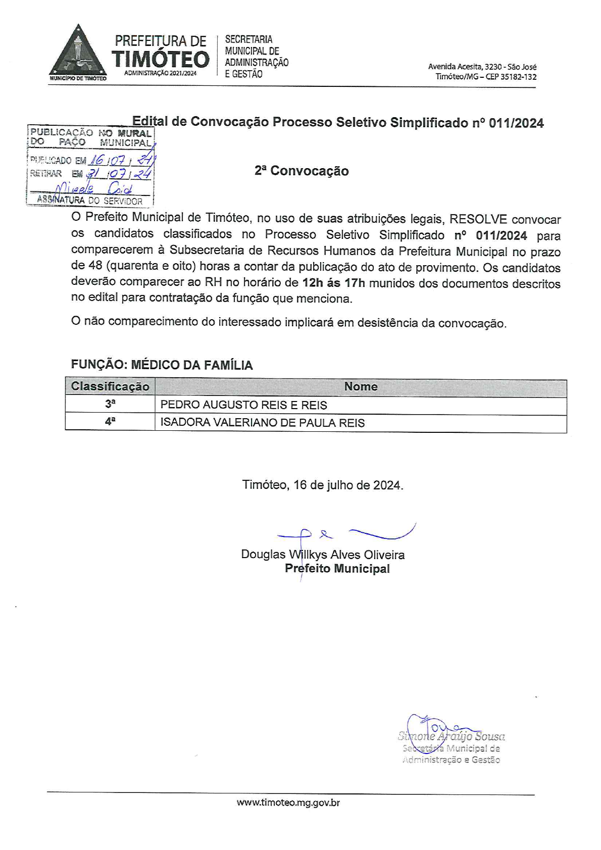 <p>PREFEITURA DE SECRETARIA TIMÓTEO MUNICIPAL DE ADMINISTRAÇÃO Avenida Acesita, 3230 São José ADMINISTRAÇÃO 2021/2024 E GESTÃO MUNICÍPIO DE TIMÓTEO Timóteo/MG - CEP 35182-132 Edital de Convocação Processo Seletivo Simplificado n° 011/2024 PUBLICAÇÃO NO MURAL DO PAÇO MUNICIPAL PUBLICADO EM / RETIRAR EM Convocação ASSINATURA DO SERVIDOR Prefeito Municipal de Timóteo, no uso de suas atribuições legais, RESOLVE convocar os candidatos classificados no Processo Seletivo Simplificado n° 011/2024 para comparecerem à Subsecretaria de Recursos Humanos da Prefeitura Municipal no prazo de 48 (quarenta e oito) horas a contar da publicação do ato de provimento. Os candidatos deverão comparecer ao RH no horário de 12h ás 17h munidos dos documentos descritos no edital para contratação da função que menciona. não comparecimento do interessado implicará em desistência da convocação. FUNÇÃO: MÉDICO DA FAMÍLIA Classificação Nome PEDRO AUGUSTO REIS E REIS ISADORA VALERIANO DE PAULA REIS Timóteo, 16 de julho de 2024. Douglas Willkys Alves Oliveira Prefeito Municipal Simone Araújo Sousa Secretária Municipal de Administração e Gestão www.timoteo.mg.gov.br</p>