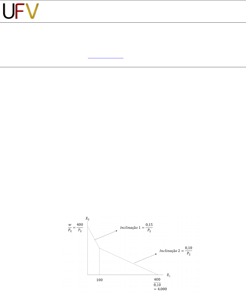 <p>Universidade Federal de Viçosa (UFV)</p><p>Centro de Ciências Humanas (CCH)</p><p>Departamento de Economia (DEE)</p><p>Disciplina:</p><p>Período:</p><p>Créditos</p><p>Horário/Local</p><p>ECO 260 – Fundamentos da Teoria Econômica</p><p>1º Semestre/2019</p><p>4 créditos</p><p>Ter. 10h às 11h40 (PVB 300) Sex. 08h às 09h40 (PVB 300)</p><p>Professor:</p><p>Prof. Igor S. Tupy – igor.tupy@ufv.br</p><p>Gabinete 117 – Departamento de Economia</p><p>Questões para Discussão</p><p>Teoria do Consumidor e Demanda</p><p>GABARITO</p><p>1. Os estudantes da Universidade Federal de Viçosa consomem mensalmente uma quantidade de cópias e impressões de materiais didáticos numa determinada Copiadora, localizada na universidade. Nesta copiadora, o preço unitário depende da quantidade consumida: R$ 0,15 para até 99 cópias e R$ 0,10 a partir de 100 cópias. Desenhe a restrição orçamentária dos estudantes da UFV na escolha de consumo entre cópias e impressões e os demais bens. A renda desse estudante provém de uma bolsa de Iniciação Científica, no valor de R$ 400,00. Considere o nível de preço dos demais bens P2, de forma genérica.</p><p>Na prática, portanto, a restrição orçamentária tem duas inclinações. Podemos escrever essa restrição como</p><p>Consequentemente, podemos ilustrar graficamente como segue:</p><p>2. Reconhecendo a situação de pobreza de parte de sua população, um país da América do Sul decide adotar políticas sociais. Vê -se, então, frente a duas possibilidades. Por um lado, pode reduzir os preços dos alimentos; por outro, pode aplicar um programa de renda mínima. Mostre graficamente as alterações na restrição orçamentária de uma pessoa em situação de pobreza nessa economia, comparando a sua situação inicial e final em cada uma das duas políticas. Ilustre e discuta, também, os efeitos sobre a sua escolha ótima e sua utilidade resultante.</p><p>a. Redução dos preços dos alimentos => muda o intercepto da restrição orçamentária (se toda a renda do consumidor for destinada ao consumo de alimentos, ele poderá consumir uma maior quantidade deste tipo de bens).</p><p>b. A política de renda mínima eleva a renda da população beneficiária deste produto. Portanto, a restrição orçamentária se desloca paralelamente.</p><p>Considerando-se a Utilidade:</p><p>a. Redução no Preço:</p><p>b. Política de renda mínima</p><p>Ambas as políticas aumentam a possibilidade de aquisição de bens e permite que o consumidor alcance um nível de utilidade maior. Contudo, no primeiro caso, esse aumento de utilidade está mais associado ao aumento de consumo de alimentos enquanto no segundo caso está associado a manutenção da taxa de troca anterior entre os bens.</p><p>3. Os clientes de telefonia móvel de uma pequena cidade da Zona da Mata têm a opção de adquirirem chips de apenas duas operadoras distintas. Ao longo do tempo, algumas mudanças de regulação e de tecnologia alteraram as características deste tradeoff. Discuta como as seguintes mudanças podem ter alterado as preferências de consumo dos habitantes desse local quanto a escolha entre a utilização de ambas as operadoras.</p><p>a. Implementação da portabilidade, regulamentação que permite aos clientes migrarem de uma operadora para outra sem alteração no número de telefone.</p><p>Uma vez que as barreira para mudança de operadora diminuem, sobretudo dada a possibilidade de migrar de operadoras mantendo o mesmo número, a taxa pela qual os consumidores desejam trocar um bem pelo outro aumenta, isto é, a Taxa Marginal de Substituição se eleva e esses bens se tornam mais próximos de substitutos perfeitos.</p><p>O custo de oportunidade de migrar de uma operadora para outra se reduz.</p><p>b. Surgimento dos aparelhos celulares dual chip.</p><p>Uma vez que os aparelhos celulares permitem a utilização de dois chips, podemos pensar que a maior parte dos consumidores vai preferir possuir um chip de cada operadora. Assim, a taxa marginal de substituição entre eles tende a diminuir e eles tendem a se comportar mais próximos de bens complementares.</p><p>4. Um dado estudante da UFV, proprietário de um automóvel flexfuel, recebe de sua família um valor mensal de R$ 200,00 para despesas com combustível. Viçosa, cidade que apresenta combustíveis mais caros na região, apresentou os seguintes preços médios para gasolina e etanol nos primeiros meses de 2019[footnoteRef:1]: [1: Fonte: https://g1.globo.com/mg/zona-da-mata/noticia/2019/02/24/levantamento-aponta-reducao-nos-valores-da-gasolina-e-etanol-em-cidades-da-zona-da-mata-e-vertentes.ghtml]</p><p>Combustível</p><p>Preço em Janeiro (R$)</p><p>Preço em Fevereiro (R$)</p><p>Gasolina</p><p>4,772</p><p>4,683</p><p>Etanol</p><p>3,25</p><p>3,137</p><p>Com base nessas informações:</p><p>a) Desenhe a restrição orçamentária que descreve o tradeoff enfrentado por este consumidor. Calcule seus interceptos e inclinações, analisando os respectivos significados.</p><p>1. Podemos escrever a restrição orçamentária de um consumidor como sendo</p><p>P1X1 + P2X2 = w</p><p>Ou seja, sendo X1 a gasolina e X2 o álcool:</p><p>4,771X1 + 3,25X2 = 200</p><p>Os interceptos correspondem aos pontos onde toda a renda do consumidor está sendo gasta com o bem correspondente.</p><p>No eixo vertical: m/ P2 = 200/3,25= 61,53 l (ponto B)</p><p>No eixo horizontal: m/ P1 = 200/4,772 = 41,9 l (Ponto A)</p><p>b) Este estudante só considera o rendimento do automóvel ao realizar a escolha do combustível. Suas estimativas apontam que o rendimento do etanol é equivalente a 70% do da gasolina. Desenhe, então, a curva de indiferença que descreve as preferências desse consumidor em relação ao consumo de álcool e etanol. Discuta qual seria a taxa marginal de substituição, explicando seu significado econômico.</p><p>Álcool e gasolina são bens substitutos perfeitos e, portanto, a curva de indiferença que descreve a pref