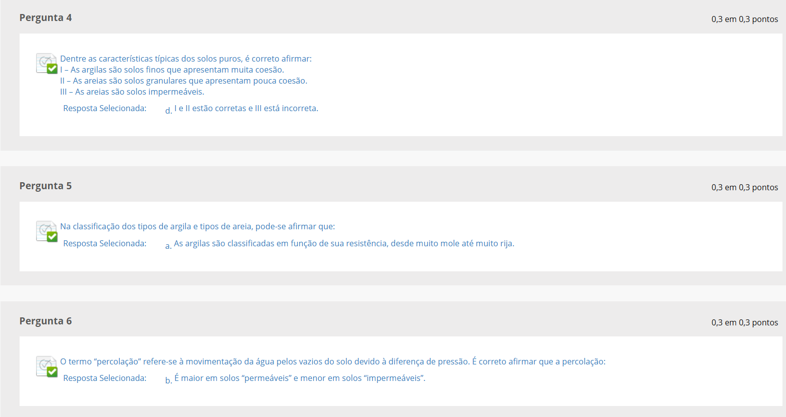 <p>Pergunta 4 0,3 em 0,3 pontos Dentre as características típicas dos solos puros, é correto afirmar: I - - As argilas são solos finos que apresentam muita coesão. - As areias são solos granulares que apresentam pouca coesão. III - As areias são solos impermeáveis. Resposta Selecionada: d. e II estão corretas e III está incorreta. Pergunta 5 0,3 em 0,3 pontos Na classificação dos tipos de argila e tipos de areia, pode-se afirmar que: Resposta Selecionada: a. As argilas são classificadas em função de sua resistência, desde muito mole até muito rija. Pergunta 6 0,3 em 0,3 pontos o termo "percolação" refere-se à movimentação da água pelos vazios do solo devido à diferença de pressão. É correto afirmar que a percolação: Resposta Selecionada: b. É maior em solos "permeáveis" e menor em solos "impermeáveis".</p>
