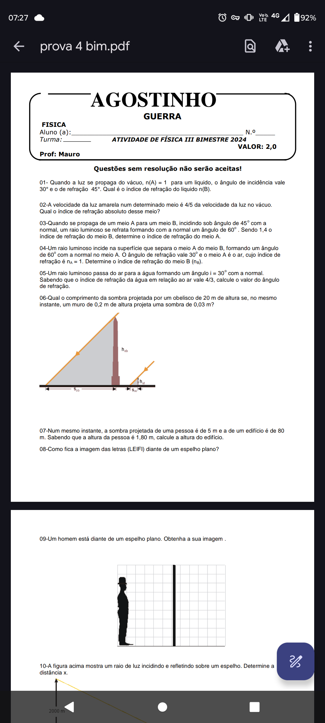 <p>07:27 4G LTE 92% prova 4 bim.pdf AGOSTINHO GUERRA FISICA Aluno (a): Turma: ATIVIDADE DE FÍSICA III BIMESTRE 2024 VALOR: 2,0 Prof: Mauro Questões sem resolução não serão aceitas! 01- Quando a luz se propaga do vácuo, n(A) = 1 para um liquido, o ângulo de incidência vale 30° e o de refração Qual é o índice de refração do liquido n(B). 02-A velocidade da luz amarela num determinado meio é 4/5 da velocidade da luz no vácuo. Qual o índice de refração absoluto desse meio? 03-Quando se propaga de um meio A para um meio B, incidindo sob ângulo de 45° com a normal, um luminoso se refrata formando com a normal um ângulo de 60° Sendo 1,4 o índice de refração do meio B, determine o índice de refração do meio A. 04-Um raio luminoso incide na superfície que separa o meio A do meio B, formando um ângulo de com a normal no meio A. o ângulo de refração vale 30° e o meio A é o ar, cujo índice de refração é = 1. Determine o índice de refração do meio B 05-Um raio luminoso passa do para a água formando um ângulo i = 30° com a normal. Sabendo que o índice de refração da água em relação ao vale 4/3, calcule o valor do ângulo de refração. 06-Qual o comprimento da sombra projetada por um obelisco de 20 m de altura se, no mesmo instante, um muro de 0,2 m de altura projeta uma sombra de 0,03 m? hob 07-Num mesmo a sombra projetada de uma pessoa é de 5 m e a de um edifício é de 80 m. Sabendo que a altura da pessoa é 1,80 m. calcule a altura do edifício. 08-Como fica a imagem das letras (LEIFI) diante de um espelho plano? 09-Um homem está diante de um espelho plano. Obtenha a sua imagem 10-A figura acima mostra um raio de luz incidindo e refletindo sobre um espelho. Determine a distância X. 2000 m</p>