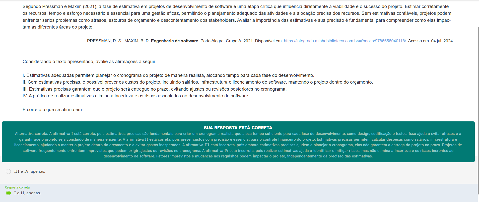 <p>Segundo Pressman e Maxim (2021), a fase de estimativa em projetos de desenvolvimento de software é uma etapa crítica que influencia diretamente a viabilidade e o sucesso do projeto. Estimar corretamente os recursos, tempo e esforço necessário é essencial para uma gestão eficaz, permitindo o planejamento adequado das atividades e a alocação precisa dos recursos. Sem estimativas confiáveis, projetos podem enfrentar sérios problemas como atrasos, estouros de orçamento e descontentamento dos stakeholders. a importância das estimativas e sua precisão é fundamental para compreender como elas impac- tam as diferentes áreas do projeto. R. S.; MAXIM, B. R. Engenharia de Porto Alegre: Grupo A, 2021. Disponível em: em: 04 jul. 2024. Considerando o texto apresentado, avalie as afirmações a seguir: I. Estimativas adequadas permitem planejar o cronograma do projeto de maneira realista, alocando tempo para cada fase do desenvolvimento. II. Com estimativas precisas, é possível prever os custos do projeto, incluindo salários, infraestrutura e licenciamento de software, mantendo o projeto dentro do orçamento. III. Estimativas precisas garantem que o projeto será entregue no prazo, evitando ajustes ou revisões posteriores no cronograma. IV. A prática de realizar estimativas elimina a incerteza e os riscos associados ao desenvolvimento de software. É correto que se afirma em: SUA RESPOSTA ESTÁ CORRETA Alternativa correta. A afirmativa I está correta, pois estimativas precisas são fundamentais para criar um cronograma realista que aloca tempo suficiente para cada fase do desenvolvimento, como design, codificação e testes. Isso ajuda a evitar atrasos e a garantir que projeto seja concluído de maneira eficiente. A afirmativa II está correta, pois prever custos com precisão é essencial para o controle financeiro do projeto. Estimativas precisas permitem calcular despesas como salários, infraestrutura e licenciamento, ajudando a manter projeto dentro do orçamento e a evitar gastos inesperados. A afirmativa III está incorreta, pois embora estimativas precisas ajudem a planejar cronograma, elas não garantem a entrega do projeto no prazo. Projetos de software frequentemente enfrentam imprevistos que podem exigir ajustes ou revisões no cronograma. A afirmativa IV está incorreta, pois realizar estimativas ajuda a identificar e mitigar riscos, mas não elimina a incerteza e os riscos inerentes ao desenvolvimento de software. Fatores imprevistos e mudanças nos requisitos podem impactar projeto, independentemente da precisão das estimativas. III e IV, apenas. Resposta correta I e II, apenas.</p>