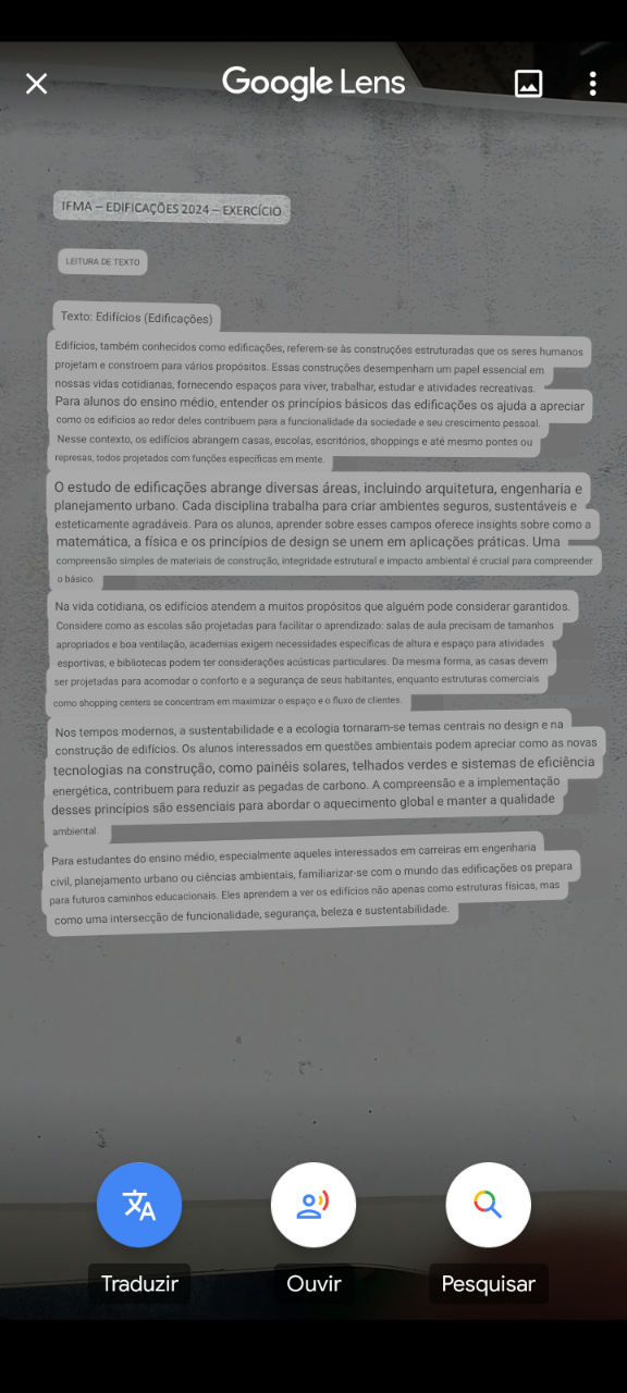 <p>X Google Lens IFMA EDIFICAÇÕES 2024 - EXERCÍCIO LEITURA DE TEXTO Texto: Edifícios (Edificações) também conhecidos como referem-se às construções estruturadas que os seres humanos projetam e constroem para vários propósitos Essas construções desempenham um papel essencial em nossas vidas cotidianas, fornecendo espaços para viver, trabalhar, estudar e atividades recreativas Para alunos do ensino médio, entender os princípios básicos das edificações os ajuda a apreciar como os ao redor deles contribuem para a funcionalidade da sociedade e seu crescimento pessoal Nesse contexto, os edifícios abrangem casas, escolas, escritórios, shoppings e até mesmo pontes ou todos projetados com funções em mente estudo de edificações abrange diversas áreas, incluindo arquitetura, engenharia e planejamento Cada disciplina trabalha para criar ambientes seguros, sustentáveis e esteticamente agradáveis. Para os alunos, aprender sobre esses campos oferece insights sobre como a a física e os princípios de design se unem em aplicações práticas. Uma compreensão simples de materiais de integridade estrutural e impacto ambiental é crucial para compreender básico Na vida cotidiana, os edificios atendem a muitos propósitos que pode considerar garantidos. Considere como as escolas são projetadas para facilitar salas de aula precisam de tamanhos apropriados e boa academias exigem necessidades especificas de altura e espaço para atividades esportivas, e bibliotecas podem ter considerações acústicas Da mesma as casas devem ser projetadas para acomodar conforto e a segurança de seus enquanto estruturas comerciais como shopping centers se concentram em maximizar 0 espaço fluxo de Nos tempos modernos, a sustentabilidade e a ecologia tornaram-se temas centrais no design e na construção de Os alunos interessados em questões ambientais podem apreciar como as novas tecnologias na construção, como painéis solares, telhados verdes e sistemas de eficiência energética, contribuem para reduzir as pegadas de A compreensão e a implementação desses são essenciais para abordar aquecimento global e manter a qualidade ambiental Para estudantes do ensino médio, especialmente aqueles interessados em carreiras em engenharia civil, planejamento urbano ou ciências ambientais, familiarizar-se com mundo das edificações os prepara mas para futuros caminhos Eles aprendem a ver os edifícios não apenas como estruturas físicas, como uma intersecção de funcionalidade, segurança, beleza e sustentabilidade. Traduzir Ouvir Pesquisar</p>