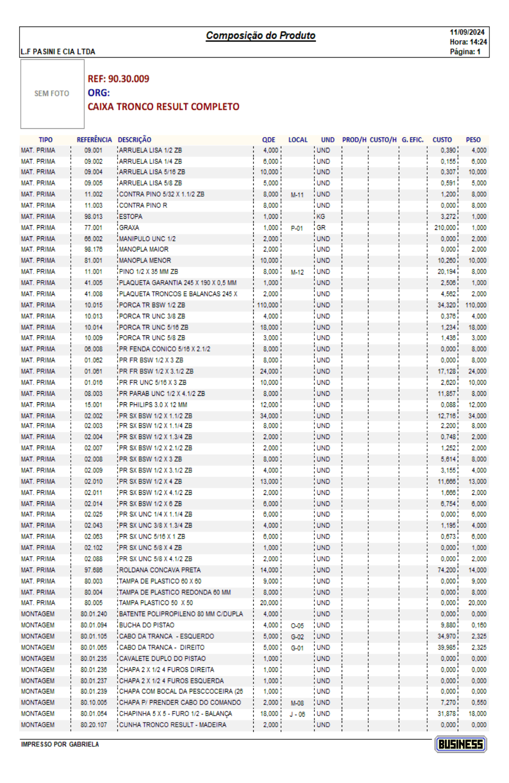 <p>Composição do Produto 11/09/2024 Hora: 14:24 L.F PASINI CIA LTDA Página: 1 REF: 90.30.009 SEM FOTO ORG: CAIXA TRONCO RESULT COMPLETO TIPO REFERÊNCIA DESCRIÇÃO QDE LOCAL UND PROD/H CUSTO/H G. EFIC. CUSTO PESO MAT. PRIMA 09.001 ARRUELA LISA 1/2 ZB 4,000 UND 0,390 4,000 MAT. PRIMA 09.002 ARRUELA LISA 1/4 ZB 6,000 UND 6,000 MAT. PRIMA 09.004 ARRUELA LISA 5/16 ZB 10,000 UND 0,307 10,000 MAT. PRIMA 09.005 ARRUELA LISA 5/8 ZB 5,000 UND 0,591 5,000 MAT. PRIMA 11.002 CONTRA PINO 5/32 X 1.1/2 ZB 8,000 M-11 UND 1,200 8,000 MAT. PRIMA 11.003 CONTRA PINO R 8,000 UND 0,000 8,000 MAT. PRIMA 98.013 ESTOPA 1,000 KG 3,272 1,000 MAT. PRIMA 77.001 GRAXA 1,000 P-01 GR 210,000 1,000 MAT. PRIMA 66.002 MANIPULO UNC 1/2 2,000 UND 0,000 2,000 MAT. PRIMA 98.176 MANOPLA MAIOR 2,000 UND 0,000 2,000 MAT. PRIMA MANOPLA MENOR 10,000 UND 10,260 10,000 MAT. PRIMA 11.001 PINO 1/2 X 35 MM ZB 8,000 M-12 UND 20,194 8,000 MAT. PRIMA 41.005 PLAQUETA GARANTIA 245 X 190 X MM 1,000 UND 2,506 1,000 MAT. PRIMA 41.008 PLAQUETA TRONCOS E BALANCAS 245 X 2,000 UND 4,562 2,000 MAT. PRIMA 10.015 PORCA TR BSW 1/2 ZB 110,000 UND 34,320 110,000 MAT. PRIMA 10.013 PORCA TR UNC 3/8 ZB 4,000 UND 0,376 4,000 MAT. PRIMA 10.014 PORCA TR UNC 5/16 ZB 18,000 UND 1,234 18,000 MAT. PRIMA 10.009 PORCA TR UNC 5/8 ZB 3,000 UND 1,436 3,000 MAT. PRIMA 06.008 PR FENDA CONICO 5/16 X 2.1/2 8,000 UND 0,000 8,000 MAT. PRIMA 01.062 PR FR BSW 1/2 X 3 ZB 8,000 UND 0,000 8,000 MAT. PRIMA 01.061 PR FR BSW 1/2 X 3.1/2 ZB 24,000 UND 17,128 24,000 MAT. PRIMA 01.016 PR FR UNC 5/16 X 3 ZB 10,000 UND 2,620 10,000 MAT. PRIMA 08.003 PR PARAB UNC 1/2 X .1/2 ZB 8,000 UND 11,857 8,000 MAT. PRIMA 15.001 PR PHILIPS 3.0 X 12 MM 12,000 UND 12,000 MAT. PRIMA 02.002 PR SX BSW 1/2 X 1.1/2 ZB 34,000 UND 12,716 34,000 MAT. PRIMA 02.003 PR SX BSW 1/2 X 1.1/4 ZB 8,000 UND 2,200 8,000 MAT. PRIMA 02.004 PR SX BSW 1/2 X 1.3/4 ZB 2,000 UND 2,000 MAT. PRIMA 02.007 PR SX BSW 1/2 X 2.1/2 ZB 2,000 UND 1,252 2,000 MAT. PRIMA 02.008 PR SX BSW 1/2 X 3 ZB 8,000 UND 5,614 8,000 MAT. PRIMA 02.009 PR SX BSW 1/2 X 3.1/2 ZB 4,000 UND 3,155 4,000 MAT. PRIMA 02.010 PR SX BSW 1/2 X 4 ZB 13,000 UND 11,666 13,000 MAT. PRIMA 02.011 PR SX BSW 1/2 X 4.1/2 ZB 2,000 UND 1,666 2,000 MAT. PRIMA 02.014 PR SX BSW 1/2 X 6 ZB 6,000 UND 6,754 6,000 MAT. PRIMA 02.025 PR SX UNC 1/4 X 1.1/4 ZB 6,000 UND 0,000 6,000 MAT. PRIMA 02.043 PR SX UNC 3/8 X 1.3/4 ZB 4,000 UND 1,195 4,000 MAT. PRIMA 02.063 PR SX UNC 5/16 X 1 ZB 6,000 UND 0,673 6,000 MAT. PRIMA 02.102 PR SX UNC 5/8 X 4 ZB 1,000 UND 0,000 1,000 MAT. PRIMA 02.088 PR SX UNC 5/8 X 4.1/2 ZB 2,000 UND 0,000 2,000 MAT. PRIMA 97.686 ROLDANA CONCAVA PRETA 14,000 UND 74,200 14,000 MAT. PRIMA 80.003 TAMPA DE PLASTICO 60 X 60 9,000 UND 0,000 9,000 MAT. PRIMA 80.004 TAMPA DE PLASTICO REDONDA 60 MM 8,000 UND 0,000 8,000 MAT. PRIMA 80.005 TAMPA PLASTICO 50 X 50 20,000 UND 0,000 20,000 MONTAGEM 80.01.240 BATENTE POLIPROPILENO 80 MM C/DUPLA 4,000 UND 0,000 0,000 MONTAGEM 80.01.094 BUCHA DO PISTAO 4,000 O-05 UND 9,880 MONTAGEM 80.01.105 CABO DA TRANCA ESQUERDO 5,000 G-02 UND 34,970 2,325 MONTAGEM 80.01.065 CABO DA TRANCA DIREITO 5,000 G-01 UND 39,985 2,325 MONTAGEM 80.01.235 CAVALETE DUPLO DO PISTAO 1,000 UND 0,000 0,000 MONTAGEM 80.01.236 CHAPA 2 X 1/2 4 FUROS DIREITA 1,000 UND 0,000 0,000 MONTAGEM 80.01.237 CHAPA 2 X 1/2 4 FUROS ESQUERDA 1,000 UND 0,000 0,000 MONTAGEM 80.01.239 CHAPA COM BOCAL DA PESCCOCEIRA (26 1,000 UND 0,000 0,000 MONTAGEM 80.10.005 CHAPA P/ PRENDER CABO DO COMANDO 2,000 M-08 UND 7,270 0,550 MONTAGEM 80.01.054 CHAPINHA 5 FURO 1/2 BALANÇA 18,000 UND 31,878 18,000 MONTAGEM 80.20.107 CUNHA TRONCO RESULT MADEIRA 2,000 UND 0,000 0,000 IMPRESSO POR GABRIELA BUSINESS</p><p>Composição do Produto 11/09/2024 Hora: 14:24 L.F PASINI E CIA LTDA Página: 2 REF: 90.30.009 SEM FOTO ORG: CAIXA TRONCO RESULT COMPLETO TIPO REFERÊNCIA DESCRIÇÃO QDE LOCAL UND PROD/H CUSTO/H G. EFIC. CUSTO PESO MONTAGEM 80.01.098 GARRAFA 1 LITRO C/ OLEO 2,000 UND 8,394 2,200 MONTAGEM 80.01.133 KIT P/ TRONCO C/ PISTAO - AMR/ELITE/ 1,000 UND 5,222 MONTAGEM 80.01.001 MESA DA ROSCA - TRONCO 4,000 F-01 UND 13,348 MONTAGEM 80.01.009 PARAF. CHUMBADOR 1/2 MENOR 8,000 G-05 UND 18,336 1,600 MONTAGEM 80.01.242 PINO DO RESULT C/ ARGOLA 4,000 UND 0,000 0,000 MONTAGEM 80.01.241 PINO DO RESULT S/ ARGOLA 4,000 UND 0,000 MONTAGEM 95.69.017 PUXADOR FUNDIDO 3,000 C-01 UND 13,452 MONTAGEM 80.01.058 ROSCA DO MACACO TRONCO 4,000 H-01 UND 30,532 2,800 61 CUSTO DE PRODUÇÃO UNITÁRIA 453,280 IMPRESSO POR GABRIELA BUSINESS</p>