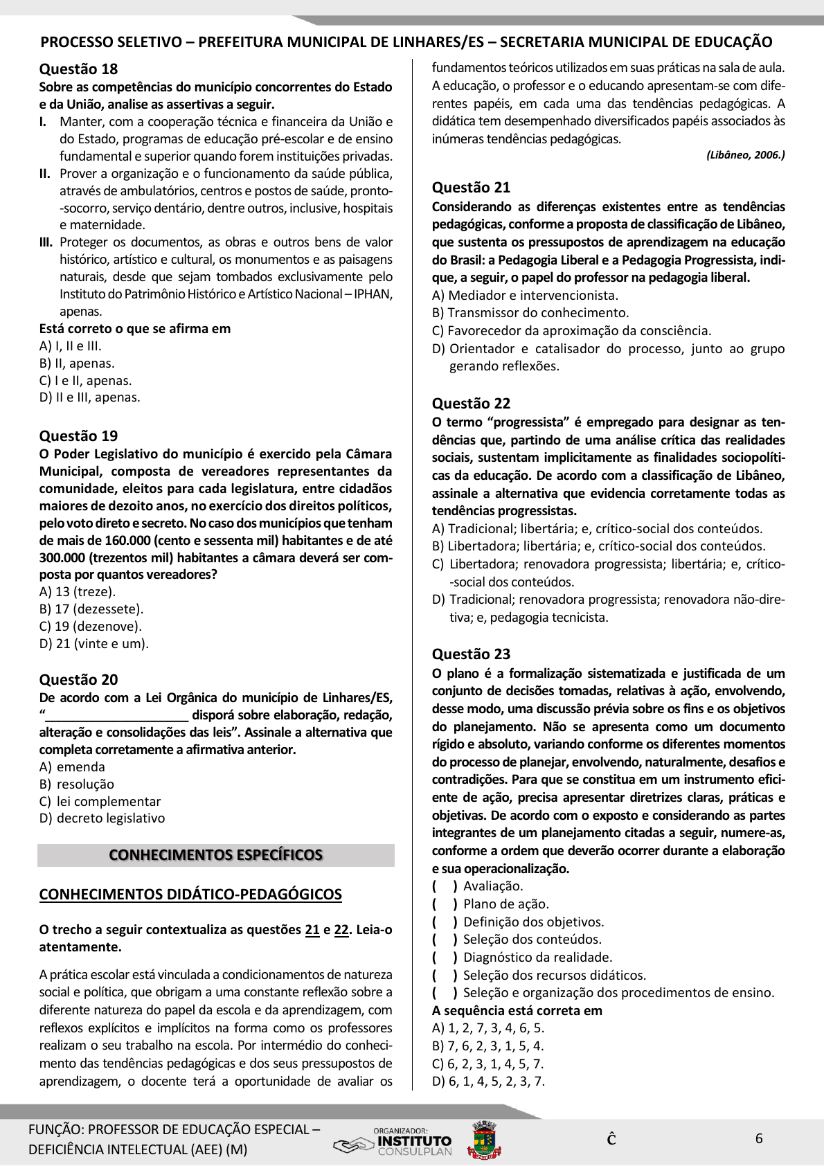 <p>pcimarkpci MjgwNDowZDU1Ojc5MDY6YmYwMDphMDU3OmRjNzI6NWU2MTo5MjE4:U2F0LCAxMCBBdWcgMjAyNCAxNzo0NjoxNyAtMDMwMA==</p><p>www.pciconcursos.com.br</p><p>6</p><p>FUNÇÃO: PROFESSOR DE EDUCAÇÃO ESPECIAL –</p><p>DEFICIÊNCIA INTELECTUAL (AEE) (M)</p><p>PROCESSO SELETIVO – PREFEITURA MUNICIPAL DE LINHARES/ES – SECRETARIA MUNICIPAL DE EDUCAÇÃO</p><p>Ĉ</p><p>Questão 18</p><p>Sobre as competências do município concorrentes do Estado</p><p>e da União, analise as assertivas a seguir.</p><p>I. Manter, com a cooperação técnica e financeira da União e</p><p>do Estado, programas de educação pré-escolar e de ensino</p><p>fundamental e superior quando forem instituições privadas.</p><p>II. Prover a organização e o funcionamento da saúde pública,</p><p>através de ambulatórios, centros e postos de saúde, pronto-</p><p>-socorro, serviço dentário, dentre outros, inclusive, hospitais</p><p>e maternidade.</p><p>III. Proteger os documentos, as obras e outros bens de valor</p><p>histórico, artístico e cultural, os monumentos e as paisagens</p><p>naturais, desde que sejam tombados exclusivamente pelo</p><p>Instituto do Patrimônio Histórico e Artístico Nacional – IPHAN,</p><p>apenas.</p><p>Está correto o que se afirma em</p><p>A) I, II e III.</p><p>B) II, apenas.</p><p>C) I e II, apenas.</p><p>D) II e III, apenas.</p><p>Questão 19</p><p>O Poder Legislativo do município é exercido pela Câmara</p><p>Municipal, composta de vereadores representantes da</p><p>comunidade, eleitos para cada legislatura, entre cidadãos</p><p>maiores de dezoito anos, no exercício dos direitos políticos,</p><p>pelo voto direto e secreto. No caso dos municípios que tenham</p><p>de mais de 160.000 (cento e sessenta mil) habitantes e de até</p><p>300.000 (trezentos mil) habitantes a câmara deverá ser com-</p><p>posta por quantos vereadores?</p><p>A) 13 (treze).</p><p>B) 17 (dezessete).</p><p>C) 19 (dezenove).</p><p>D) 21 (vinte e um).</p><p>Questão 20</p><p>De acordo com a Lei Orgânica do município de Linhares/ES,</p><p>“_____________________ disporá sobre elaboração, redação,</p><p>alteração e consolidações das leis”. Assinale a alternativa que</p><p>completa corretamente a afirmativa anterior.</p><p>A) emenda</p><p>B) resolução</p><p>C) lei complementar</p><p>D) decreto legislativo</p><p>CONHECIMENTOS ESPECÍFICOS</p><p>CONHECIMENTOS DIDÁTICO-PEDAGÓGICOS</p><p>O trecho a seguir contextualiza as questões 21 e 22. Leia-o</p><p>atentamente.</p><p>A prática escolar está vinculada a condicionamentos de natureza</p><p>social e política, que obrigam a uma constante reflexão sobre a</p><p>diferente natureza do papel da escola e da aprendizagem, com</p><p>reflexos explícitos e implícitos na forma como os professores</p><p>realizam o seu trabalho na escola. Por intermédio do conheci-</p><p>mento das tendências pedagógicas e dos seus pressupostos de</p><p>aprendizagem, o docente terá a oportunidade de avaliar os</p><p>fundamentos teóricos utilizados em suas práticas na sala de aula.</p><p>A educação, o professor e o educando apresentam-se com dife-</p><p>rentes papéis, em cada uma das tendências pedagógicas. A</p><p>didática tem desempenhado diversificados papéis associados às</p><p>inúmeras tendências pedagógicas.</p><p>(Libâneo, 2006.)</p><p>Questão 21</p><p>Considerando as diferenças existentes entre as tendências</p><p>pedagógicas, conforme a proposta de classificação de Libâneo,</p><p>que sustenta os pressupostos de aprendizagem na educação</p><p>do Brasil: a Pedagogia Liberal e a Pedagogia Progressista, indi-</p><p>que, a seguir, o papel do professor na pedagogia liberal.</p><p>A) Mediador e intervencionista.</p><p>B) Transmissor do conhecimento.</p><p>C) Favorecedor da aproximação da consciência.</p><p>D) Orientador e catalisador do processo, junto ao grupo</p><p>gerando reflexões.</p><p>Questão 22</p><p>O termo “progressista” é empregado para designar as ten-</p><p>dências que, partindo de uma análise crítica das realidades</p><p>sociais, sustentam implicitamente as finalidades sociopolíti-</p><p>cas da educação. De acordo com a classificação de Libâneo,</p><p>assinale a alternativa que evidencia corretamente todas as</p><p>tendências progressistas.</p><p>A) Tradicional; libertária; e, crítico-social dos conteúdos.</p><p>B) Libertadora; libertária; e, crítico-social dos conteúdos.</p><p>C) Libertadora; renovadora progressista; libertária; e, crítico-</p><p>-social dos conteúdos.</p><p>D) Tradicional; renovadora progressista; renovadora não-dire-</p><p>tiva; e, pedagogia tecnicista.</p><p>Questão 23</p><p>O plano é a formalização sistematizada e justificada de um</p><p>conjunto de decisões tomadas, relativas à ação, envolvendo,</p><p>desse modo, uma discussão prévia sobre os fins e os objetivos</p><p>do planejamento. Não se apresenta como um documento</p><p>rígido e absoluto, variando conforme os diferentes momentos</p><p>do processo de planejar, envolvendo, naturalmente, desafios e</p><p>contradições. Para que se constitua em um instrumento efici-</p><p>ente de ação, precisa apresentar diretrizes claras, práticas e</p><p>objetivas. De acordo com o exposto e considerando as partes</p><p>integrantes de um planejamento citadas a seguir, numere-as,</p><p>conforme a ordem que deverão ocorrer durante a elaboração</p><p>e sua operacionalização.</p><p>( ) Avaliação.</p><p>( ) Plano de ação.</p><p>( ) Definição dos objetivos.</p><p>( ) Seleção dos conteúdos.</p><p>( ) Diagnóstico da realidade.</p><p>( ) Seleção dos recursos didáticos.</p><p>( ) Seleção e organização dos procedimentos de ensino.</p><p>A sequência está correta em</p><p>A) 1, 2, 7, 3, 4, 6, 5.</p><p>B) 7, 6, 2, 3, 1, 5, 4.</p><p>C) 6, 2, 3, 1, 4, 5, 7.</p><p>D) 6, 1, 4, 5, 2, 3, 7.</p><p>pcimarkpci MjgwNDowZDU1Ojc5MDY6YmYwMDphMDU3OmRjNzI6NWU2MTo5MjE4:U2F0LCAxMCBBdWcgMjAyNCAxNzo0NjoxNyAtMDMwMA==</p><p>www.pciconcursos.