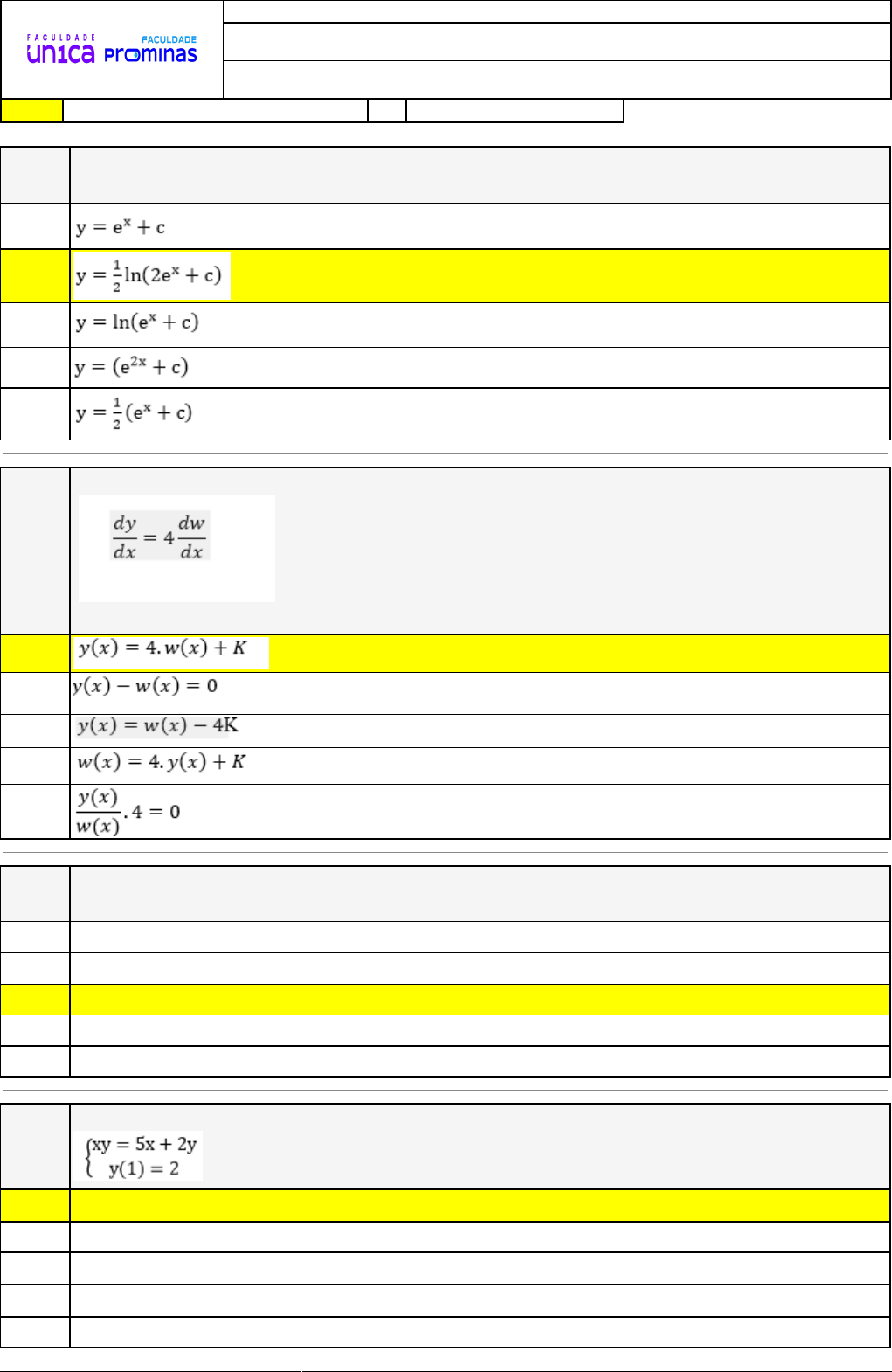 <p>23/09/2024 10:56:50 1/3</p><p>REVISÃO DE SIMULADO</p><p>Nome:</p><p>SELMO BATISTA TAVEIRA</p><p>Disciplina:</p><p>Cálculo III</p><p>Respostas corretas são marcadas em amarelo X Respostas marcardas por você.</p><p>Questão</p><p>001 (UFPR-Adaptada) A opção que representa a solução da equação y'=ex-2y, diferencial de</p><p>variáveis separáveis é:</p><p>A)</p><p>X B)</p><p>C)</p><p>D)</p><p>E)</p><p>Questão</p><p>002 Analise a expressão abaixo:</p><p>A solução geral para a equação acima é</p><p>X A)</p><p>B)</p><p>C)</p><p>D)</p><p>E)</p><p>Questão</p><p>003 (UFPR-Adaptada) A opção que representa a solução da equação xy' = y, diferencial de</p><p>variáveis separáveis é:</p><p>A) y=C lnx</p><p>B) y=Cex</p><p>X C) y=Cx</p><p>D) y=Cx+12</p><p>E) y=Cx+8</p><p>Questão</p><p>004 Considere a seguinte equação:</p><p>, sua solução será:</p><p>X A) y=7x2- 5x</p><p>B) y=12x- 8</p><p>C) y=7x2</p><p>D) y=2x2- 8x</p><p>E) y=4x+3</p><p>23/09/2024 10:56:50 2/3</p><p>Questão</p><p>005 (UFPEL-Adaptada) A solução geral da EDO x2+y2-2xyy' = 0 é:</p><p>A) y2-x2=Cx+2</p><p>B) y2-x2=Cx+9</p><p>C) y2=Cx</p><p>D) y2=2x+8</p><p>X E) y2-x2=Cx</p><p>Questão</p><p>006 Analise a expressão abaixo:</p><p>Possui por equação geral qual expressão?</p><p>A) p(t) = m.v(t+K)</p><p>X B) p(t) = -m.a(t) + K</p><p>C) p(t) + K = m.a(t)</p><p>D) p(t) = -m + K</p><p>E) p(t) = m.v(t) + K</p><p>Questão</p><p>007 Analise a expressão abaixo:</p><p>De acordo com a expressão dada, avalie as afirmativas abaixo:</p><p>I. A equação dada é diferencial de primeira ordem.</p><p>II. A solução geral para a equação dada é igual a y(x)=1/4 x2+k.</p><p>III. A solução geral da expressão dada não pode ser obtida.</p><p>É correto o que se afirma em</p><p>A) I e III, apenas.</p><p>X B) I e II, apenas.</p><p>C) I, apenas.</p><p>D) III, apenas.</p><p>E) II, apenas.</p><p>Questão</p><p>008 Analise a expressão abaixo:</p><p>Considerando a expressão dada, avalie a seguintes asserções e a relação proposta</p><p>entre elas.</p><p>I. A expressão representa uma equação do primeiro grau e possui uma solução geral.</p><p>PORQUE</p><p>II. O expoente indicado na derivada é de ordem 1 e, além disso, utilizando o método da</p><p>separação de variáveis chega-se na solução geral.</p><p>A respeito destas asserções, assinale a opção correta.</p><p>A) As asserções I e II são proposições verdadeiras, mas a II não é uma justificativa da I.</p><p>23/09/2024 10:56:50 3/3</p><p>B) A asserção I é uma proposição falsa e, a II é uma proposição verdadeira.</p><p>X C) As asserçoÌ�es I e II saÌ�o proposiçoÌ�es verdadeiras, e a II eÌ� uma justificativa da I.</p><p>D) As asserções I e II são proposições falsas.</p><p>E) A asserção I é uma proposição verdadeira e, a II é uma proposição falsa.</p>