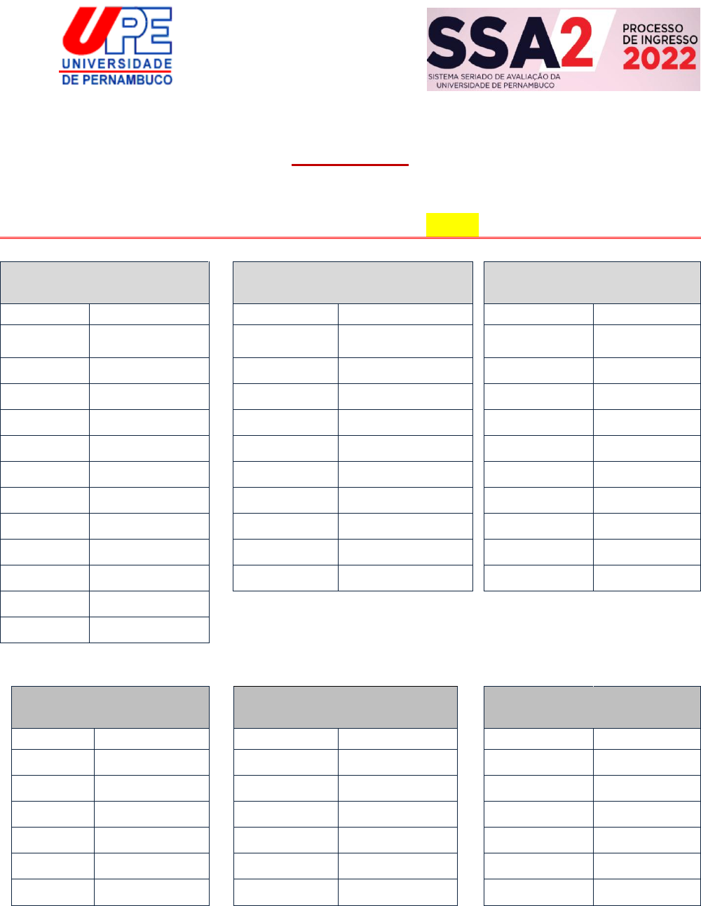 <p>SISTEMA SERIADO DE AVALIAÇÃO UPE</p><p>2ª FASE - 2022</p><p>GABARITO PRELIMINAR- 1º DIA</p><p>LINGUA PORTUGUESA</p><p>MATEMÁTICA</p><p>FÍSICA</p><p>QUESTÃO ALTERNATIVA</p><p>QUESTÃO ALTERNATIVA</p><p>QUESTÃO ALTERNATIVA</p><p>1 B</p><p>13 C</p><p>23 NULA</p><p>2 A</p><p>14 B</p><p>24 A</p><p>3 B</p><p>15 D</p><p>25 C</p><p>4 D</p><p>16 A</p><p>26 D</p><p>5 D</p><p>17 B</p><p>27 C</p><p>6 A</p><p>18 NULA</p><p>28 C</p><p>7 B</p><p>19 C</p><p>29 A</p><p>8 B</p><p>20 B</p><p>30 E</p><p>9 C</p><p>21 D</p><p>31 D</p><p>10 A</p><p>22 C</p><p>32 E</p><p>11 D</p><p>12 E</p><p>INGLÊS</p><p>ESPANHOL</p><p>FILOSOFIA</p><p>QUESTÃO ALTERNATIVA</p><p>QUESTÃO ALTERNATIVA</p><p>QUESTÃO ALTERNATIVA</p><p>33 C</p><p>33 E</p><p>39 E</p><p>34 D</p><p>34 D</p><p>40 C</p><p>35 A</p><p>35 A</p><p>41 B</p><p>36 E</p><p>36 B</p><p>42 A</p><p>37 D</p><p>37 E</p><p>43 C</p><p>38 A</p><p>38 B</p><p>44 A</p>