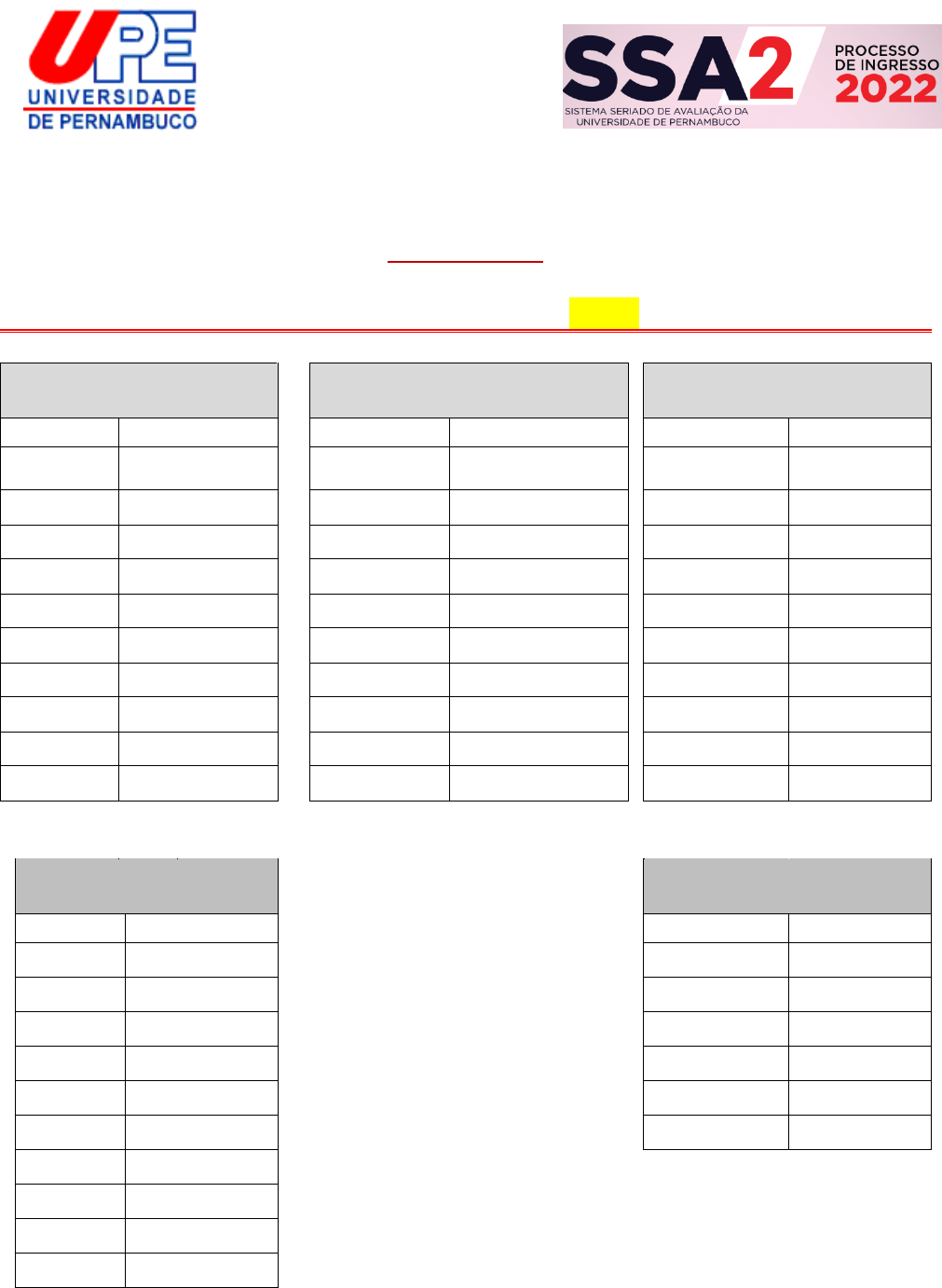 <p>SISTEMA SERIADO DE AVALIAÇÃO UPE</p><p>2ª FASE - 2022</p><p>GABARITO PRELIMINAR - 2º DIA</p><p>BIOLOGIA</p><p>QUÍMICA</p><p>HISTÓRIA</p><p>QUESTÃO ALTERNATIVA</p><p>QUESTÃO ALTERNATIVA</p><p>QUESTÃO ALTERNATIVA</p><p>1 C</p><p>11 A</p><p>21 C</p><p>2 D</p><p>12 B</p><p>22 B</p><p>3 B</p><p>13 E</p><p>23 D</p><p>4 A</p><p>14 E</p><p>24 D</p><p>5 A</p><p>15 B</p><p>25 A</p><p>6 A</p><p>16 A</p><p>26 A</p><p>7 C</p><p>17 B</p><p>27 B</p><p>8 B</p><p>18 D</p><p>28 C</p><p>9 D</p><p>19 B</p><p>29 A</p><p>10 E</p><p>20 E</p><p>30 E</p><p>GEOGRAFIA</p><p>SOCIOLOGIA</p><p>QUESTÃO ALTERNATIVA</p><p>QUESTÃO ALTERNATIVA</p><p>31 E</p><p>41 B</p><p>32 A</p><p>42 A</p><p>33 D</p><p>43 C</p><p>34 B</p><p>44 D</p><p>35 A</p><p>45 E</p><p>36 D</p><p>46 C</p><p>37 B</p><p>38 C</p><p>39 E</p><p>40 E</p>