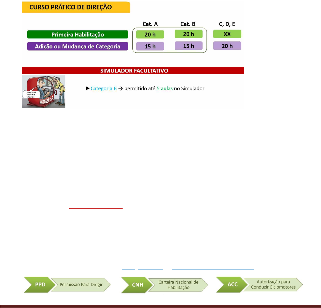 <p>1</p><p>PROCESSO de HABILITAÇÃO</p><p>1. Pré-requisitos ao candidato à habilitação:</p><p>► Ser penalmente imputável – Pessoa que possa ser responsabilizada perante a Lei Penal;</p><p>► Ser alfabetizado - Não se exige grau de escolaridade. Basta que saiba ler e escrever;</p><p>► Possuir documento de identificação - RG, Carteira de Trabalho, Passaporte ou outro documento com foto;</p><p>► Possuir CPF.</p><p>Obs. O processo de habilitação tem duração de 12 meses, a contar da data de cadastro no sistema BINCO (Base Índice de</p><p>Condutores) e no RENACH (Registro Nacional de Condutores Habilitados).</p><p>2. Etapas do Processo de Habilitação:</p><p>► Avaliação Psicológica e Exames Físico e Mental;</p><p>► Curso Teórico Técnico (45 horas-aula) e Exame Teórico (70% de aproveitamento para aprovação)</p><p>► Curso Prático de Direção (20 horas-aula categoria inicial A ou B ou) e Exame de Direção.</p><p>3. ACC - Autorização para Conduzir Ciclomotores (Cinquentinhas):</p><p>a. Curso Teórico com 20 horas-aula e Prova Teórica com 15 questões → mínimo 60% para aprovação.</p><p>b. Curso Prático de Direção com 5 horas-aula e Prova de Direção, em motopista, conforme categoria A.</p><p>Obs. Em caso de reprovação em qualquer exame, a marcação poderá ser feita após 5 dias e se reprovado pela segunda vez,</p><p>poderá refazer o curso referente à etapa em que foi reprovado → o exame pode ser realizado em ciclomotor próprio.</p><p>4. LADV – Licença e Aprendizagem e Direção Veicular:</p><p>► Documento emitido ao candidato aprovado na primeira e segunda etapa do processo de habilitação - necessário para</p><p>treinamento da prática veicular.</p><p>Obs. O candidato que for flagrado treinando em desacordo com a legislação de trânsito, além das sanções previstas pelo</p><p>CTB, terá sua LADV suspensa por 6 meses. MACETE: Suspensa começa com “S” e Seis meses também.</p><p>5. Em qual categoria começar:</p><p>► O candidato poderá requerer as categorias A, B ou A e B simultaneamente, bem como a ACC.</p><p>Obs. Ao candidato aprovado em todas as etapas do processo, será conferida a PPD ou ACC provisória, com validade de 1</p><p>ano. Caso seja reprovado, poderá repetir o exame a qualquer tempo (na ACC o prazo para reexame é de 5 dias).</p><p>Obs. O portador da PPD ou ACC Provisória, poderá solicitar a habilitação definitiva, após 1 ano, desde que não tenha</p><p>cometido nenhuma infração de natureza grave, gravíssima ou reincidência em infrações médias.</p><p>2</p><p>6. Outros tipos de veículos e suas definições:</p><p>► CICLOMOTOR: Veículo automotor de 2 ou 3 rodas, cuja cilindrada não exceda a 50 cm3, ou elétrico com máximo de 4 kW,</p><p>e velocidade máxima de 50 km/h → popular “cinquentinha”.</p><p>► MOTONETA: Veículo automotor de 2 rodas conduzido por condutor em posição sentada.</p><p>► MOTOCICLETA: Veículo automotor de 2 rodas conduzido por condutor em posição montada.</p><p>► TRICICLO: Veículo com estrutura mecânica similar às motocicletas, dotado de três rodas dispostas simetricamente, com</p><p>motor de propulsão com cilindrada superior a 50 cm3, conduzido por condutor e posição montada ou sentada.</p><p>► QUADRICICLO: Veículo automotor com estrutura mecânica similar às motocicletas, possuindo eixo dianteiro e traseiro,</p><p>dotado de quatro rodas, com massa em ordem de marcha NÃO superior a 400kg, ou 550kg no caso do veículo destinado ao</p><p>transporte de cargas e potência máxima NÃO superior a 15kW.</p><p>► BICICLETA ELÉTRICA: Veículo de duas rodas, impulsionado por um motor elétrico cuja potência não exceda a 350 Watts,</p><p>velocidade máxima de 25 km/h, funcionamento do motor somente ao pedalar e NÃO possui acelerador.</p><p>► VEÍCULO AUTOPROPELIDO: Equipamento de mobilidade individual NÃO equiparado ao ciclomotor ou bicicleta elétrica.</p><p>Velocidade máxima de 6 km/h para circular entre pedestres ou 20 km/h em ciclovias. Equipado com velocímetro, campainha</p><p>e sinalização noturna; dimensões NÃO superiores a de uma cadeira de rodas.</p><p>7. Renovação da Habilitação:</p><p>► Consiste em ser aprovado nos exames físico e mental (e psicológico se EAR), observando os seguintes prazos:</p><p>a. De 10 em 10 anos, para condutores com menos de 50 anos de idade;</p><p>b. De 5 em 5 anos, para condutores com idade entre 50 e 69 anos;</p><p>c. De 3 em 3 anos, para condutores com 70 anos ou mais;</p><p>d. A critério do médico avaliador, os prazos podem ser reduzidos, em razão de alguma anormalidade.</p><p>Obs. Para os condutores habilitados nas categorias C, D ou E é necessário passar por exame toxicológico.</p><p>8. Para que serve cada categoria de habilitação e quais os prazos de troca entre elas.</p><p>3</p><p>9. Veículo utilizado para fazer exame em cada uma das categorias e ACC:</p><p>10. Habilitação para atividades remuneradas:</p><p>a. TRANSPORTE COLETIVO DE PASSAGEIROS:</p><p>► Categoria D ou E;</p><p>► Mínimo de 21 anos de idade;</p><p>► Curso de transporte coletivo de passageiros;</p><p>► Não ter cometido mais de uma infração gravíssima nos últimos 12 meses;</p><p>► Não estar sob efeito de Suspensão ou Cassação da CNH.</p><p>b. TRANSPORTE ESCOLAR:</p><p>► Categoria D ou E;</p><p>► Mínimo de 21 anos de idade;</p><p>► Curso de transporte escolar;</p><p>► Não ter cometido mais de uma infração gravíssima nos últimos 12 meses;</p><p>► Não estar sob efeito de Suspensão ou Cassação da CNH.</p><p>Obs. O veículo para este tipo de atividade deve possuir: Faixa amarela de 40 cm de largura; Registro como veículo de</p><p>passageiros; Inspeção de segurança, semestral; Cinto para todos os ocupantes; Luzes de posição; Tacógrafo.</p><p>c. OPERADOR DE MÁQUINAS:</p><p>► Categoria C, D ou E;</p><p>► Mínimo de 21 anos de idade;</p><p>Obs. Não é exigida habilitaç