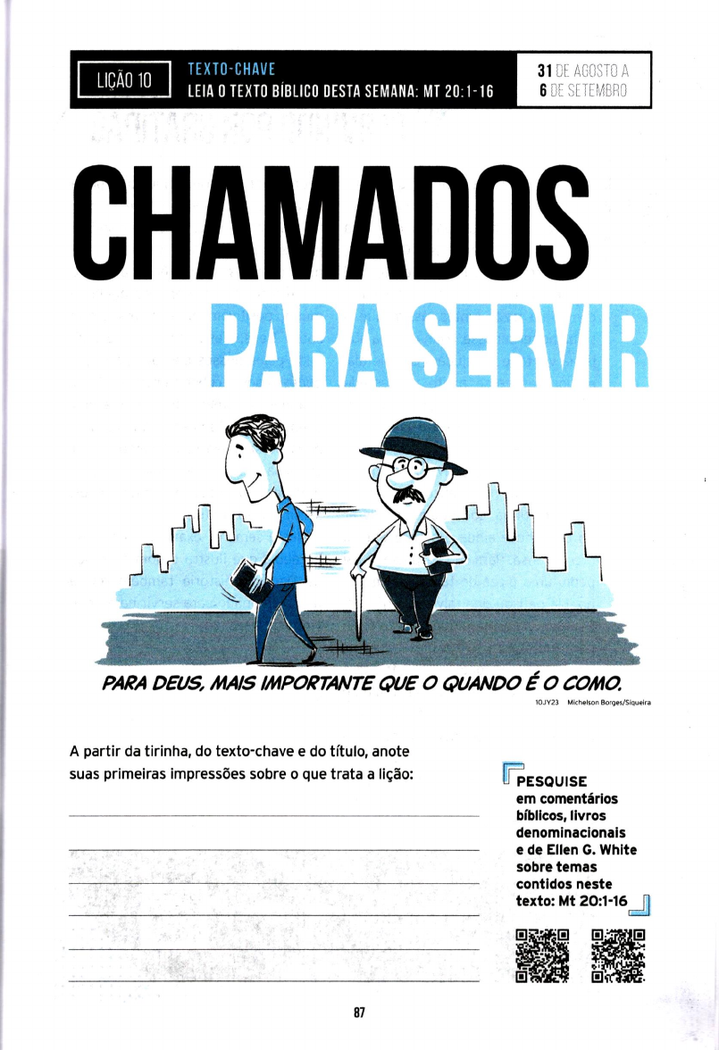 <p>TEXTO-CHAVE 10 31 DE AGOSTO A LEIA 0 TEXTO BÍBLICO DESTA SEMANA: MT 20:1-16 6 DE SETEMBRO CHAMADOS PARA SERVIR PARA DEUS, MAIS IMPORTANTE QUE QUANDO É COMO. 10JY23 Michelson Borges/Sigueira A partir da tirinha, do texto-chave e do título, anote suas primeiras impressões sobre o que trata a lição: PESQUISE em comentários bíblicos, livros denominacionais e de Ellen G. White sobre temas contidos neste texto: Mt 20:1-16 87</p><p>COM EXTO DOMINGO, DE SETEMBRO SERVINDO POR GRATIDÃO uando uma amiga minha era adoles- Então o pai sorriu, empurrou a pizza cente, o pai dela sempre lhe dava gu- para ela e disse que assumiria as con- loseimas especiais quando ela fazia sequências de suas ações, deixando-a trabalhos extras em casa. Certo dia, a pizza. Ela compartilhou quando era preciso limpar a casa, o pai migo como essa experiência a ajudou prometeu que sairiam para almoçar e a compreenden melhor o evangelho e comeriam pizza juntos, assim que o mudou positivamente sua perspectiva trabalho terminasse. Minha amiga não sobre Deus. Jesus tomou a penali- tinha vontade de ajudar naquele dia, dade pelos nossos pecados para que embora estivesse muito interessada pudéssemos receber a graça de Deus, na pizza. Ela deixou o pai limpar sem algo que certamente não merecemos. a ajuda dela, imaginando que ainda Minha amiga também ganhou uma assim ganharia a pizza. nova perspectiva sobre como ajudar Quando o pai a convidou para in à em casa. Ela percebeu que não servi- pizzaria, ela ficou encantada. Pen- mos para conseguir o que queremos; sou que tinha conseguido se livrar servimos por gratidão. do trabalho e ainda assim a Nesta semana, examinaremos uma recompensa. Para sua surpresa, o pai parábola que ilustra o dom da graça pediu uma pizza de tamanho peque- de Deus. A história também revela no. Ela pensou que talvez ele não es- nosso chamado para servir na grande tivesse com fome e que a pizza seria vinha de Deus. para ela. Assim que a pizza chegou, porém, ele a colocou na sua frente e disse que, como ela não havia ajuda- do na tarefa do dia, ele iria saborear a pizza sozinho. A primeira reação dela foi: "Como ele pode fazer isso comi- go? Isso não é justo!" De repente, ela percebeu que não havia cumprido sua parte do acordo. Acesse: MERGULHE + FUNDO Leia, de Ellen G. White, Parábolas de Jesus, capítulo 28: "O maior dos males". 88</p><p>COM PREENDA SEGUNDA, 2 DE SETEMBRO QUESTÃO DE CONFIANÇA a parábola, o primeiro grupo, que tra- Jesus. Quando respondemos ao cha- balhava desde o início do dia, con- mado de Deus para trabalhar na Sua cordou em receber um denário pelo vinha, Ele cuida de nós. E qual é o sa- trabalho. Esse salário era razoável; lário que recebemos? Depois de ape- era o salário diário de um trabalhador nas alguns segundos na eternidade, braçal na Judeia do primeiro século. saberemos que Deus dá o que é justo! Poucas horas depois, o proprietário en- A eternidade será nossa recompensa, controu mais trabalhadores "que esta- e ela está igualmente disponível para vam desocupados" (Mt 20:3). Isso não todos. Contudo, a alegria de servir significa que eles fossem preguiçosos; pode começar agora. Nossa recom- eles simplesmente ainda não haviam pensa inclui as experiências mara- recebido um convite para trabalhar vilhosas que adquirimos com Jesus para alguém. Imediatamente após o quando compartilhamos Seu amor proprietário ter feito o convite, esses com outras pessoas. trabalhadores foram para a vinha. Essa cena se repetiu mais três vezes ao lon- go do dia, terminando à noite. Os israelitas sabiam o que poderiam esperar, independentemente de esco- aceitar ou rejeitar o convite de Deus. Alguns atenderam ao cha- mado, mas, infelizmente, muitos não o fizeram. Mais tarde, o chamado para "trabalhar na vinha" foi estendido aos gentios. Eles também receberam a promessa de receberem "o que for justo". Esse convite é feito a todos os que recebem Jesus como Messias, e o acordo se baseia na confiança. A parábola continua falando a nós hoje, quer sejamos obreiros da igreja PENSE de tempo integral, empresários, líde- Você já descobriu seus dons res de departamentos, evangelistas espirituais e como pode usá-los leigos, estudantes ou pais que traba- para testemunhar aos outros? em casa. Todos nós temos uma Quais você considera serem as esfera de influência que pode ser usa- recompensas do seu serviço? da para divulgar as boas-novas sobre 89</p><p>COM ENTE TERÇA, 3 DE SETEMBRO DÉCIMA PRIMEIRA HORA P erto do fim do dia, o dono de terras que respondem ao chamado de Jesus. percebeu que precisava de mais tra- Não merecemos nada. A salvação é balhadores para terminar o trabalho. simplesmente um dom a ser recebido De volta ao mercado, encontrou mais pela fé, não por obras (Ef 2:8-10). homens dispostos a in para a vinha. O descontentamento surge quando Aqueles que foram contratados no últi- não consideramos outros trabalhado- mo momento trabalharam apenas uma res da nossa equipe. Se o objetivo é hora. A parábola termina de forma in- concluir o trabalho na vinha, na ver- crível e inesperada. proprietário po- dade não importa quanto cada um deria ter pagado primeiro aqueles que recebe. Nosso foco passa a ser: "Ter- trabalharam o dia todo. Eles teriam minamos o trabalho!" E os primeiros recebido com alegria o denário com o trabalhadores podem se alegrar com qual concordaram e saído satisfeitos. os trabalhadores da última hora. Se Em vez disso, o proprietário fez com o objetivo é a salvação das pessoas, que ficassem no fim da fila, e eles vi- devemos celebrar cada filho pródigo! ram os trabalhadores da última hora Como é libertador viver simplesmente recebendo o mesmo pagamento que confiando que Deus dará que for haviam combinado. Como você reagi- justo"! (Mt 20:4, 7). ria se tivesse trabalhado o dia todo? Essa parábola se desenvolve por Sua primeira reação provavelmente se- um período de doze horas. De maneira ria fazer alg