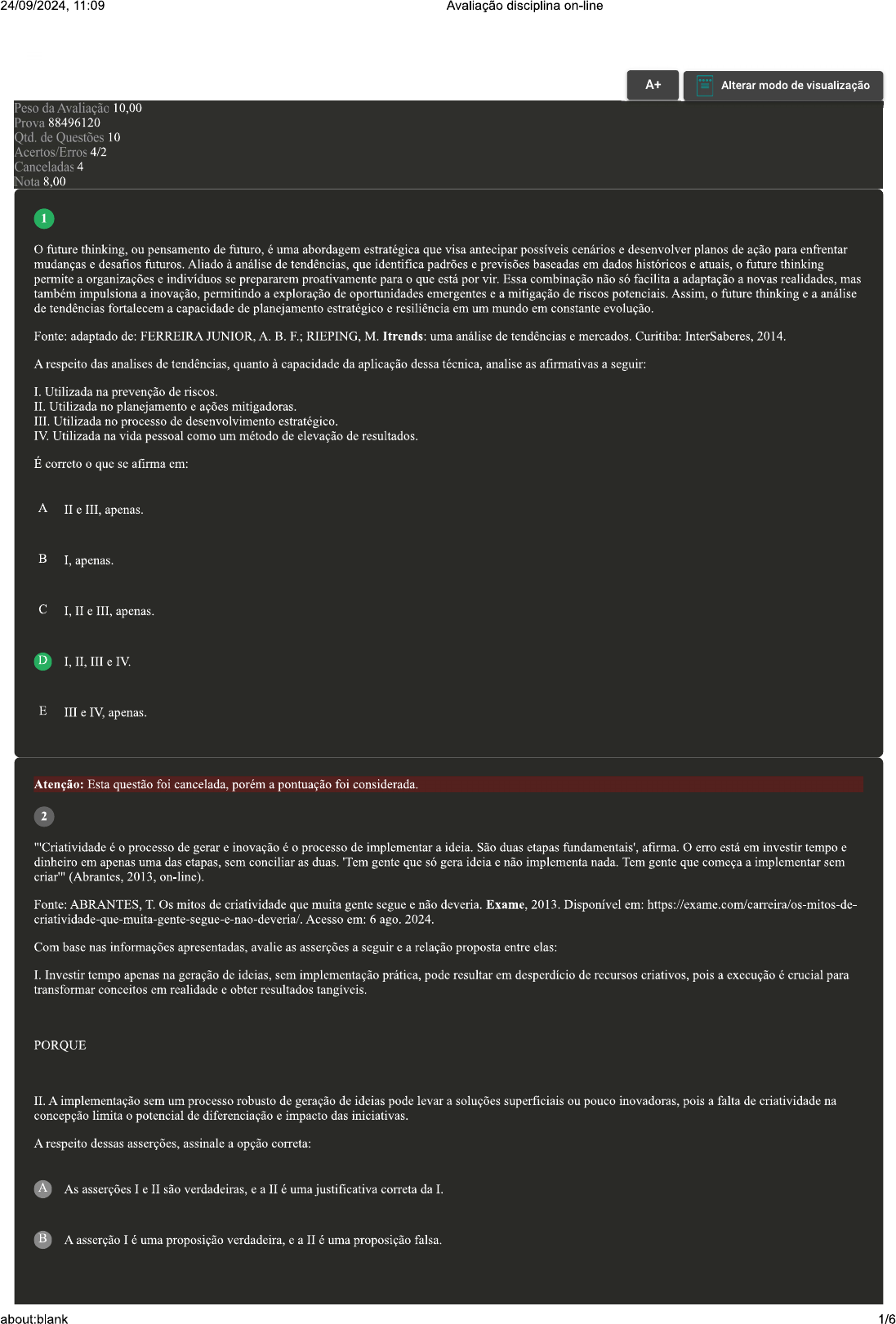 <p>24/09/2024, 11:09 Avaliação disciplina on-line A+ Alterar modo de visualização Peso da Avaliação 10,00 Prova 88496120 Otd. de Questões 10 Acertos/Erros 4/2 Canceladas 4 Nota 8,00 1 O future thinking, ou pensamento de é uma abordagem estratégica que visa antecipar possíveis cenários e desenvolver planos de ação para enfrentar mudanças e desafios futuros. Aliado à análise de tendências, que identifica padrões e previsões baseadas em dados históricos e atuais, future thinking permite a organizações e indivíduos se prepararem proativamente para que está por vir. Essa combinação não só facilita a adaptação a novas realidades, mas também impulsiona a inovação, permitindo a exploração de oportunidades emergentes e a mitigação de riscos potenciais. Assim, future thinking e a análise de tendências fortalecem a capacidade de planejamento estratégico e resiliência em um mundo em constante evolução. Fonte: adaptado de: FERREIRA A. B. F.: RIEPING. M. Itrends: uma análise de tendências e mercados. Curitiba: InterSaberes, 2014. A respeito das analises de tendências, quanto à capacidade da aplicação dessa técnica, analise as afirmativas a seguir: I. Utilizada na prevenção de riscos. II. Utilizada no planejamento e ações mitigadoras. III. Utilizada no processo de desenvolvimento estratégico. IV. Utilizada na vida pessoal como um método de elevação de resultados. É correto que se afirma em: A II e III. apenas. B I. apenas. C I. II III, apenas. D I. II, III e E III e IV. apenas. Atenção: Esta questão foi cancelada, porém a pontuação foi considerada. 2 é o processo de gerar e inovação é o processo de implementar a ideia. São duas etapas afirma. O erro está em investir tempo e dinheiro em apenas uma das etapas, sem conciliar as duas. 'Tem gente que só gera ideia e não implementa nada. Tem gente que começa a implementar sem criar" (Abrantes, 2013. on-line). Fonte: ABRANTES, T. Os mitos de criatividade que muita gente segue e não deveria. Exame. 2013. Disponível em: https://exame.com/carreira/os-mitos-de- criatividade-que-muita-gente-segue-e-nao-deveria/ Acesso em: 6 ago. 2024. Com base nas informações apresentadas, avalie as asserções a seguir e a relação proposta entre elas: I. Investir tempo apenas na geração de ideias, sem implementação prática, pode resultar em desperdício de recursos criativos, pois a execução é crucial para transformar conceitos em realidade e obter resultados tangíveis. PORQUE II. A implementação sem um processo robusto de geração de ideias pode levar a soluções superficiais ou pouco inovadoras, pois a falta de criatividade na concepção limita potencial de diferenciação e impacto das iniciativas. A respeito dessas asserções, assinale a opção correta: As asserções I e II são verdadeiras. e a II é uma justificativa correta da A asserção I é uma proposição verdadeira, e a II é uma proposição falsa. about:blank 1/6</p><p>24/09/2024, 11:09 Avaliação disciplina on-line As asserções I e II são verdadeiras, mas a II não é uma justificativa correta da I. A asserção I é uma proposição falsa, e a II é uma proposição verdadeira. As asserções I e II são falsas. Atenção: Esta questão foi cancelada, porém a pontuação foi considerada. 3 Podemos dizer que ter criatividade é ter inventividade, ou seja, ter a capacidade de inventar algo novo a partir da imaginação. A inovação, por sua vez, é a capacidade de caminhar nas ideias que nascem da criatividade, explorá-las e ver os seus efeitos na prática. Fonte: CRIATIVIDADE e inovação: as diferenças e importância para empresas. Euax, 2022. Disponível em: https://www.euax.com.br/2022/09/criatividade- e-inovacao-diferencas-e-importancia-para- Acesso em: 6 ago. 2024. Com base no exposto, assinale a alternativa correta: A criatividade e a inovação são termos intercambiáveis que podem ser usados como sinônimos, pois ambos se referem à geração de novas A criatividade é essencialmente teórica, enquanto a inovação se concentra na implementação prática das ideias criativas. A inovação é simplesmente a aplicação de ideias criativas, sem a necessidade de explorar diferentes abordagens ou perspectivas. D A criatividade é mais importante para empresas iniciantes, enquanto a inovação é crucial para empresas estabelecidas que buscam se manter competitivas. As corporações enxergam os profissionais criativos como aqueles capazes de trazer soluções inovadoras aos problemas novos que um mundo tão volátil gera. Ao adotar uma mentalidade criativa e, de fato, praticar a criatividade, seguindo seus processos, indivíduo consegue atingir seus objetivos. Atenção: Esta questão foi cancelada, porém a pontuação foi considerada. 4 "Na verdade, segundo os especialistas, a criatividade está relacionada mais a um modo de encarar mundo do que a um gene ou iluminação transcendental. tem a ver com a flexibilidade para olhar mundo. Se sou criativo aceito que as verdades mudam até a hora que eu criar uma nova', diz Conrado Schlochauer, um dos sócios do LAB SSJ" (Abrantes, 2013, on-line). Fonte: ABRANTES, T. Os mitos de criatividade que muita gente segue e não deveria. Exame, 2013. Disponível em: https://exame.com/carreira/os-mitos-de- Acesso em: 6 ago. 2024 Considerando exposto e bloqueio criativo, analise as afirmativas a seguir: I. A pressão externa por resultados imediatos muitas vezes atua como um obstáculo ao processo criativo, inibindo a liberdade de pensamento e a exploração de ideias não convencionais, que pode levar ao surgimento do bloqueio criativo. II. O bloqueio criativo muitas vezes surge quando nos apegamos rigidamente a conceitos preestabelecidos sobre como as coisas devem ser, dificultando a flexibilidade necessária para explorar novas perspectivas e soluções inovadoras. III. Além de ser influenciado pela capacidade de ver o mundo de forma flexível, processo criativo tamb
