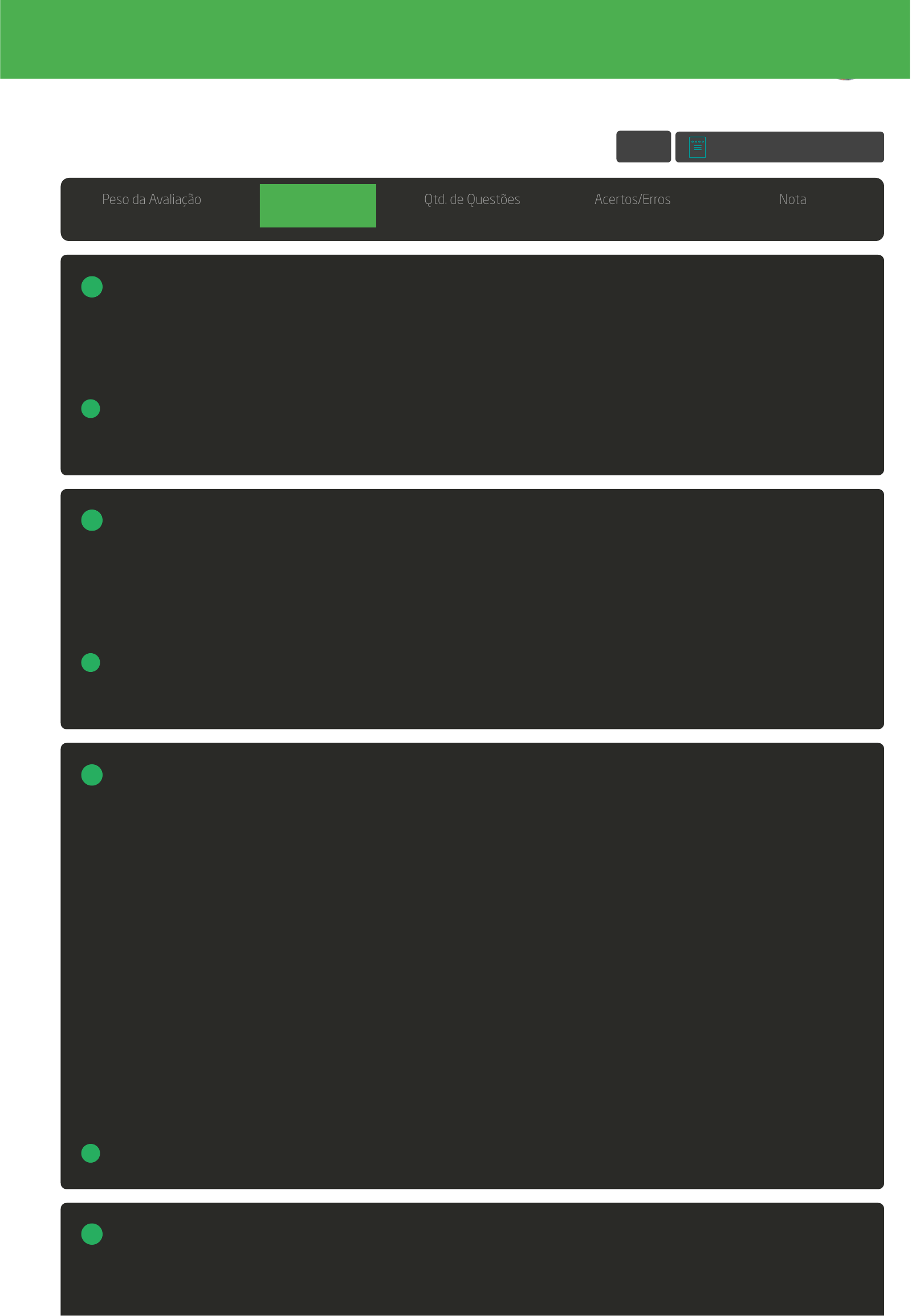 <p>GABARITO | Avaliação II - Individual (Cod.:959689)</p><p>Peso da Avaliação</p><p>2,00</p><p>Prova</p><p>83354844</p><p>Qtd. de Questões</p><p>10</p><p>Acertos/Erros</p><p>10/0</p><p>Nota</p><p>10,00</p><p>Um software é desenvolvido para atender às necessidades de seus usuários e que deve ter uma vida útil, produtiva e longa. Com</p><p>relação à qualidade de software, assinale a alternativa INCORRETA:</p><p>A Um teste bem-sucedido é aquele que revela um erro ainda desconhecido.</p><p>B Testes de programas podem ser usados para mostrar a presença de erros, mas nunca para mostrar a sua ausência.</p><p>C O processo de validação tem por objetivo realizar testes até que nenhum erro seja encontrado.</p><p>D Os testes são incapazes de garantir que um software não irá apresentar erros durante a execução.</p><p>É necessário desenvolver um software para resolver o problema e propor a melhor solução com os recursos disponíveis, ou seja, se o</p><p>software não atender aos objetivos desejados, não vale a pena desenvolver uma solução muito cara e atrativa. Para um bom</p><p>desenvolvimento de software educacional temos que ter um equilíbrio entre alguns atributos que incluem:</p><p>A controlabilidade, dependabilidade e eficiência</p><p>B eficiência, manutenibilidade e usabilidade</p><p>C eficiência, eficácia, viabilidade</p><p>D controlabilidade, eficiência e manutenibilidade</p><p>Na escolha de um software educacional, deve-se considerar o público-alvo e a adequação da interface do software em relação ao</p><p>assunto utilizado, bem como sua aplicabilidade como ferramenta no processo de ensino, não apenas como ferramenta de execução de</p><p>tarefas. Deve ser avaliada a existência de diferentes formas de apresentação de conteúdos e resolução de problemas, principalmente em</p><p>termos de padrões de usabilidade e acessibilidade. Sobre os métodos para avaliação de software educacional, classifique V para as sentenças</p><p>verdadeiras e F para as falsas:</p><p>( ) A Técnica de Inspeção Ergonômica de Software Educacional propõe a integração entre aspectos pedagógicos e de usabilidade no</p><p>processo de avaliação ergonômica de um software educacional.</p><p>( ) A Técnica de Inspeção Ergonômica de Software Educacional tem um enfoque particular sobre a ergonomia de software aplicada a</p><p>produtos educacionais informatizados.</p><p>( ) O ErgoList é um sistema de avaliação ergonômica de software para ser usado on-line na internet.</p><p>Assinale a alternativa que apresenta a sequência CORRETA:</p><p>A F - V - F.</p><p>B F - F - V.</p><p>C V - V - F.</p><p>D V - V - V.</p><p>Na escolha de um software educacional, deve-se considerar o público-alvo e a adequação da interface do software com relação ao</p><p>assunto utilizado, bem como sua aplicabilidade como ferramenta no processo de ensino, não apenas como ferramenta de execução de</p><p>tarefas. Deve ser avaliada a existência de diferentes formas de apresentação de conteúdos e resolução de problemas, principalmente em</p><p>termos de padrões de usabilidade e acessibilidade. Sobre os métodos para avaliação de software educacional, analise as sentenças a seguir:</p><p>VOLTAR</p><p>A+ Alterar modo de visualização</p><p>1</p><p>2</p><p>3</p><p>4</p><p>Alexandre Henrique Miranda Rosas</p><p>Segunda Licenciatura em Informática (7206380)</p><p></p><p>03/06/2024, 11:30 AVA</p><p>https://ava2.uniasselvi.com.br/subject/grades-and-tests/answer-book/eyJ0ZXN0Ijp7InRlc3RDb2RlIjoiOTU5Njg5IiwiZGVzY3JpcHRpb24iOiJBdmFsaWHDp8OjbyBJSSAtIEluZGl2aWR1YWwiLCJwYXJhbWV0ZXIiOjE4… 1/4</p><p>I- A Técnica de Inspeção Ergonômica de Software Educacional propõe a integração entre aspectos pedagógicos e de usabilidade no processo</p><p>de avaliação ergonômica de um software educacional.</p><p>II- A Técnica de Inspeção Ergonômica de Software Educacional tem um enfoque particular sobre a ergonomia de software aplicada à</p><p>produtos educacionais informatizados.</p><p>III- O ErgoList é um sistema de avaliação ergonômica de software para ser usado on-line na internet.</p><p>Assinale a alternativa CORRETA:</p><p>A Somente a sentença II está correta.</p><p>B As sentenças I, II e III estão corretas.</p><p>C Somente a sentença I está correta.</p><p>D Somente a sentença III está correta.</p><p>O método de verificação de requisitos técnicos considera fatores de disponibilidade e compatibilidade e o possível impacto de</p><p>equipamentos, sistemas e software sobre os usuários. Esta avaliação visa reconhecer os recursos disponíveis para a realização das atividades</p><p>propostas. Sobre os atributos referentes ao requisito de tecnologia do modelo TUP, classifique V para as opções verdadeiras e F para as</p><p>falsas:</p><p>( ) Disponibilidade e compatibilidade.</p><p>( ) Acessibilidade e confiabilidade.</p><p>( ) Aspectos organizacionais.</p><p>( ) Integridade e versatilidade.</p><p>( ) Aspectos de programação.</p><p>Assinale a alternativa que apresenta a sequência CORRETA:</p><p>A V - V - F - F - F.</p><p>B F - V - F - F - V.</p><p>C V - V - V - F - F.</p><p>D F - F - V - V - F.</p><p>A influência do fenômeno "o computador como ferramenta na educação" depende do valor que cada sociedade lhe dá, ou seja, as</p><p>possibilidades de uso do computador estão crescendo e os limites dessa expansão são desconhecidos. Surgem relatos de novas maneiras de</p><p>usar o computador como um recurso para enriquecer e favorecer o processo de ensino-aprendizagem e programas de computador que visam</p><p>atender necessidades e objetivos pedagógicos. Isso mostra que é possível alterar o paradigma educacional; hoje, centrado no ensino, para</p><p>algo que seja centrado na aprendizagem. Existem diversos tipos de software educacional e cada um possui suas próprias características e um</p><p>determinado enfoque educacional. Sobre os programas do tipo tutorial, 