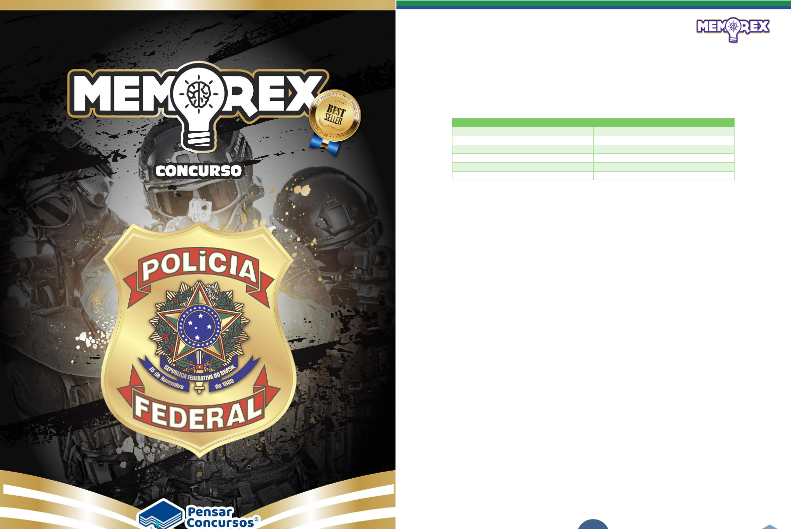 <p>Memorex PF (Agente) - Rodada 02</p><p>1</p><p>Licensed to Julia caruna mendes da silva - juliacaruna@gmail.com - 018.461.483-08</p><p>Memorex PF (Agente) - Rodada 02</p><p>2</p><p>Parabéns por ter dado esse passo importante na sua preparação, meu amigo(a). Temos</p><p>TOTAL certeza de que este material vai te fazer ganhar muitas questões e garantir a sua</p><p>aprovação.</p><p>Você está tendo acesso agora à Rodada 02. As outras 04 rodadas serão disponibilizadas</p><p>na sua área de membros conforme o cronograma abaixo:</p><p>Material Data</p><p>Rodada 01 Disponível Imediatamente</p><p>Rodada 02 Disponível Imediatamente</p><p>Rodada 03 16/02</p><p>Rodada 04 23/02</p><p>Rodada 05 02/03</p><p>Rodada 06 09/03</p><p>Convém mencionar que todos que adquirirem o material completo irão receber TODAS AS</p><p>RODADAS já disponíveis, independente da data de compra.</p><p>Nesse material focamos também nos temas mais simples e com mais DECOREBA, pois,</p><p>muitas vezes, os deixamos de lado e isso pode, infelizmente, custar inúmeras posições no</p><p>resultado final.</p><p>Lembre-se: uma boa revisão é o segredo da APROVAÇÃO.</p><p>Portanto, utilize o nosso material com todo o seu esforço, estudando e aprofundando cada</p><p>uma das dicas.</p><p>Se houver qualquer dúvida, você pode entrar em contato conosco enviando suas dúvidas</p><p>para: atendimento@pensarconcursos.com</p><p>Licensed to Julia caruna mendes da silva - juliacaruna@gmail.com - 018.461.483-08</p><p>Memorex PF (Agente) - Rodada 02</p><p>3</p><p>ÍNDICE</p><p>LÍNGUA PORTUGUESA ..................................................................................................... 4</p><p>CONTABILIDADE GERAL ............................................................................................... 14</p><p>ESTATÍSTICA ....................................................................................................................... 18</p><p>LEGISLAÇÃO ESPECIAL ................................................................................................. 20</p><p>NOÇÕES DE DIREITO ADMINISTRATIVO ........................................................... 28</p><p>NOÇÕES DE DIREITO CONSTITUCIONAL ............................................................ 37</p><p>NOÇÕES DE DIREITO PENAL ...................................................................................... 46</p><p>NOÇÕES DE DIREITO PROCESSUAL PENAL ....................................................... 54</p><p>RACIOCÍNIO LÓGICO ..................................................................................................... 61</p><p>INFORMÁTICA .................................................................................................................... 63</p><p>Licensed to Julia caruna mendes da silva - juliacaruna@gmail.com - 018.461.483-08</p><p>Memorex PF (Agente) - Rodada 02</p><p>4</p><p>LÍNGUA PORTUGUESA</p><p>DICA 01</p><p>*Derivados de TER/VIR → recebem acento agudo no singular e circunflexo no plural:</p><p>Ele detém Ele obtém Ele intervém</p><p>Eles detêm Eles obtêm Eles intervêm</p><p>*crer, dar, ler, ver e derivados perderam o acento gráfico no plural:</p><p>Ele crê Ele vê</p><p>Eles creem Eles veem</p><p>DICA 02</p><p>ALGUNS CASOS - USO DO HÍFEN</p><p>1. Prefixo + vogal idêntica → COM HÍFEN. Ex.: anti-inflamatório, micro-ondas.</p><p>2. Prefixo + vogal distinta → JUNTO. Ex.: autoestima, antiaéreo.</p><p>3. CO/RE + vogal idêntica ou distinta → JUNTO. Ex.: coexistência, coordenar, reavaliar,</p><p>reescrever.</p><p>4. SUPER</p><p>HIPER H/R → COM HÍFEN. Ex.: Inter-racial, Super-Homem.</p><p>INTER</p><p>5. CONTRA H/A → COM HÍFEN. Ex.: Contra-ataque.</p><p>6. SUB/SOB + H/B/R → COM HÍFEN. Ex.: sob-roda, sub-reino.</p><p>7. RECÉM</p><p>AQUÉM SEMPRE COM HÍFEN! Ex.: recém-casado, além-mar.</p><p>ALÉM</p><p>BEM</p><p>8. PREFIXO + RADICAL INICIADO POR R → DUPLICA-SE O R! Ex.: corréu,</p><p>contrarrazões.</p><p>9. PREFIXO + RADICAL INICIADO POR S → DUPLICA-SE O S! Ex.: ultrassom, minissaia.</p><p>10. CIRCUM/PAN + VOGAL, M ou N → COM HÍFEN! Ex.: pan-americano, circum-navegação.</p><p>11. Dias da semana e espécies de animais e plantas MANTIVERAM O HÍFEN. Ex.: bem-</p><p>me-quer, bem-te-vi, segunda-feira.</p><p>Licensed to Julia caruna mendes da silva - juliacaruna@gmail.com - 018.461.483-08</p><p>Memorex PF (Agente) - Rodada 02</p><p>5</p><p>DICA 03</p><p>ATENÇÃO! Se a palavra seguinte começar COM R OU S, terá que DOBRAR A LETRA e</p><p>NÃO COLOCAR HÍFEN!</p><p>Ex.: autorretrato, autossuficiente, antissocial...</p><p>DICA 04</p><p>SUBSTANTIVO NOMEIAM lugares, objetos, pessoas,</p><p>animais, ações, estados ou qualidades</p><p>tomadas como seres (ex.: bondade,</p><p>feiura).</p><p>ADJETIVOS</p><p>MODIFICA o substantivo. Exprime modo</p><p>de ser, aparência ou qualidade.</p><p>ARTIGOS</p><p>DETERMINA OU GENERALIZA o</p><p>substantivo. Indicando-lhe o gênero e o</p><p>número.</p><p>NUMERAIS</p><p>ENUMERAM, ordenam as coisas.</p><p>PRONOMES</p><p>ACOMPANHAM ou SUBSTITUEM os</p><p>nomes.</p><p>VERBOS</p><p>Expressam AÇÃO, ESTADOS OU</p><p>FENÔMENOS.</p><p>ADVÉRVIOS</p><p>MODIFICAM verbos, adjetivos ou outros</p><p>advérbios.</p><p>PALAVRAS DENOTATIVAS</p><p>ALTERAM o sentido de uma outra palavra</p><p>ou da oração.</p><p>PREPOSIÇÕES</p><p>LIGAM dois termos da oração,</p><p>subordinando-os. É palavra INVARIÁVEL.</p><p>CONJUNÇÕES</p><p>UNEM termos de uma oração ou orações.</p><p>É palavra INVARIÁVEL. Podem ser</p><p>coordenativas ou subordinativas.</p><p>INTERJEIÇÕES</p><p>EXPRIMEM emoção, sensação, estado de</p><p>espírito. É palavra INVARIÁVEL. Ex.:</p><p>Viva! Uau! Nossa! (“frases resumidas”)</p><p>Licensed to Julia caruna mendes da silva - juliacaruna@gmail.com - 018.461.483-08</p><p>Memorex PF (Agente) - Rodada 02</p><p>6</p><p>DICA 05</p><p>ADVERBIALIZAÇÃO DO ADJETIVO</p><p>- Nada mais é do que tornar um ad