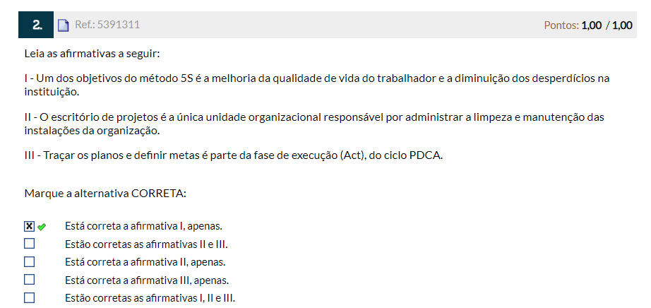 <p>2. Ref.: 5391311 Pontos Leia as afirmativas a seguir: I - Um dos objetivos do método 5S é a melhoria da qualidade de vida do trabalhador e a diminuição dos desperdícios na instituição. II - escritório de projetos é a unidade organizacional responsável por administrar a limpeza e manutenção das instalações da organização. III - Traçar os planos e definir metas é parte da fase de execução (Act), do ciclo PDCA. Marque a alternativa CORRETA: Está correta a afirmativa apenas. Estão corretas as afirmativas II e III. Está correta a afirmativa apenas. correta a afirmativa III. apenas. Estão corretas as afirmativas II e III.</p>