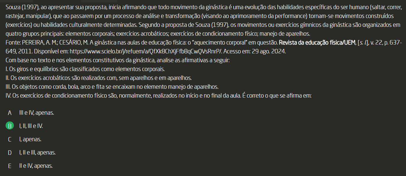 <p>Souza (1997), ao apresentar sua proposta, inicia afirmando que todo movimento da ginástica é uma evolução das habilidades específicas do ser humano (saltar, correr, rastejar, manipular), que ao passarem por um processo de análise e transformação (visando ao aprimoramento da performance) tornam-se movimentos construídos (exercícios) ou habilidades culturalmente determinadas. Segundo a proposta de Souza (1997), os movimentos ou exercícios gímnicos da ginástica são organizados em quatro grupos principais: elementos corporais; exercícios acrobáticos; exercícios de condicionamento físico; manejo de aparelhos. Fonte: PEREIRA, A. M.; CESÁRIO, M. A ginástica nas aulas de educação física: "aquecimento corporal" em questão. Revista da educação física/UEM, V. 22, 637- 649, 2011. Disponível em: em: 29 ago. 2024. Com base no texto e nos elementos constitutivos da ginástica, analise as afirmativas a I. Os giros e equilíbrios são classificados como elementos corporais. II. Os exercícios acrobáticos são realizados com, sem aparelhos e em aparelhos. III. Os objetos como corda, bola, arco e fita se encaixam no elemento manejo de aparelhos. IV. Os exercícios de condicionamento físico são, normalmente, realizados no início e no final da aula. É correto que se afirma em: A III e IV, apenas. B I, II, III e IV. C I, apenas. D E e IV, apenas.</p>