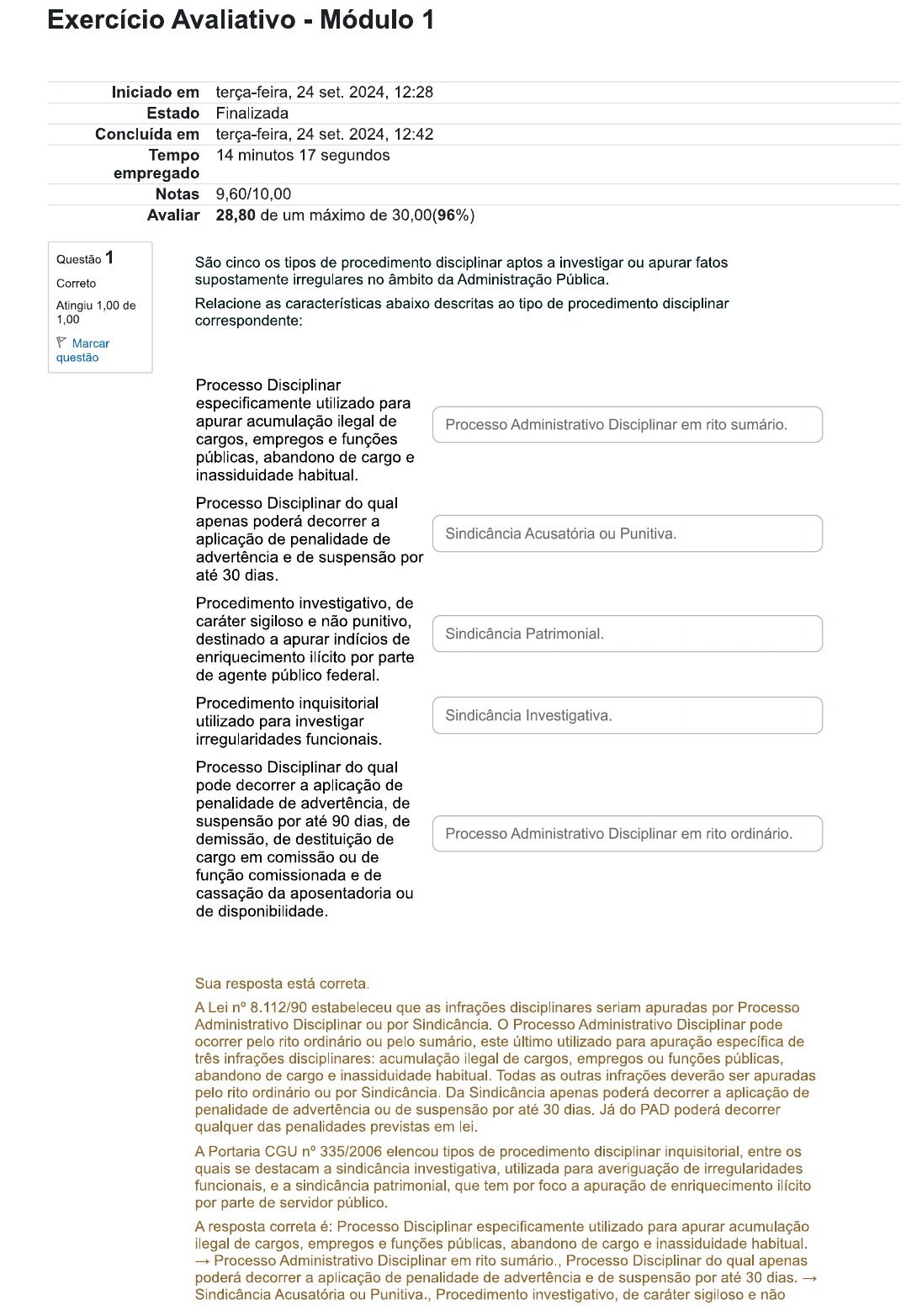 <p>Exercício Avaliativo Módulo 1 Iniciado em terça-feira, 24 set. 2024, 12:28 Estado Finalizada Concluída em terça-feira, 24 set. 2024, 12:42 Tempo 14 minutos 17 segundos empregado Notas 9,60/10,00 Avaliar 28,80 de um máximo de 30,00(96%) Questão 1 São cinco os tipos de procedimento disciplinar aptos a investigar ou apurar fatos Correto supostamente irregulares no âmbito da Administração Pública. Atingiu 1,00 de Relacione as características abaixo descritas ao tipo de procedimento disciplinar 1,00 correspondente: Marcar questão Processo Disciplinar especificamente utilizado para apurar acumulação ilegal de Processo Administrativo Disciplinar em rito sumário. cargos, empregos e funções públicas, abandono de cargo e inassiduidade habitual. Processo Disciplinar do qual apenas poderá decorrer a aplicação de penalidade de Sindicância Acusatória ou Punitiva. advertência e de suspensão por até 30 Procedimento investigativo, de caráter sigiloso e não punitivo, destinado a apurar indícios de Sindicância Patrimonial. enriquecimento ilícito por parte de agente público federal. Procedimento inquisitorial utilizado para investigar Sindicância Investigativa. irregularidades funcionais. Processo Disciplinar do qual pode decorrer a aplicação de penalidade de advertência, de suspensão por até 90 dias, de demissão, de destituição de Processo Administrativo Disciplinar em rito ordinário. cargo em comissão ou de função comissionada e de cassação da aposentadoria ou de disponibilidade. Sua resposta está correta. A Lei n° 8.112/90 estabeleceu que as infrações disciplinares seriam apuradas por Processo Administrativo Disciplinar ou por Sindicância. Processo Administrativo Disciplinar pode ocorrer pelo rito ordinário ou pelo sumário, este último utilizado para apuração específica de três infrações disciplinares: acumulação ilegal de cargos, empregos ou funções públicas, abandono de cargo e inassiduidade habitual. Todas as outras infrações deverão ser apuradas pelo rito ordinário ou por Sindicância. Da Sindicância apenas poderá decorrer a aplicação de penalidade de advertência ou de suspensão por até 30 dias. Já do PAD poderá decorrer qualquer das penalidades previstas em lei. A Portaria CGU n° 335/2006 elencou tipos de procedimento disciplinar inquisitorial, entre os quais se destacam a sindicância investigativa, utilizada para averiguação de irregularidades funcionais, e a sindicância patrimonial, que tem por foco a apuração de enriquecimento ilícito por parte de servidor público. A resposta correta é: Processo Disciplinar especificamente utilizado para apurar acumulação ilegal de cargos, empregos e funções públicas, abandono de cargo e inassiduidade habitual. Processo Administrativo Disciplinar em rito Processo Disciplinar do qual apenas poderá decorrer a aplicação de penalidade de advertência e de suspensão por até 30 dias. Sindicância Acusatória ou Punitiva., Procedimento investigativo, de caráter sigiloso e não</p><p>punitivo, destinado a apurar indícios de enriquecimento ilícito por parte de agente público federal. Sindicância Procedimento inquisitorial utilizado para investigar irregularidades funcionais. Sindicância Investigativa., Processo Disciplinar do qual pode decorrer a aplicação de penalidade de advertência, de suspensão por até 90 dias, de demissão, de destituição de cargo em comissão ou de função comissionada e de cassação da aposentadoria ou de disponibilidade. Processo Administrativo Disciplinar em rito Questão 2 Assinale a alternativa correta: Correto Atingiu 1,00 de Escolha uma opção: 1,00 a. Empregado público pode ser acusado ou sindicado em processo punitivo, nos termos Marcar da Lei n° 8.112/90. questão b. Servidor público federal em estágio probatório não pode ser acusado ou sindicado em processo punitivo. C. Secretário Executivo de ministério não pode ser acusado ou sindicado em processos punitivos. d. Servidor público federal Conforme os arts. 2° e 3° da Lei 8.112/90, os ocupante exclusivamente servidores públicos federais ocupantes de cargo em comissão exclusivamente de cargo em comissão se pode ser acusado ou submetem ao Estatuto dos Servidores Públicos sindicado em processo Civis, podendo responder a processo disciplinar. punitivo. Sua resposta está correta. Conforme os arts. 2° e 3° da Lei n° podem ser acusados ou sindicados em processos punitivos os servidores públicos federais ocupantes de cargo efetivo (em estágio probatório ou estáveis) e os ocupantes de cargo em Não podem figurar como acusados ou sindicados em processos punitivos os agentes políticos, integrantes da alta Administração federal, cujo poder advém da própria Constituição federal (Chefe do Poder Executivo, Ministros e Estado, membros do Poder Legislativo, do Judiciário, do Ministério Público e do Tribunal de Contas). A resposta correta é: Servidor público federal ocupante exclusivamente de cargo em comissão pode ser acusado ou sindicado em processo punitivo. Questão 3 Julgue a seguinte afirmação: Correto Servidor público federal no gozo de licença pode ser acusado ou sindicado em processos Atingiu 1,00 de punitivos. 1,00 Marcar questão Escolha uma opção: Verdadeiro Falso Muito bem! A afirmativa é verdadeira. gozo de licença não impede a instauração e o andamento do processo punitivo, podendo o servidor exercer o seu direito ao contraditório e à ampla defesa normalmente. Regra geral, o gozo de licença pelo servidor público não impede o regular andamento do processo punitivo, podendo o servidor exercer seu direito ao contraditório e à ampla defesa. Exceção ocorre quando a licença se der em razão de doença mental incapacitante, que inviabilize o exercício do contraditório e da ampla defesa. Nesse sentido é o entendimento expresso no Enunciado CGU 12. A resposta correta é Questão 4 Vários são os princípios que orientam o 