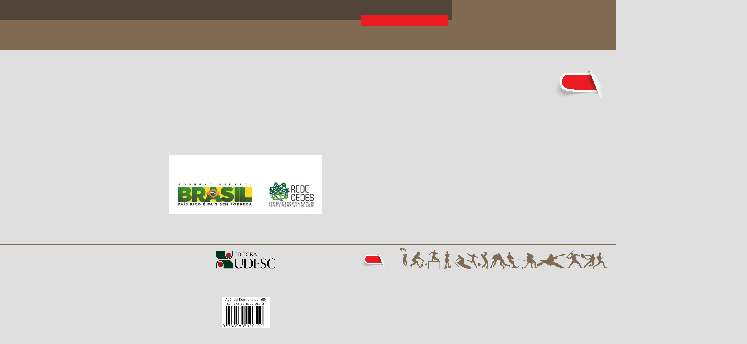 <p>Este livro agrega discussões de diferentes</p><p>autores, os quais levantam</p><p>questionamentos e trazer reflexões sobre</p><p>possibilidades no universo dos legados</p><p>do esporte, nos segmentos da educação,</p><p>do lazer e da inclusão social. Mesmo</p><p>diante das diferentes abordagens</p><p>trabalhadas nos capítulos, pode-se</p><p>observar a sintonia entre as propostas,</p><p>complementando-se e transcendendo-se.</p><p>A temática que envolve os legados do</p><p>esporte no Brasil, a cada dia, torna-se</p><p>alvo de interesse de distintos setores da</p><p>sociedade, com os mais diversos</p><p>objetivos. Portanto, uma das</p><p>responsabilidades deste livro é promover</p><p>conhecimento sobre este amplo</p><p>fenômeno de interesse crescente,</p><p>especialmente, devido ao momento</p><p>histórico esportivo brasileiro.</p><p>O livro traz importantes reflexões - para</p><p>estudantes, professores e profissionais</p><p>de diferentes áreas - sobre problemáticas</p><p>e perspectivas, abordando, com</p><p>diferentes olhares, o atual interesse</p><p>pelas ressonâncias de iniciativas</p><p>esportivas no âmbito nacional.</p><p>5</p><p>5</p><p>Temas em Movimento</p><p>LEGADOS</p><p>DO ESPORTE</p><p>BRASILEIRO</p><p>LE</p><p>G</p><p>A</p><p>D</p><p>O</p><p>S</p><p>D</p><p>O</p><p>E</p><p>SP</p><p>O</p><p>R</p><p>T</p><p>E</p><p>B</p><p>R</p><p>A</p><p>SI</p><p>LE</p><p>IR</p><p>O</p><p>C o l e ç ã o</p><p>Organizadores</p><p>ALCYANE MARINHO</p><p>JUAREZ VIEIRA DO NASCIMENTO</p><p>AMAURI APARECIDO BÁSSOLI OLIVEIRAO</p><p>rg</p><p>an</p><p>iz</p><p>ad</p><p>or</p><p>es</p><p>AL</p><p>CY</p><p>AN</p><p>E M</p><p>AR</p><p>IN</p><p>HO</p><p>JU</p><p>AR</p><p>EZ</p><p>V</p><p>IE</p><p>IR</p><p>A</p><p>DO</p><p>N</p><p>AS</p><p>CI</p><p>M</p><p>EN</p><p>TO</p><p>AM</p><p>AU</p><p>RI</p><p>A</p><p>PA</p><p>RE</p><p>CI</p><p>DO</p><p>B</p><p>ÁS</p><p>SO</p><p>LI</p><p>O</p><p>LI</p><p>VE</p><p>IR</p><p>A</p><p>Apoio</p><p>Ministério do Esporte</p><p>Secretaria Nacional de Esporte, Educação, Lazer e inclusão Social</p><p>LEGADOS</p><p>DO ESPORTE</p><p>BRASILEIRO</p><p>C O L E Ç Ã O T E M A S E M M O V I M E N T O</p><p>Apoio</p><p>Ministério do Esporte</p><p>Secretaria Nacional de Esporte, Educação, Lazer e inclusão Social</p><p>Antonio Heronaldo de Sousa</p><p>Reitor</p><p>Marcus Tomasi</p><p>Vice-Reitor</p><p>Alexandre Amorim dos Reis</p><p>Pró-Reitor de Pesquisa e Pós-Graduação</p><p>Mayco Morais Nunes</p><p>Pró-Reitor de Extensão, Cultura e Comunidade</p><p>Amauri Bogo</p><p>Coordenador Editora da UDESC</p><p>Darlan Laurício Matte</p><p>Diretor Geral</p><p>Centro de Ciências da Saúde e do Esporte</p><p>Alexandro Andrade</p><p>Diretor de Pesquisa e Pós-Graduação</p><p>Centro de Ciências da Saúde e do Esporte</p><p>Mario César Nascimento</p><p>Diretor de Extensão</p><p>Centro de Ciências da Saúde e do Esporte</p><p>Suzana Matheus Pereira</p><p>Departamento de Educação Física</p><p>Centro de Ciências da Saúde e do Esporte</p><p>Florianópolis</p><p>2014</p><p>Volume 5</p><p>Alcyane Marinho</p><p>Juarez Vieira do Nascimento</p><p>Amauri Aparecido Bássoli Oliveira</p><p>Organizadores</p><p>C O L E Ç Ã O T E M A S E M M O V I M E N T O</p><p>LEGADOS</p><p>DO ESPORTE</p><p>BRASILEIRO</p><p>A Coleção Temas em Movimento é uma publicação da Editora da UDESC,</p><p>composta por um conselho editorial interinstitucional, que objetiva divulgar</p><p>as pesquisas realizadas sob diferentes perspectivas na área de Educação Física</p><p>e Esportes, para aprofundar aspectos conceituais e metodológicos da profis-</p><p>são, bem como contribuir para a aproximação entre a comunidade científica e</p><p>à prática pedagógica em diferentes contextos de intervenção.</p><p>Conselho Editorial</p><p>Adriana Coutinho Azevedo Guimarães - UDESC</p><p>Christi Noriko Sonoo – UEM</p><p>Flávio Medeiros Pereira – UFPEL</p><p>Joice Mara Facco Stefanello – UFPR</p><p>Luiz Sérgio Peres - UNIOSTE</p><p>Marcos Augusto Rocha - UEL</p><p>Viktor Shigunov – UFSC</p><p>Zenite Machado - UDESC</p><p>Edição revisada segundo o Acordo Ortográfico da Língua Portuguesa de 16 de</p><p>dezembro de 1990.</p><p>Projeto gráfico, diagramação e capa</p><p>Editora Tribo da Ilha e Gráfica e Editora Copiart</p><p>R329</p><p>Legados do Esporte brasileiro / Alcyane Marinho;</p><p>Juarez Vieira do Nascimento; Amauri Aparecido</p><p>Bássoli Oliveira (Org.) – Florianópolis: Ed.</p><p>da UDESC, 2014.</p><p>560 p.: il.; 21 cm -- (Temas em Movimento).</p><p>ISBN: 978-85-8302-010-3</p><p>Inclui Bibliografia</p><p>1. Esporte - Brasil. 2. Educação e Lazer. 3.</p><p>Inclusão social I. Marinho, Alcyane. II.</p><p>Nascimento, Juarez Vieira do Nascimento. III.</p><p>Oliveira, Amauri Aparecido Bássoli. IV. Título.</p><p>V. Série.</p><p>CDD: 796.0981 - 22.ed.</p><p>CDD: 372.83 – 20.ed.</p><p>Ficha catalográfica elaborada pela Biblioteca Central da UDESC</p><p>5</p><p>Apresentação</p><p>A preocupação em refletir sobre os “Lega-</p><p>dos do Esporte Brasileiro”, com ênfase no es-</p><p>porte educacional, de lazer e de inclusão social,</p><p>legitima estudos e intervenções que vêm sen-</p><p>do realizados, por diferentes atores sociais, em</p><p>distintas instituições de ensino superior, em</p><p>várias regiões do país. Além da adoção de con-</p><p>cepção ampliada de legado que reconhece a sua</p><p>complexidade e dimensionalidade, abrangendo</p><p>tanto aspectos econômicos, sociais, culturais</p><p>e ambientais como também possíveis impac-</p><p>tos positivos e negativos, este livro se propõe</p><p>a contribuir com a reflexão acerca de impor-</p><p>tantes ações e boas práticas sobre o esporte no</p><p>Brasil, com ênfase naquelas voltadas à educa-</p><p>ção, ao lazer e à inclusão social.</p><p>Ao vislumbrar a realização de reflexões</p><p>acerca do esporte brasileiro, a presente obra</p><p>procura, necessariamente, relacioná-lo ao</p><